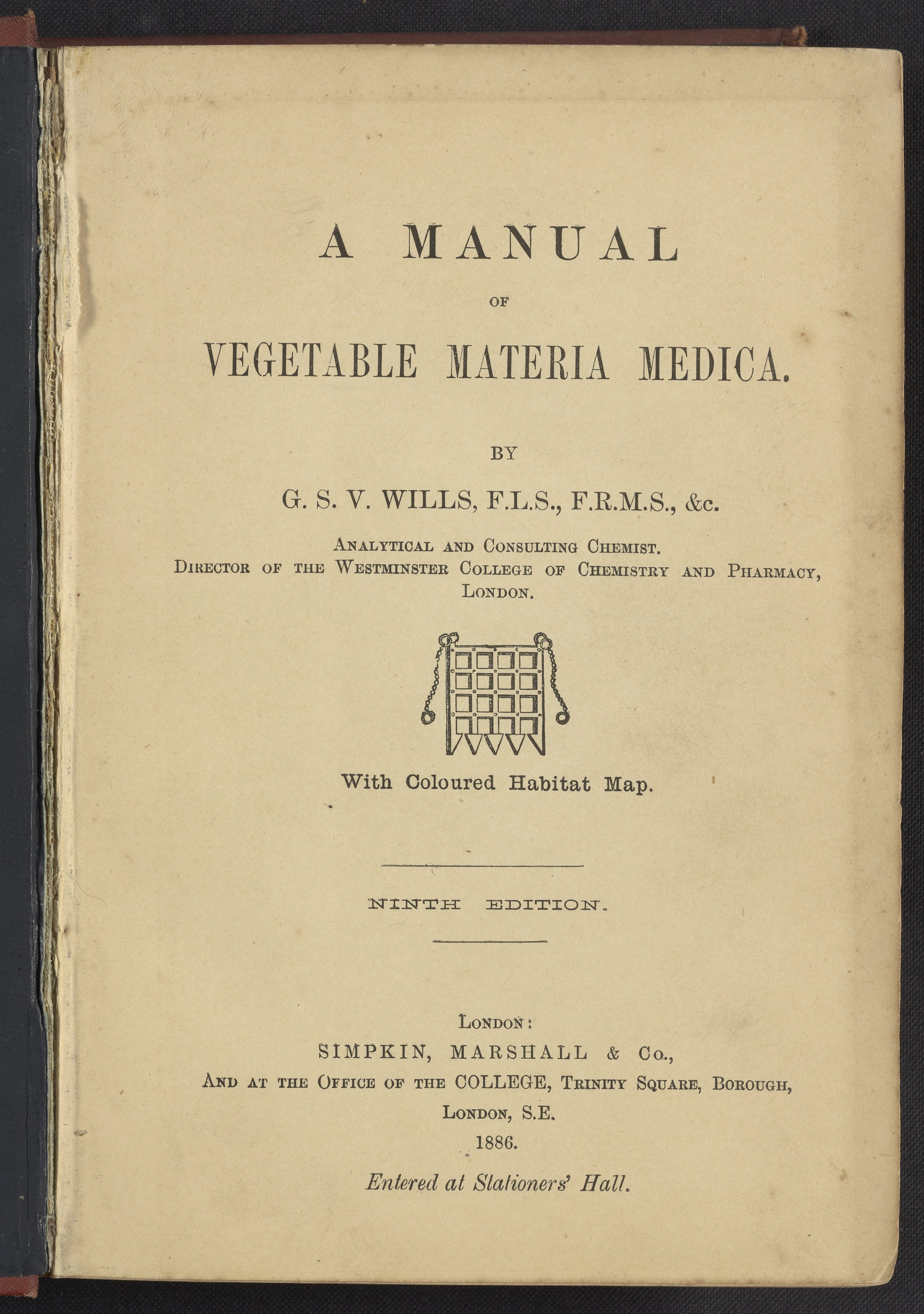 Wills, George S. V. “A Manual of Vegetable Materia Medica.” London, England: Marshall Simpkin, 1886. https://digital.sciencehistory.org/works/9593tw10r.