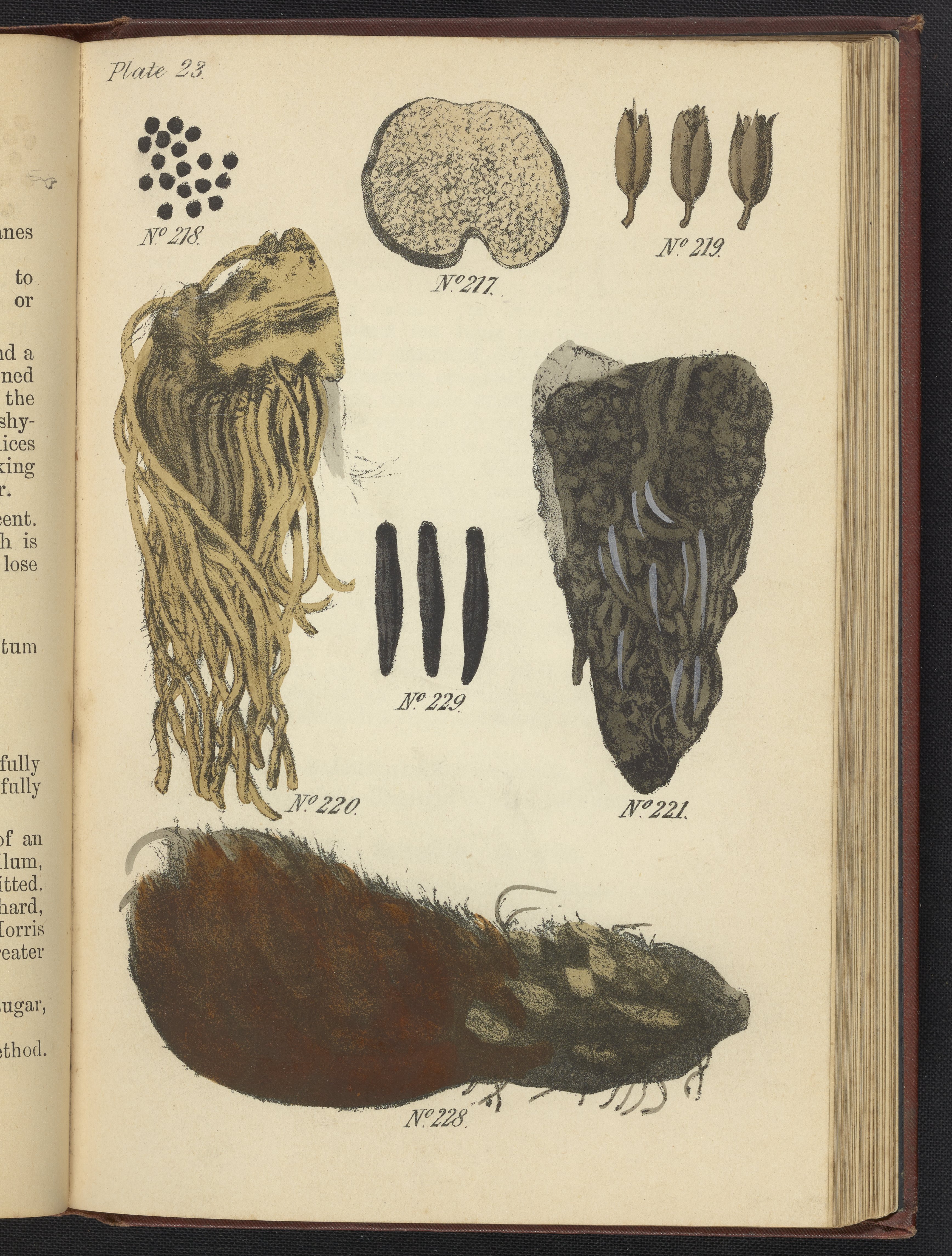 This manual identifies plants used for medicinal purposes. The focus is on plants that can be acquired through commerce in Britain and are illustrated as they would have been imported and bought, for example the opium is illustrated as a processed capsule wrapped in a poppy leaf instead of the poppy plant itself.