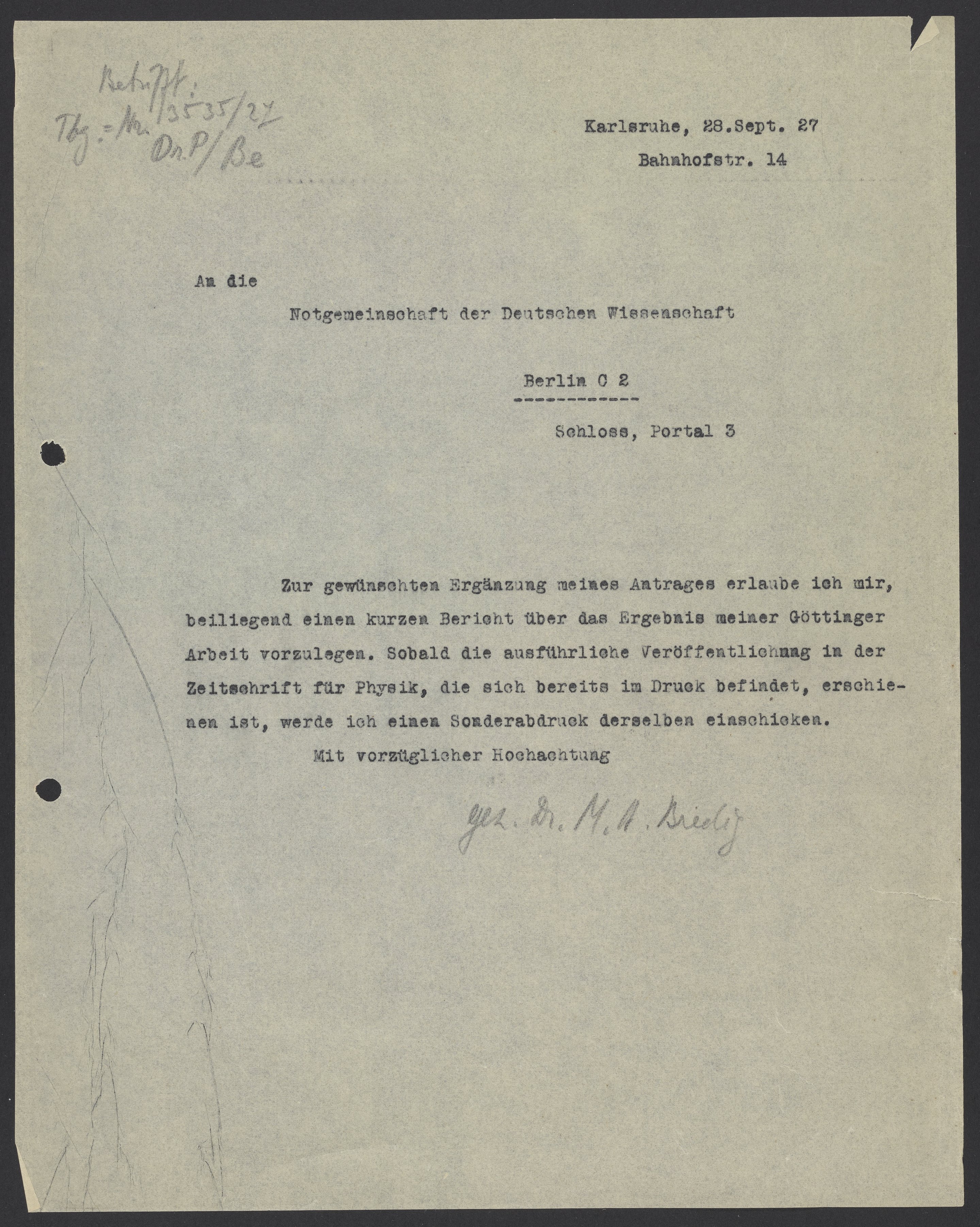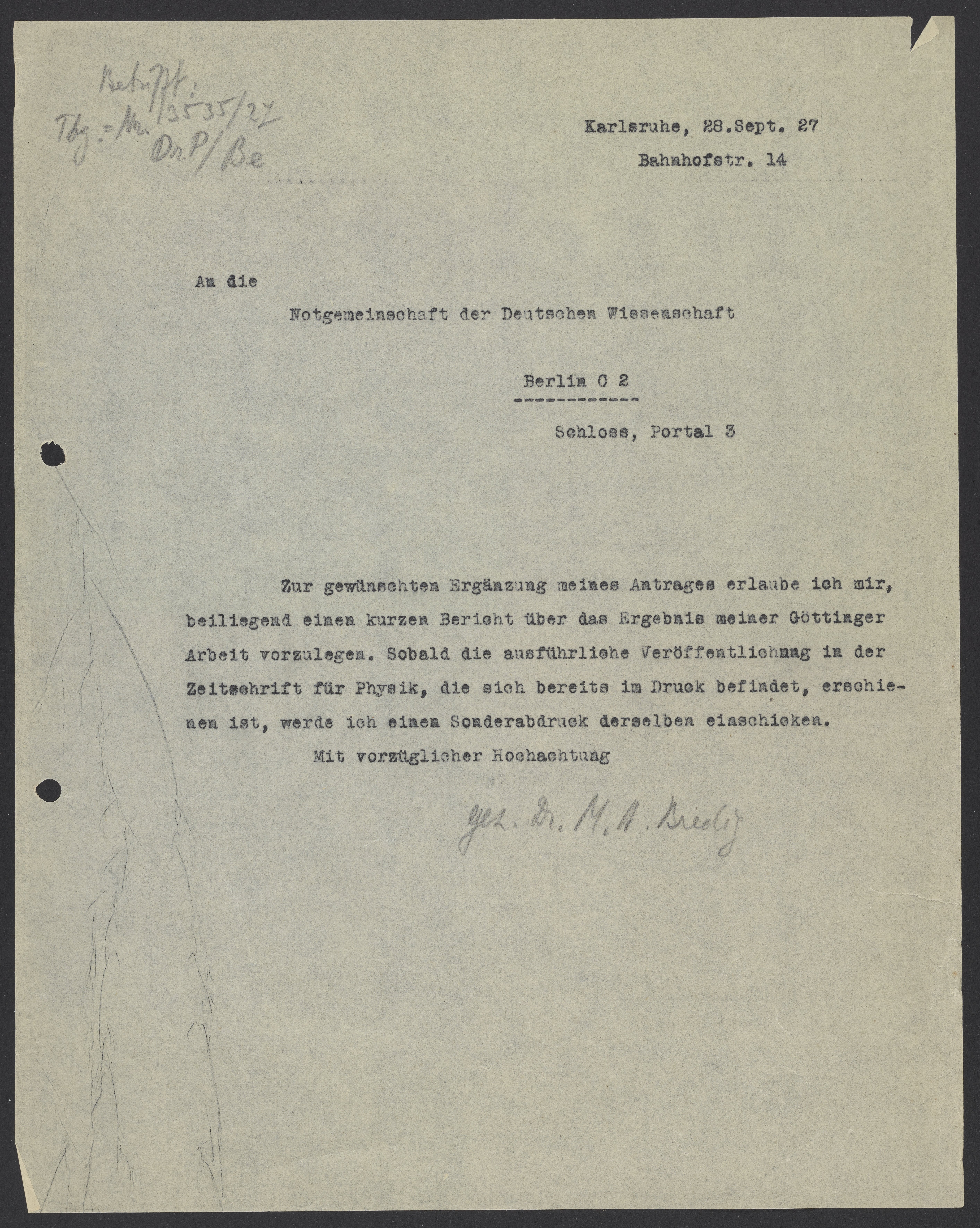 Letter from Max Bredig to the Funding Agency "Notgemeinschaft der Deutschen Wissenschaft", September 1927