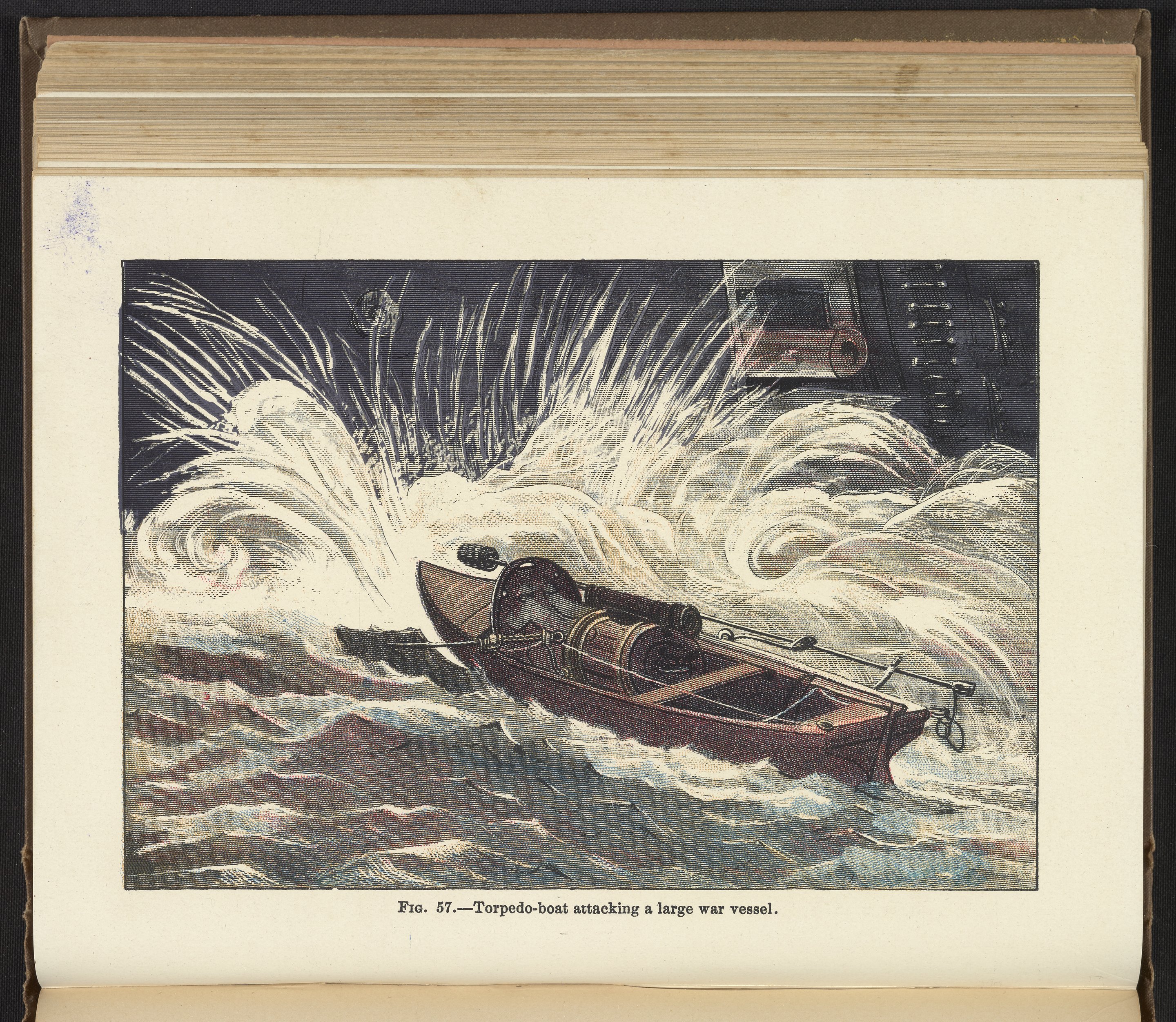 Color plate depicts a torpedo boat attacking a large war vessel. Accompanying text mentions how a quick-moving torpedo boat can position the torpedo device in close proximity of the enemy war ship and withdrawal in time to avoid the impending explosion.