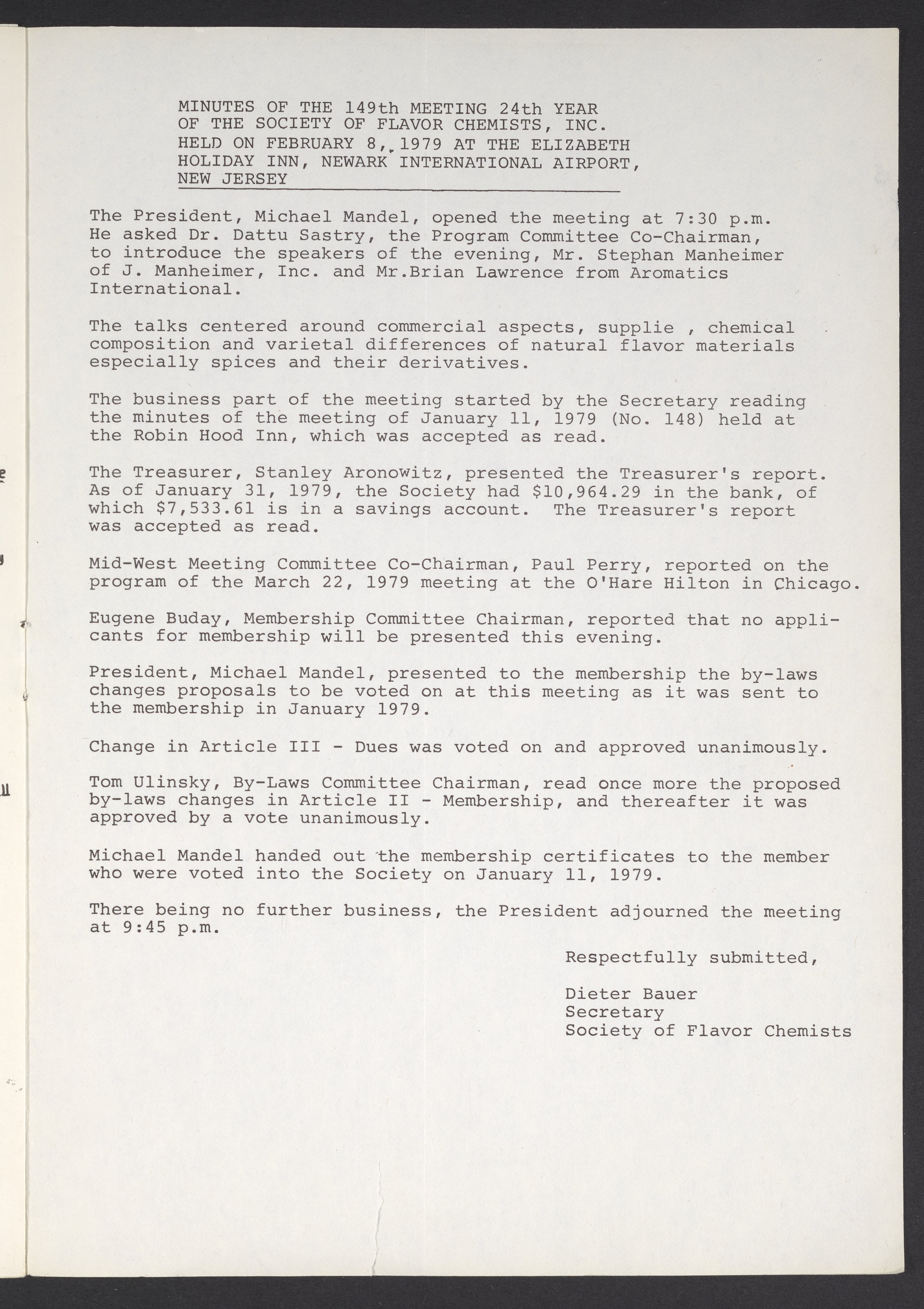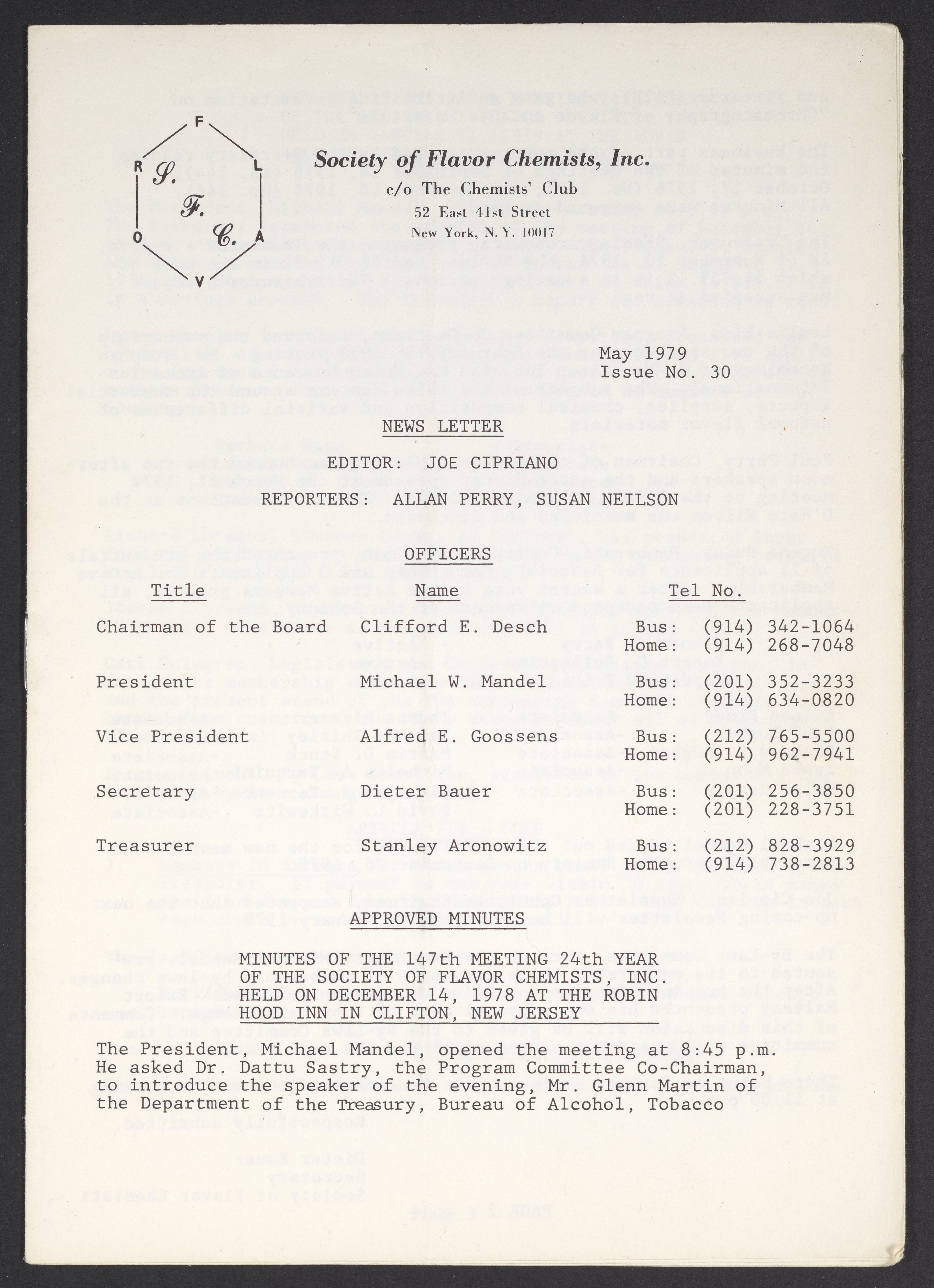 Society of Flavor Chemists. “Society of Flavor Chemists Newsletter, May 1979,” May 1979. Society of Flavor Chemists Newsletters and Certificate of Incorporation, Box 1, Folder 1. Science History Institute. Philadelphia. https://digital.sciencehistory.org/works/97jbpxs.