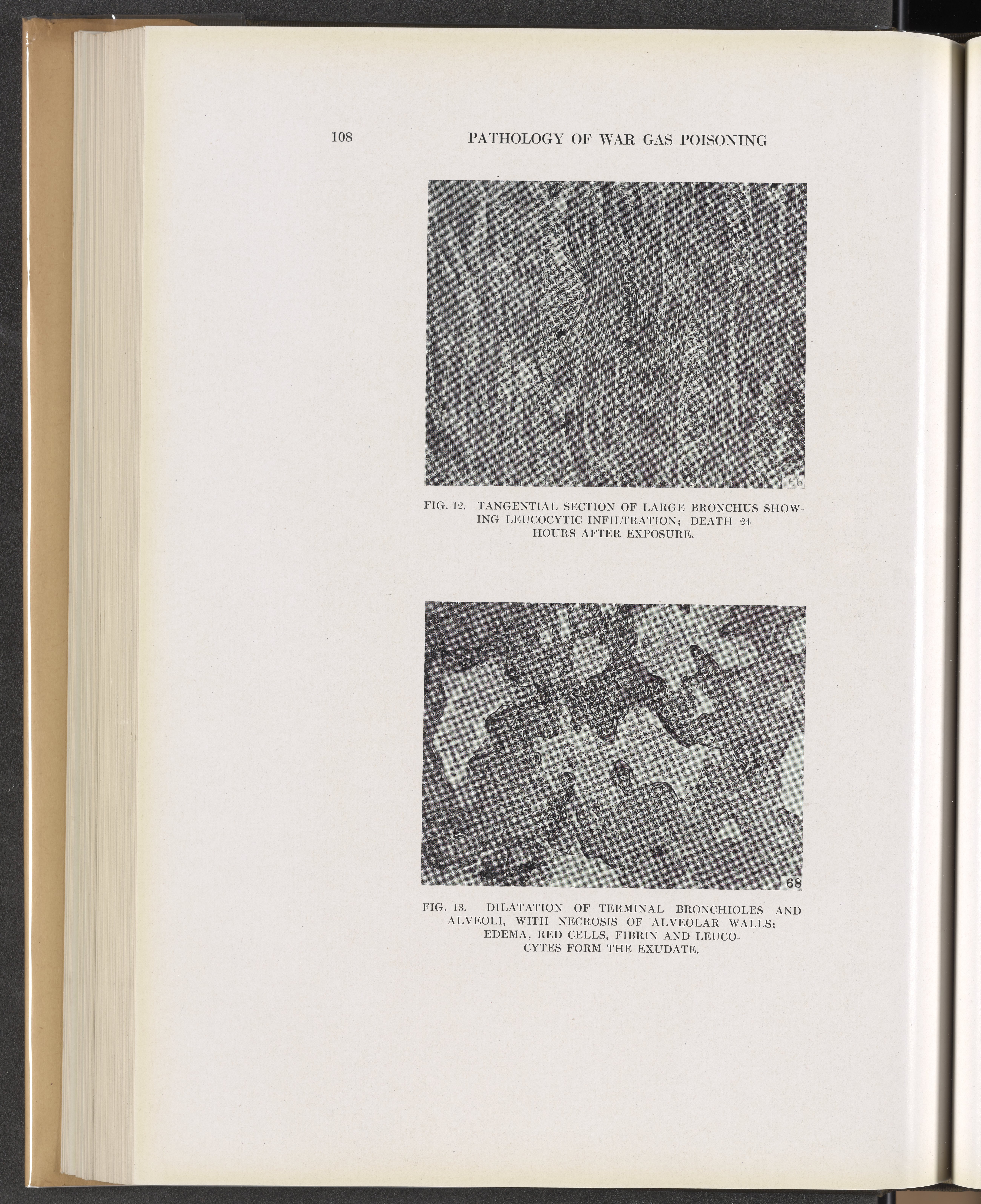 Fig. 12: Tangential section of large bronchus showing leucocytic infiltration; death 24 hours after exposure. Fig. 13: Dilatation of terminal bronchioles and alveoli, with necrosis of alveolar walls; edema, red cells, fibrin, and leucocytes form the exudate.