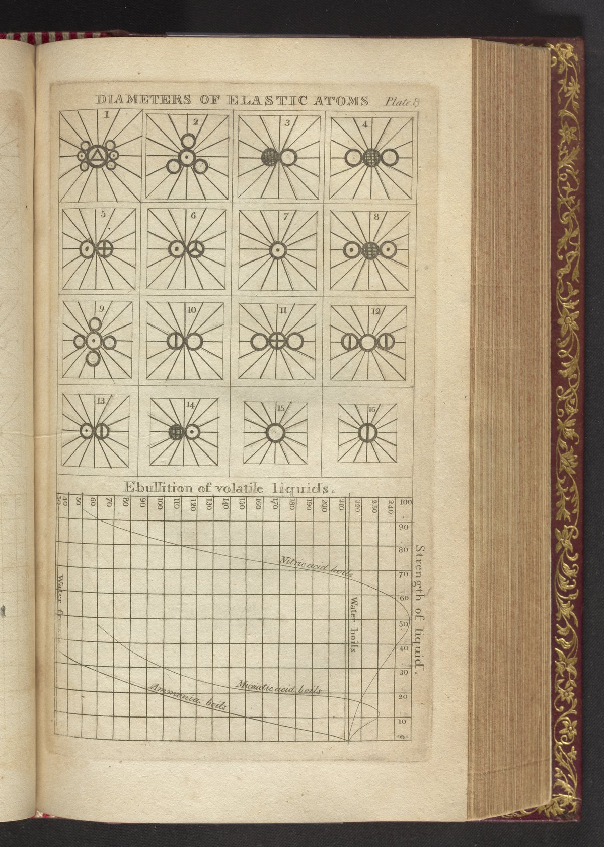 Dalton, John. “Plate 8: Diameters of Elastic Atoms; Ebullition of Volatile Liquids.” In A New System of Chemical Philosophy. Manchester, England: Russell & Allen, 1810. https://digital.sciencehistory.org/works/9880vr66n.