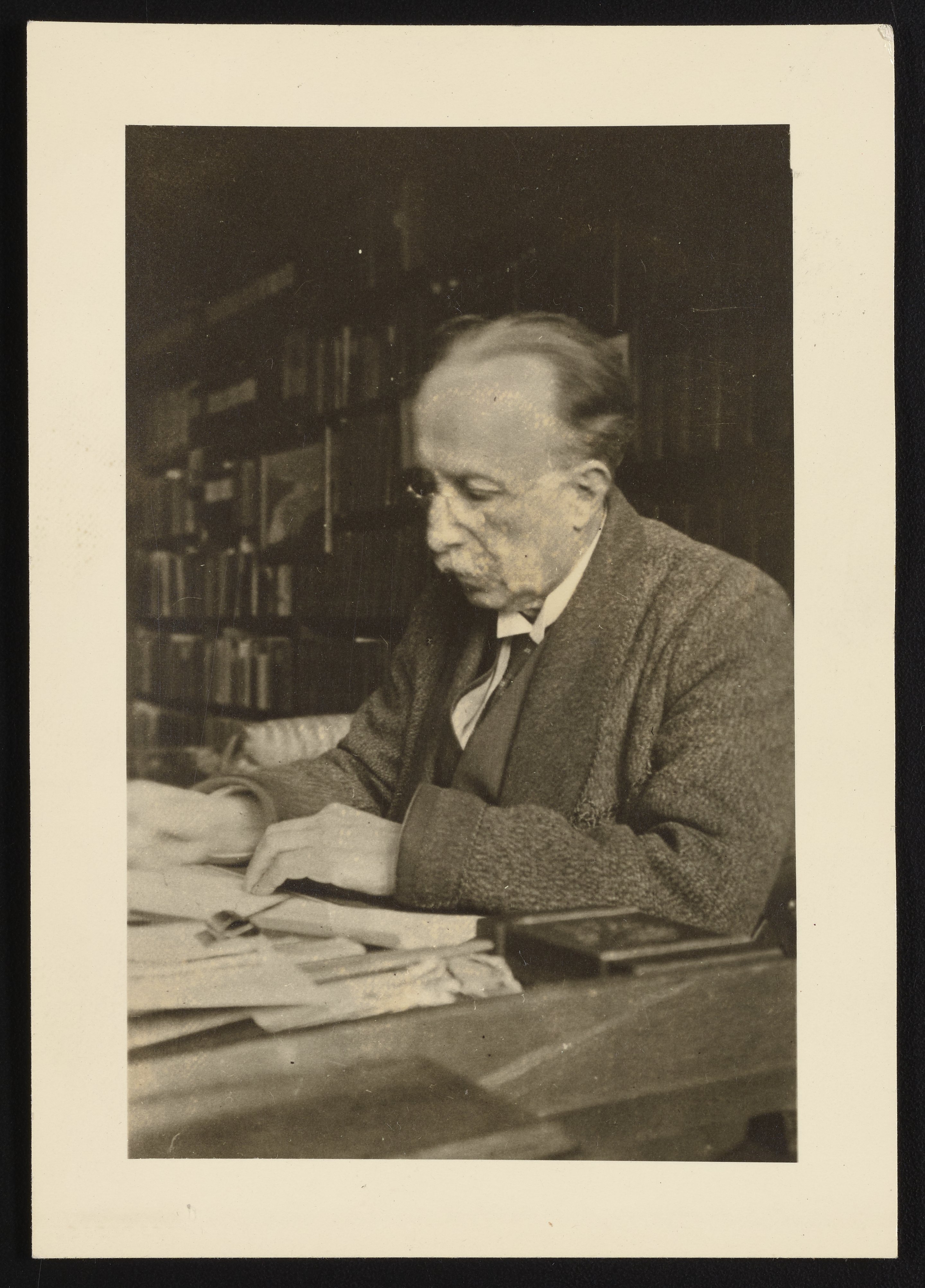 Photograph of Georg Bredig (1868-1944) seated at a desk in a library or study, regarding the book and scattered papers in front of him.
