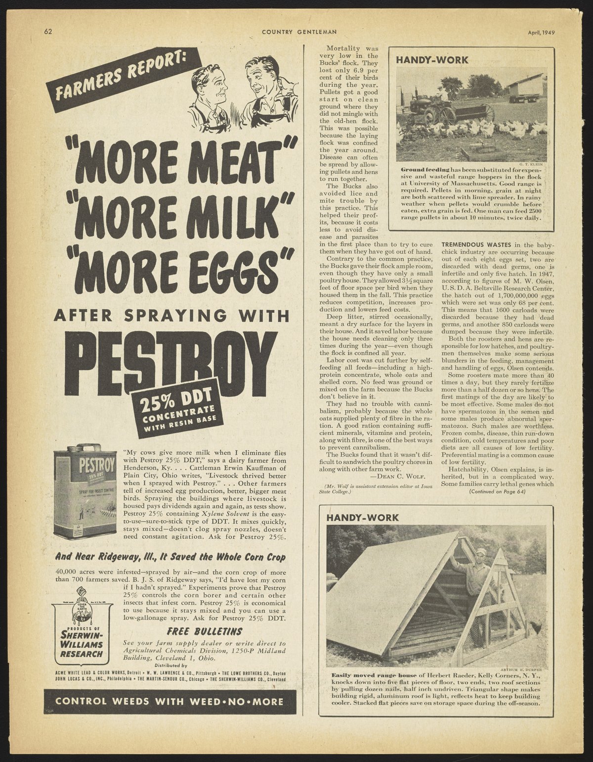 “Farmers Report: More Meat, More Milk, More Eggs after Spraying with Pestroy,” 1949. Science History Institute. Philadelphia. https://digital.sciencehistory.org/works/9c67wn01b.
