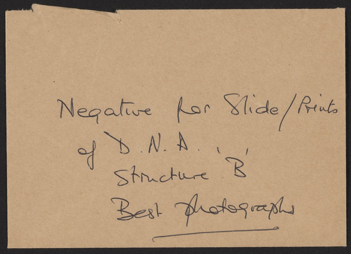 Franklin, Rosalind. “Envelope Labeled ‘Negative for Slide. Prints of D.N.A. Structure 'B' Best Photographs,’” 1952. History of Molecular Biology Collection, Box 10, Folder 17. Science History Institute. Philadelphia. https://digital.sciencehistory.org/works/9d2e0ck.