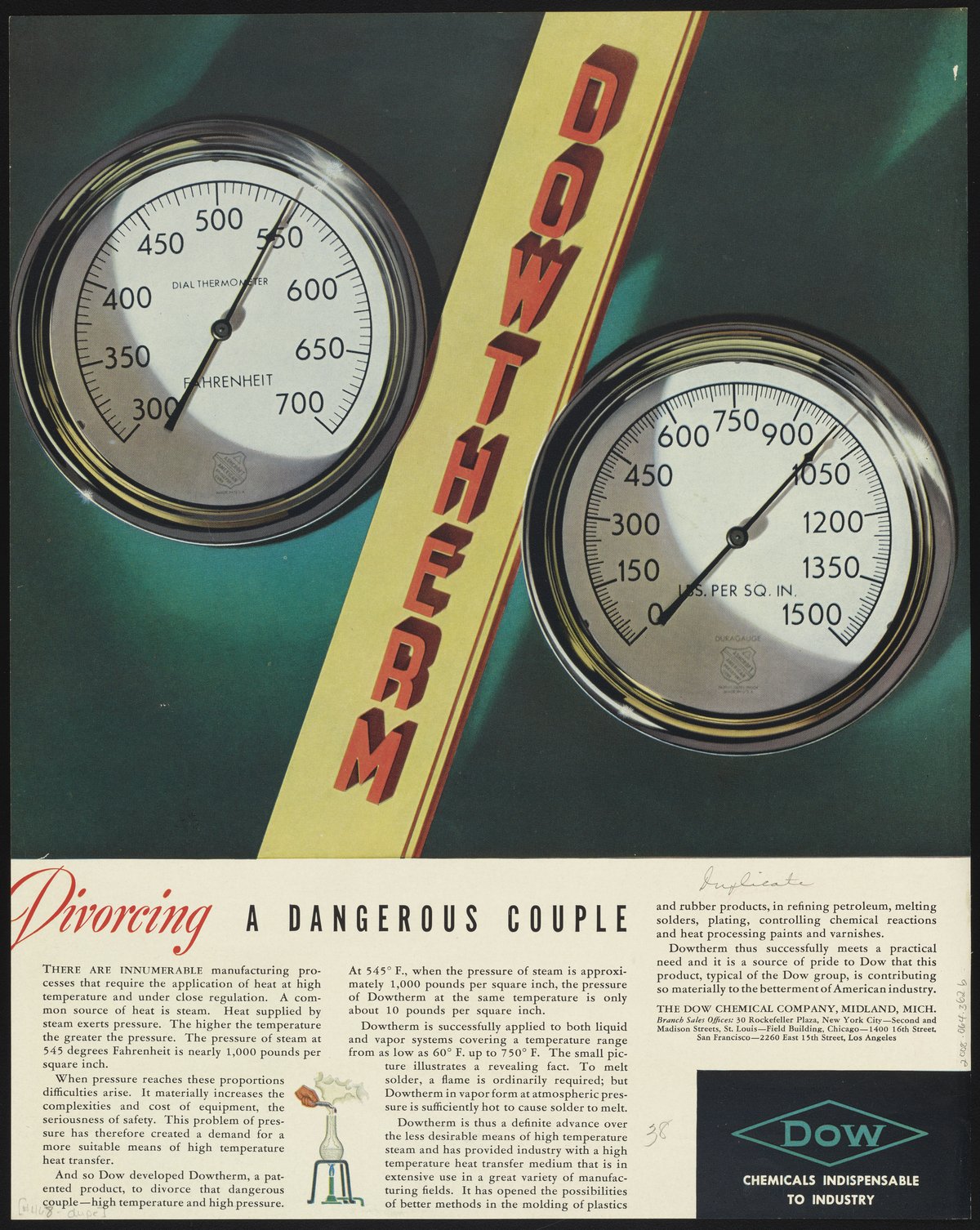 Color print advertisement for Dowtherm, a heat transfer fluid manufactured and sold by the Dow Chemical Company. The advertisement features an illustrated depiction of a temperature and a pressure gauge, with accompanying text detailing the use of Dowtherm as a high temperature heat transfer medium in a variety of manufacturing fields, including rubber, petroleum, paints, and varnishes.