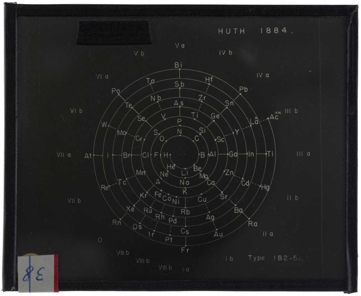 Periodic table in the style of spiral with radii (Heinrich Adolph Baumhauer, 1870)1870 (Original design), Circa 1957 (Date attributed to slide)