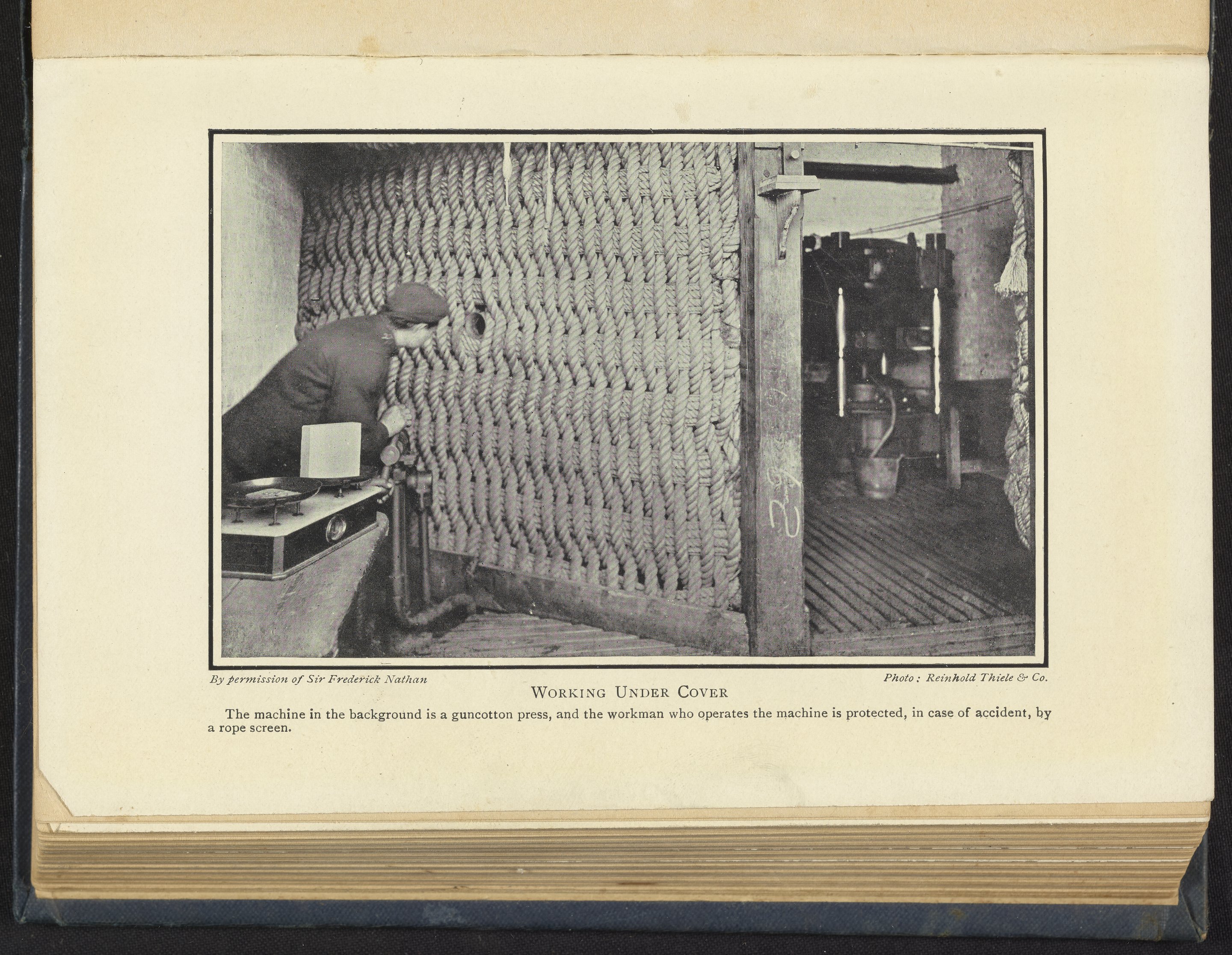 Workman operating a guncotton press behind protective rope screen