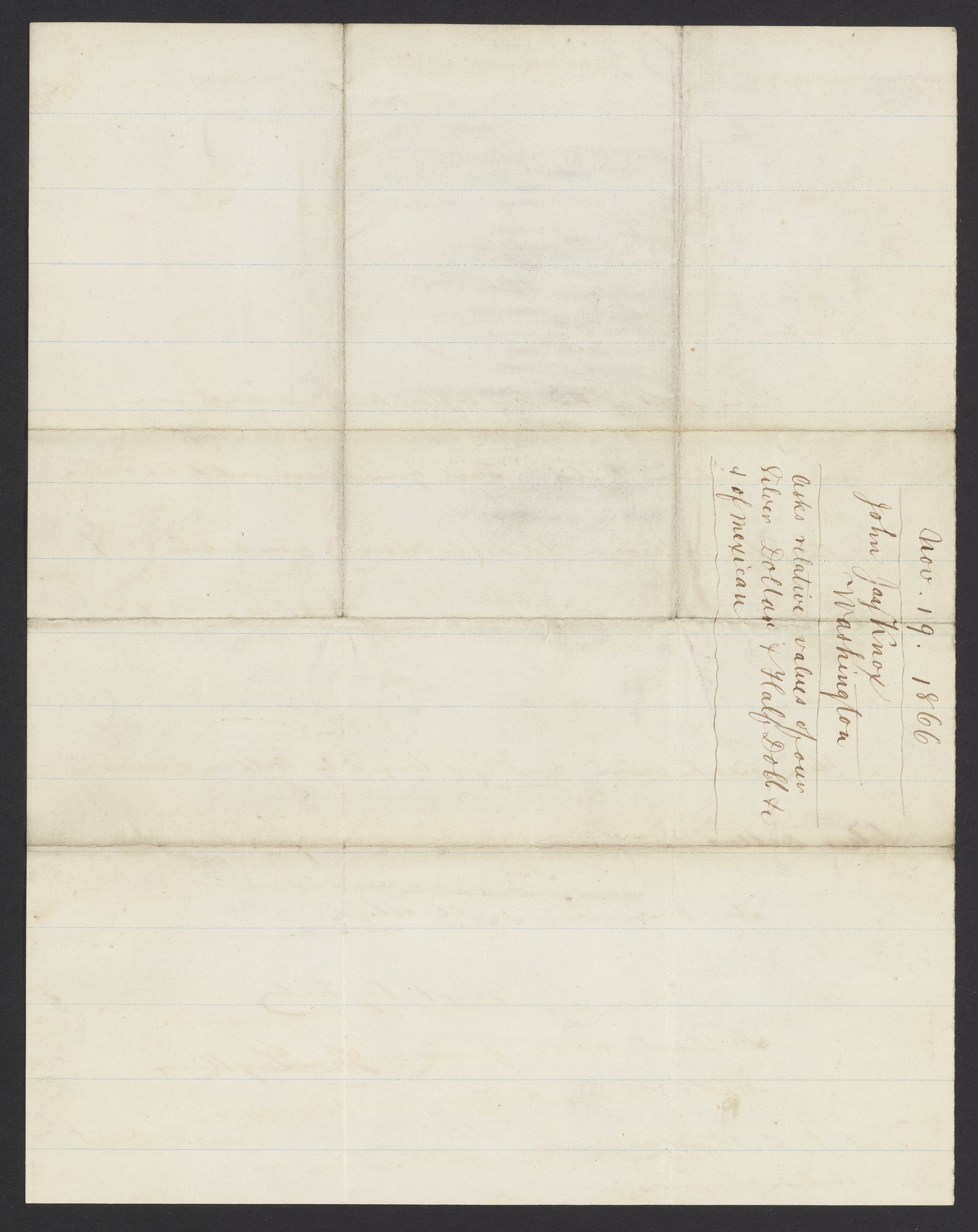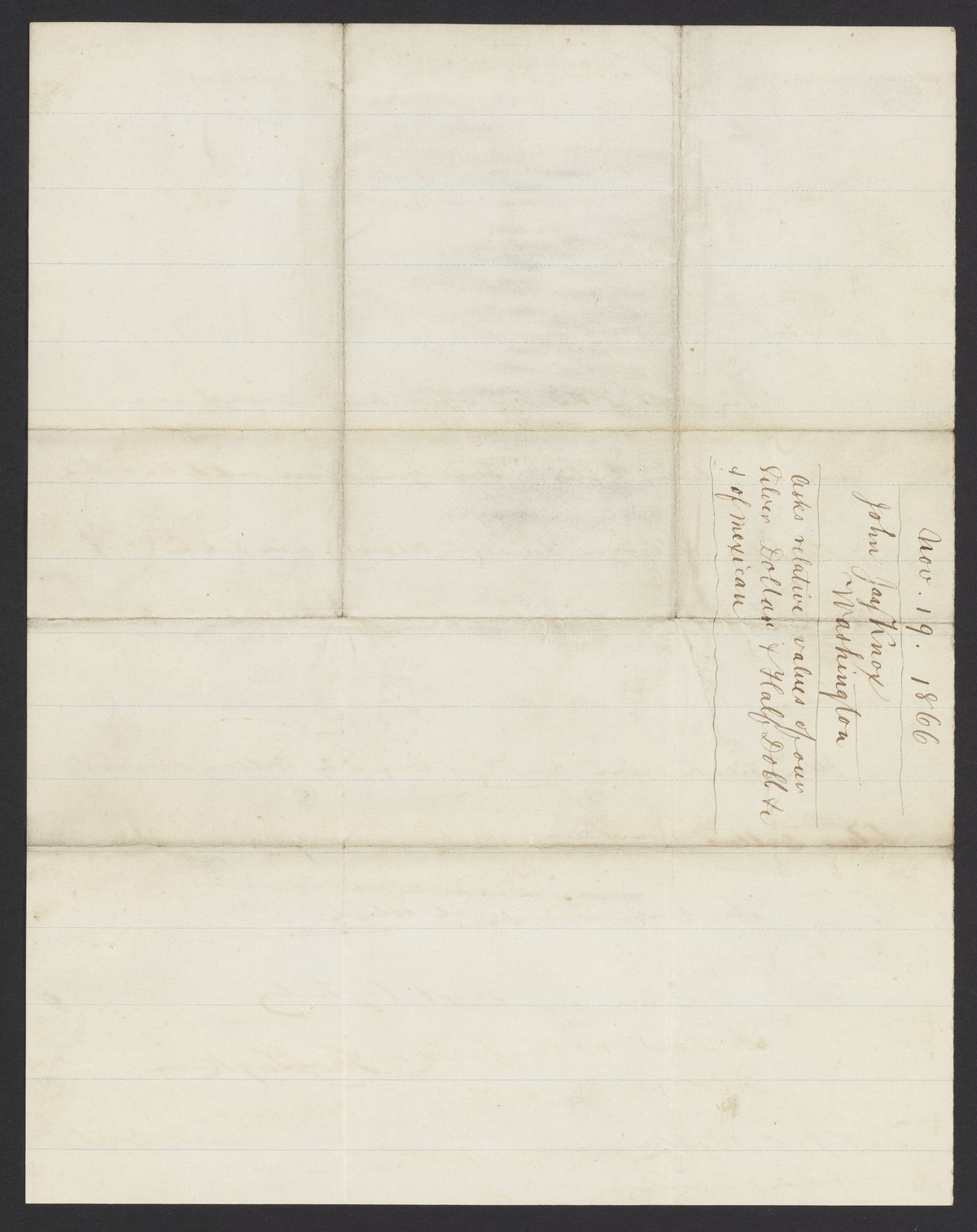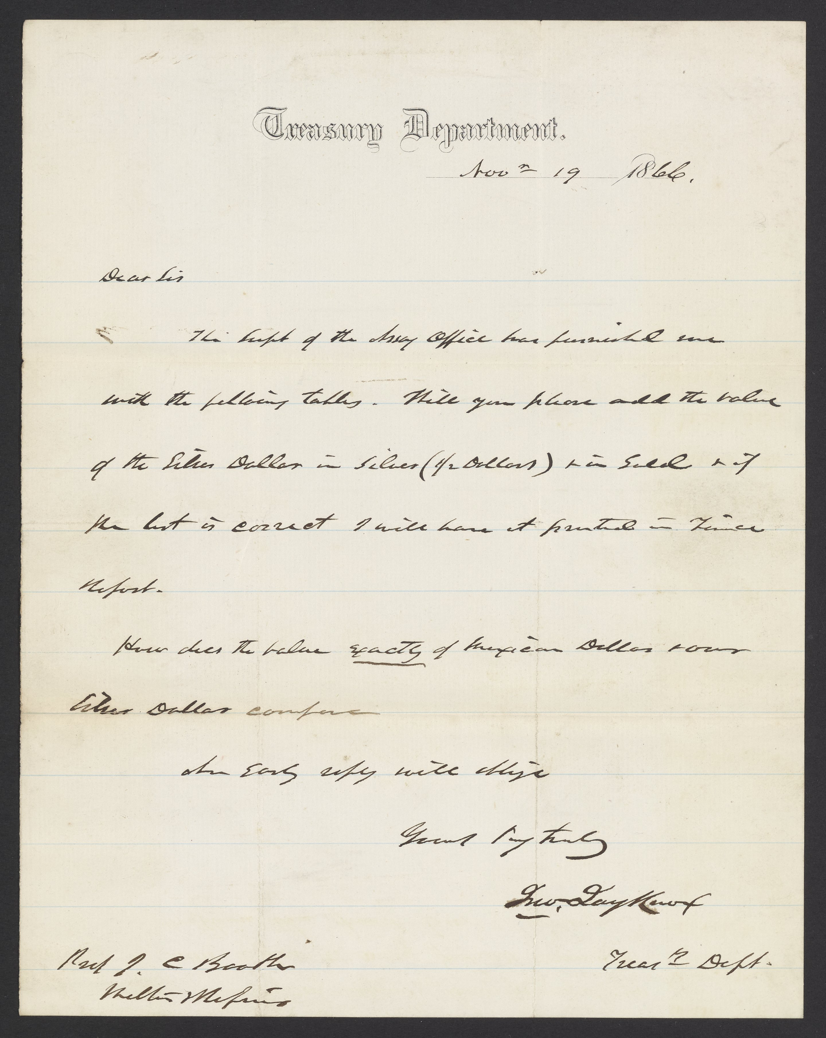 Small JPG1200 x 1508px — 194 KBLarge JPG2880 x 3620px — 1.0 MBFull-sized JPG3318 x 4170px — 1.3 MBOriginal fileTIFF — 3318 x 4170px — 39.6 MBLetter written by John Jay Knox Jr. (1828-1892), an American financier, government official, and primary author of the Coinage Act of 1873, to James Curtis Booth (1810-1888). Knox seeks to determine the relative values of the United States silver dollar, half dollar, and Mexican pesos.