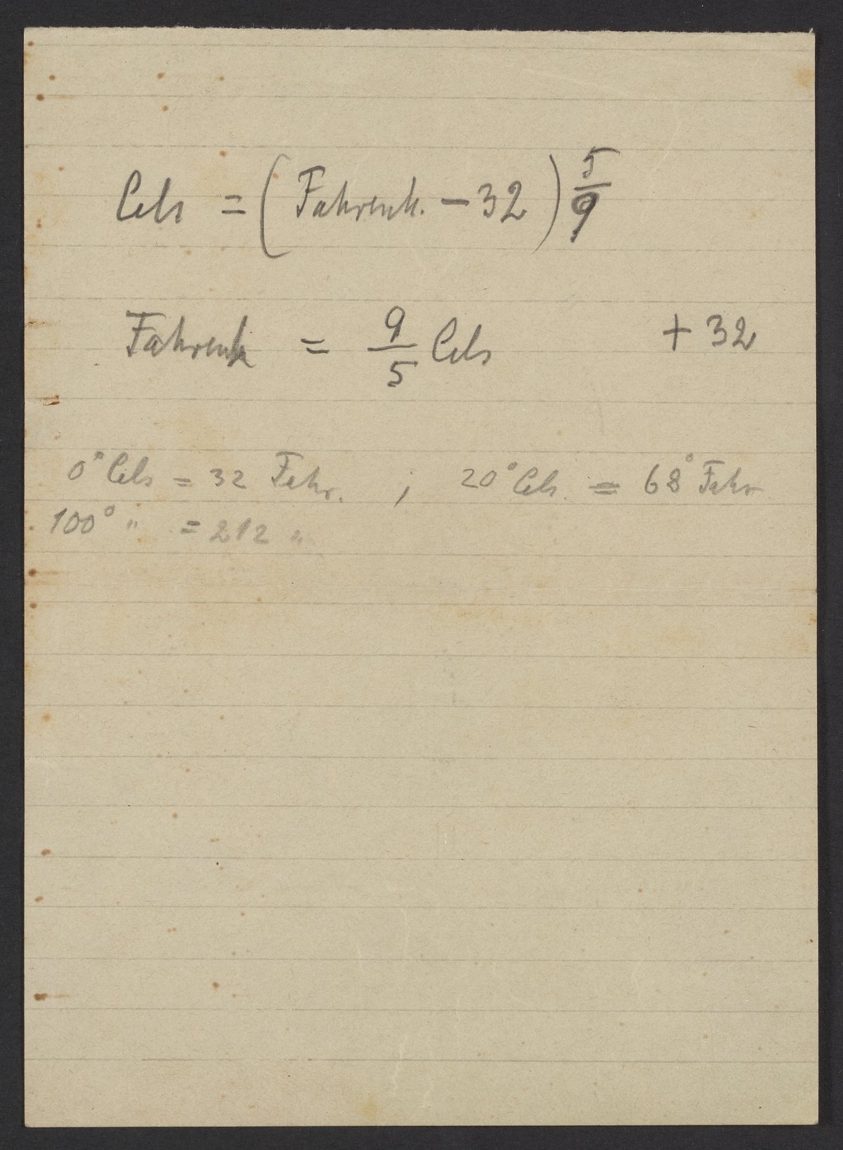 Bredig, Georg. “Conversions from Degrees Celsius to Degrees Fahrenheit ,” n.d. Papers of Georg and Max Bredig, Box 1, Folder 21. Science History Institute. Philadelphia. https://digital.sciencehistory.org/works/9hb0nu4.