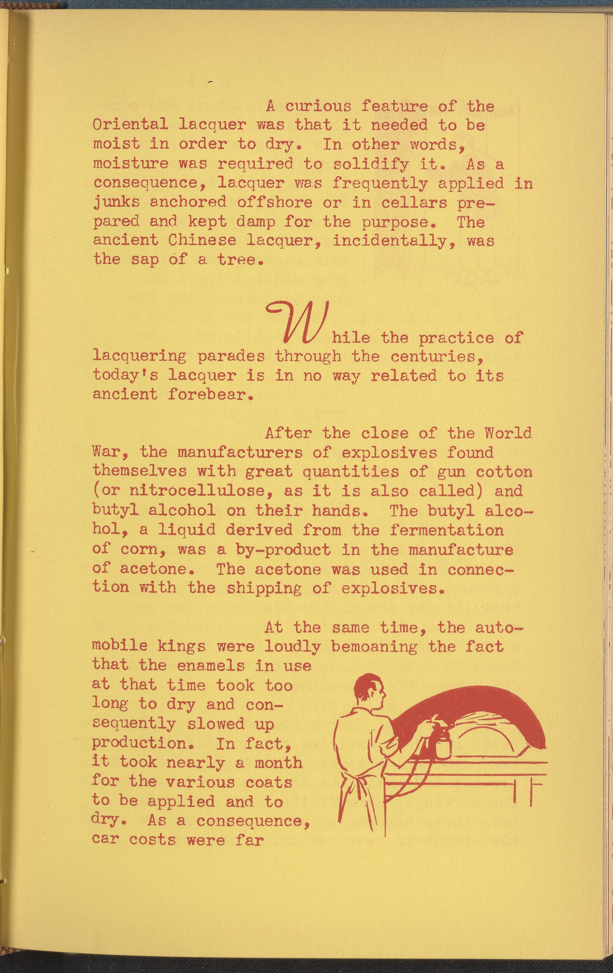 Booklet corresponding to a radio broadcast program created by the National Paint, Varnish, and Lacquer Association. The booklet discusses the origins of lacquer in East Asian countries such as China and Japan. Then, describes how the demand for lacquer grew tremendously in post-war America. Finally, lists many common uses of lacquer and tips for applying it. Includes small stylized illustrations throughout and decorated covers, which include some racially-stereotyped imagery of East Asian people.