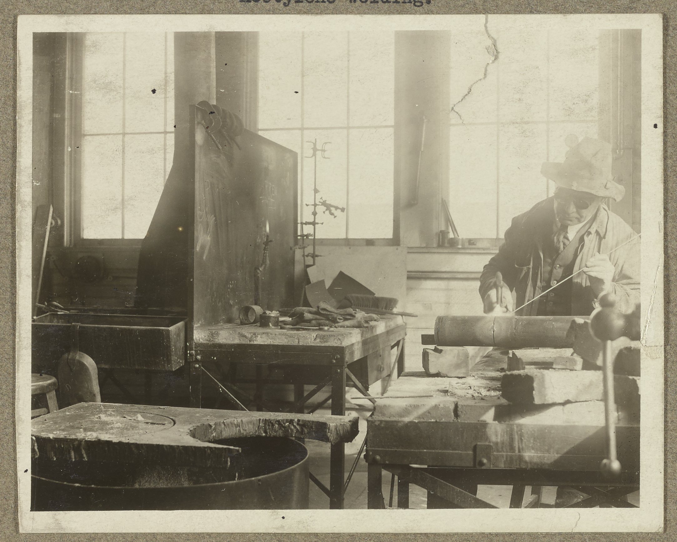 General view of acetylene welding at the U.S. Department of Agriculture's Fixed Nitrogen Research Laboratory located in Washington, D.C. The man visible in the photograph is identified as J.J. Connor. This photograph is believed to have been taken in the electrical shop located at the Laboratory.