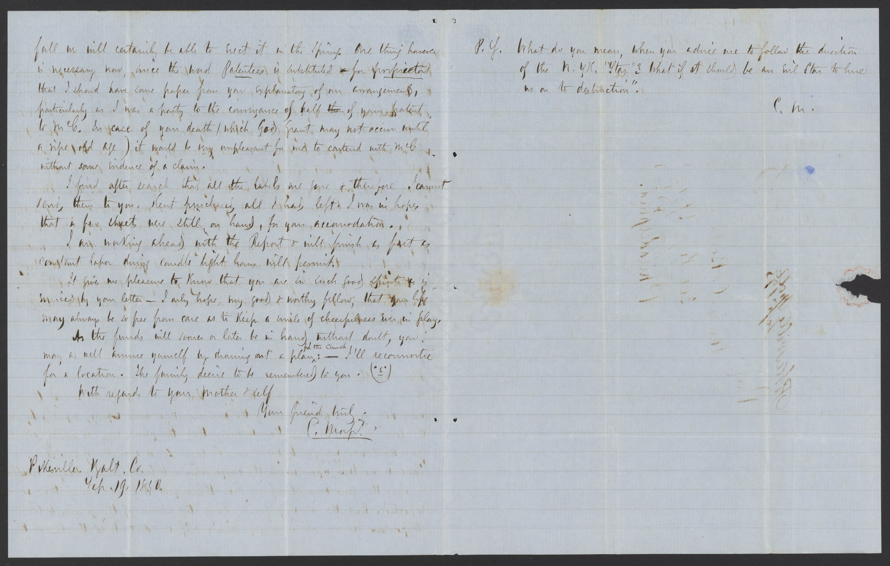Small JPG1200 x 1490px — 332 KBLarge JPG2880 x 3575px — 1.4 MBFull-sized JPG3285 x 4078px — 1.7 MBOriginal fileTIFF — 3285 x 4078px — 38.4 MBCampbell Morfit (1820-1897), a distinguished chemist and co-editor with James Curtis Booth (1810-1888) of the Encyclopedia of Chemistry (1850), writes to Booth. Letter contains an early example of a "smiley face" in a message.