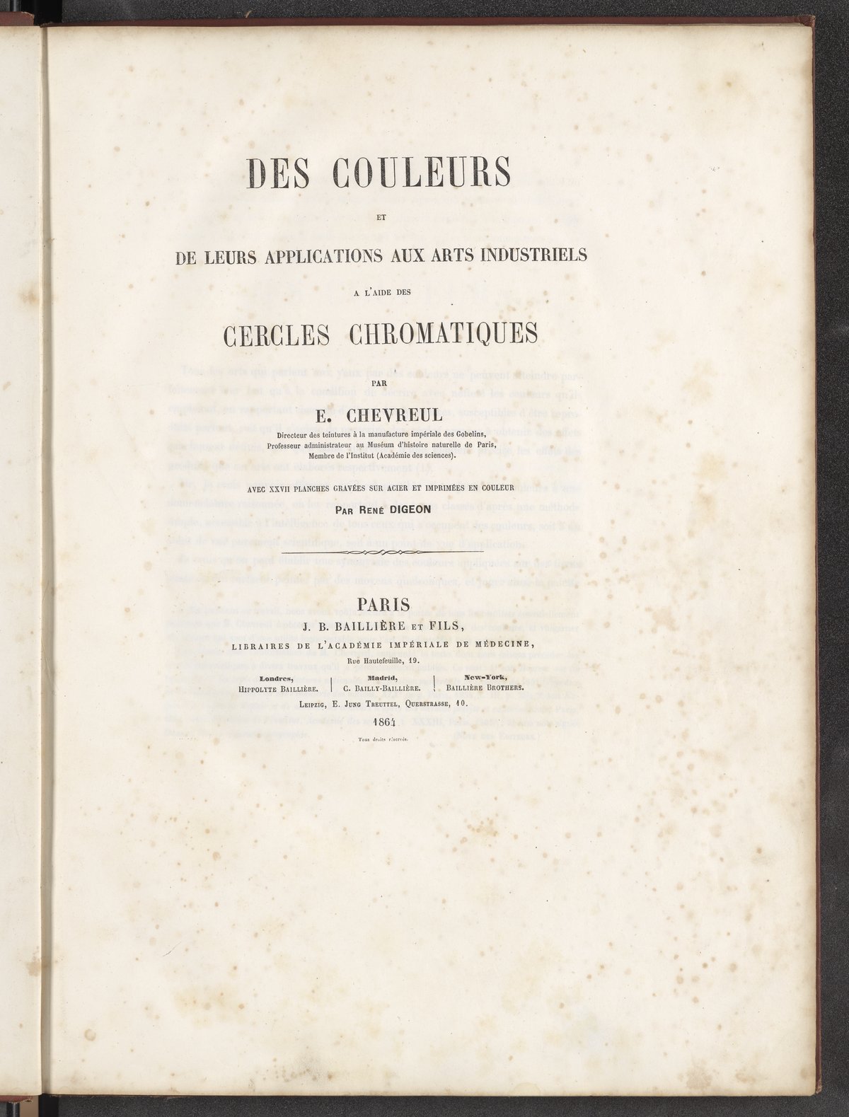 Chevreul, M. E. (Michel Eugène). Des Couleurs Et De Leurs Applications Aux Arts Industriels à l'Aide Des Cercles Chromatiques. Paris, France: J.-B. Baillière et fils, 1864. https://digital.sciencehistory.org/works/9p290956v.