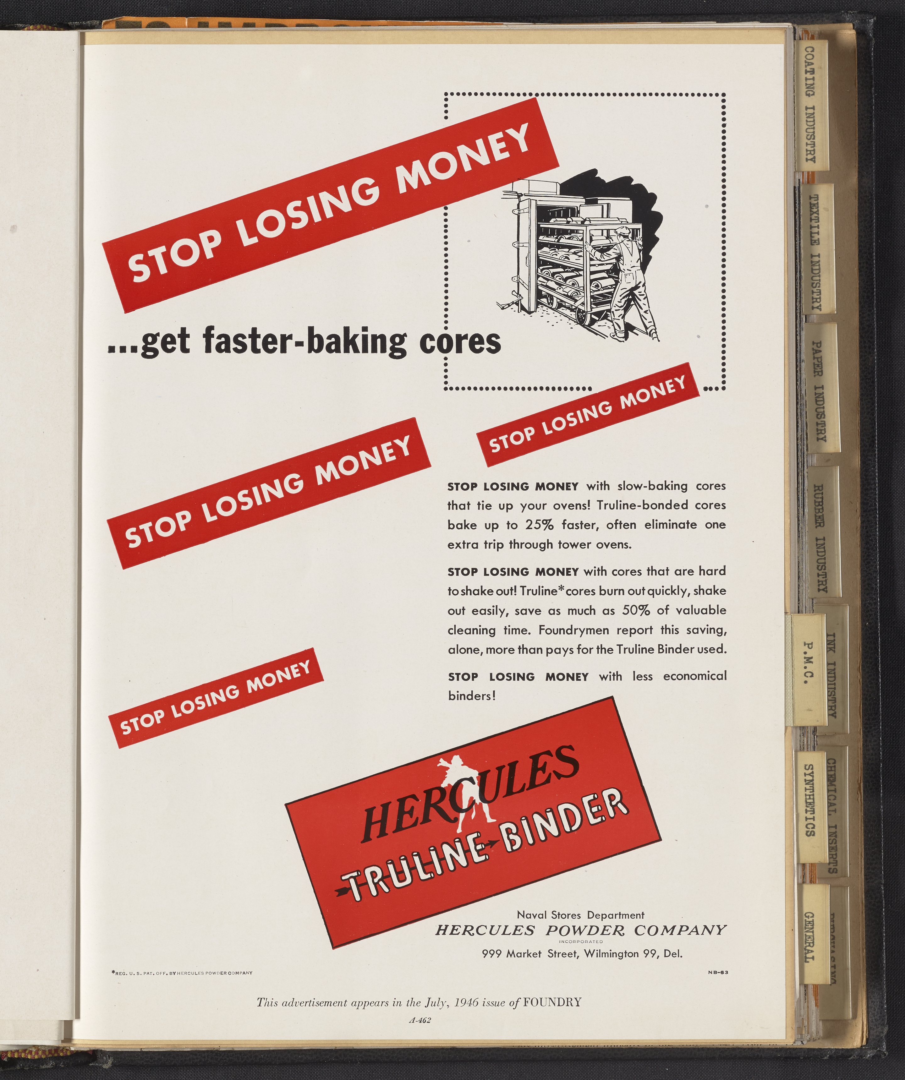 Hercules Incorporated. “Stop Losing Money...Get Faster-Baking Cores.” 1946 Hercules Advertisements, 1946. Records of Hercules Incorporated, Volume 1946. Science History Institute. Philadelphia. https://digital.sciencehistory.org/works/9p290b006.