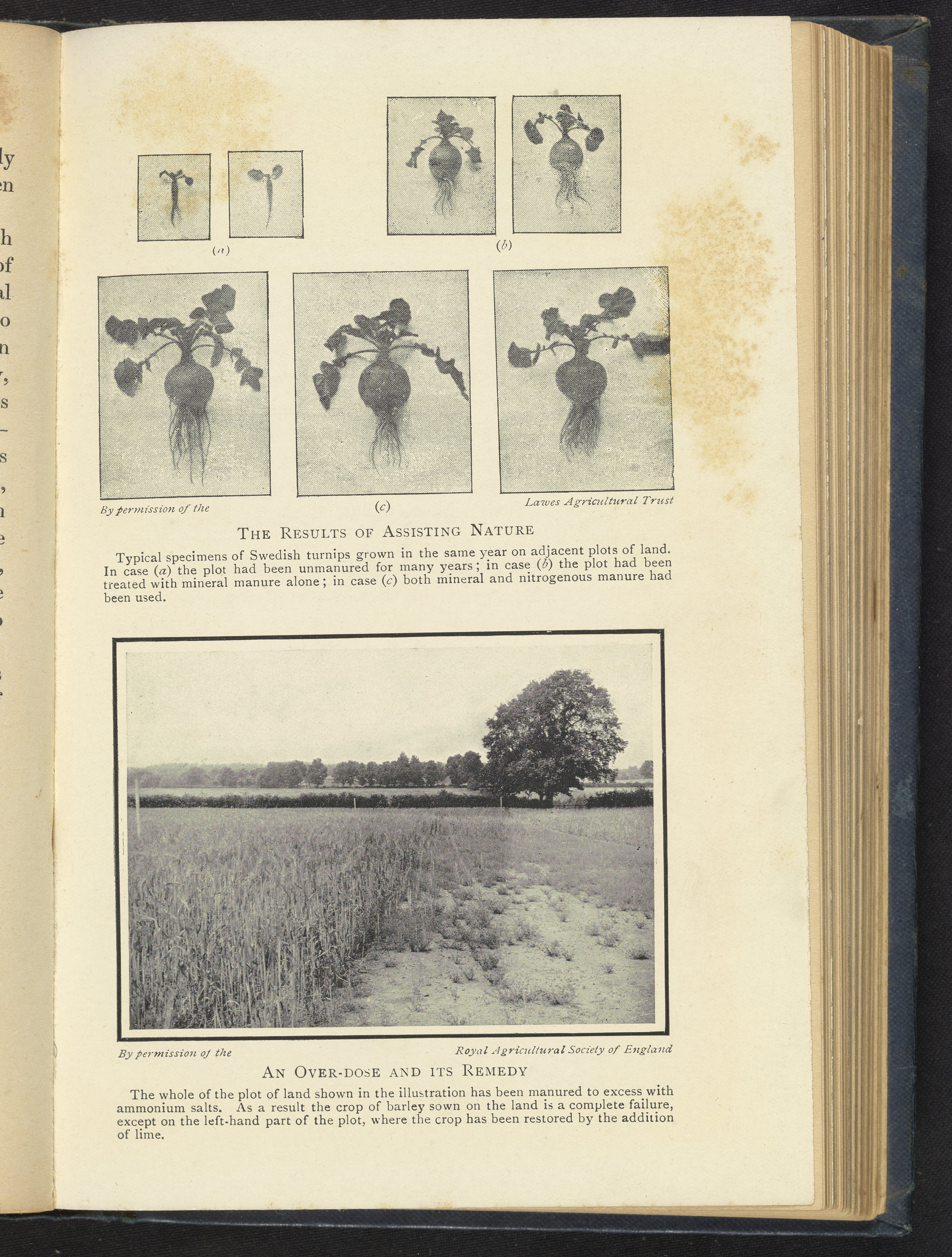 The top photographic reproduction is entitled "The Results of Assisting Nature" and depicts Swedish turnips grown with varying amounts of mineral manure and nitrogenous fertilizers. The bottom illustration is titled "An Over-dose and its Remedy" and depicts a field of barley with the left half being grown on land where lime has amended the soil. The right side did not receive a lime treatment, hence the lack of crop.