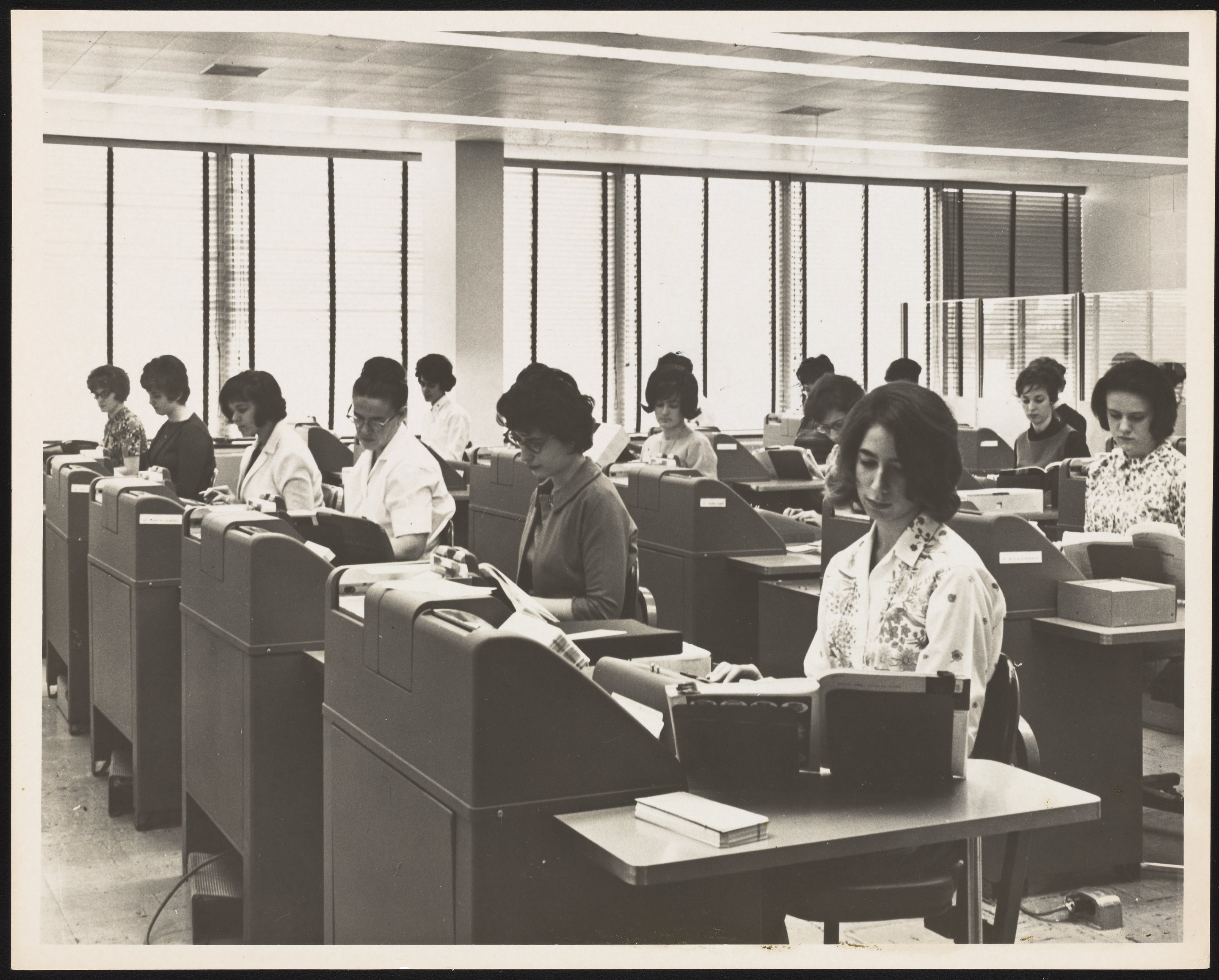 Each employee (all of whom appear to be female) is seated at an IBM 526 Printing Summary Punch machine creating punch cards, also known as Hollerith cards or IBM cards. The holes punched in these paper cards were used to represent computer data and instructions. They were a widely-used means of inputting data into early computers.
