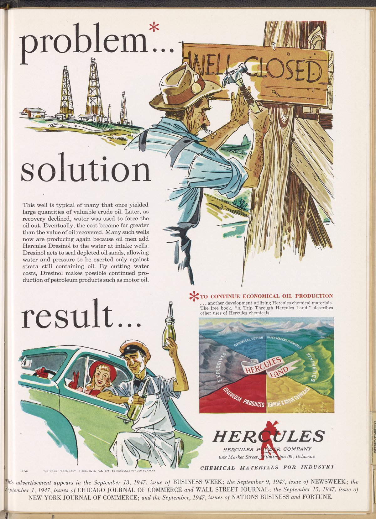 Advertisement for Dresinol, the trade name for a resin emulsion used as modifiers in adhesives in textile finishing compositions, in emulsion paints, as an ingredient in binders for plastics, etc. Manufactured and sold by the Hercules Powder Company, the work advertises Dresinol as a water additive and chemical plugging agent for use in the process of oil extraction. This advertisement appeared in the September 13, 1947 issue of Business Week; the September 9, 1947 issue of Newsweek; the September 1, 1947 issues of Chicago Journal of Commerce and the Wall Street Journal; the September 15, 1947 issue of New York Journal of Commerce; and the September 1947 issue of Nations Business and Fortune.