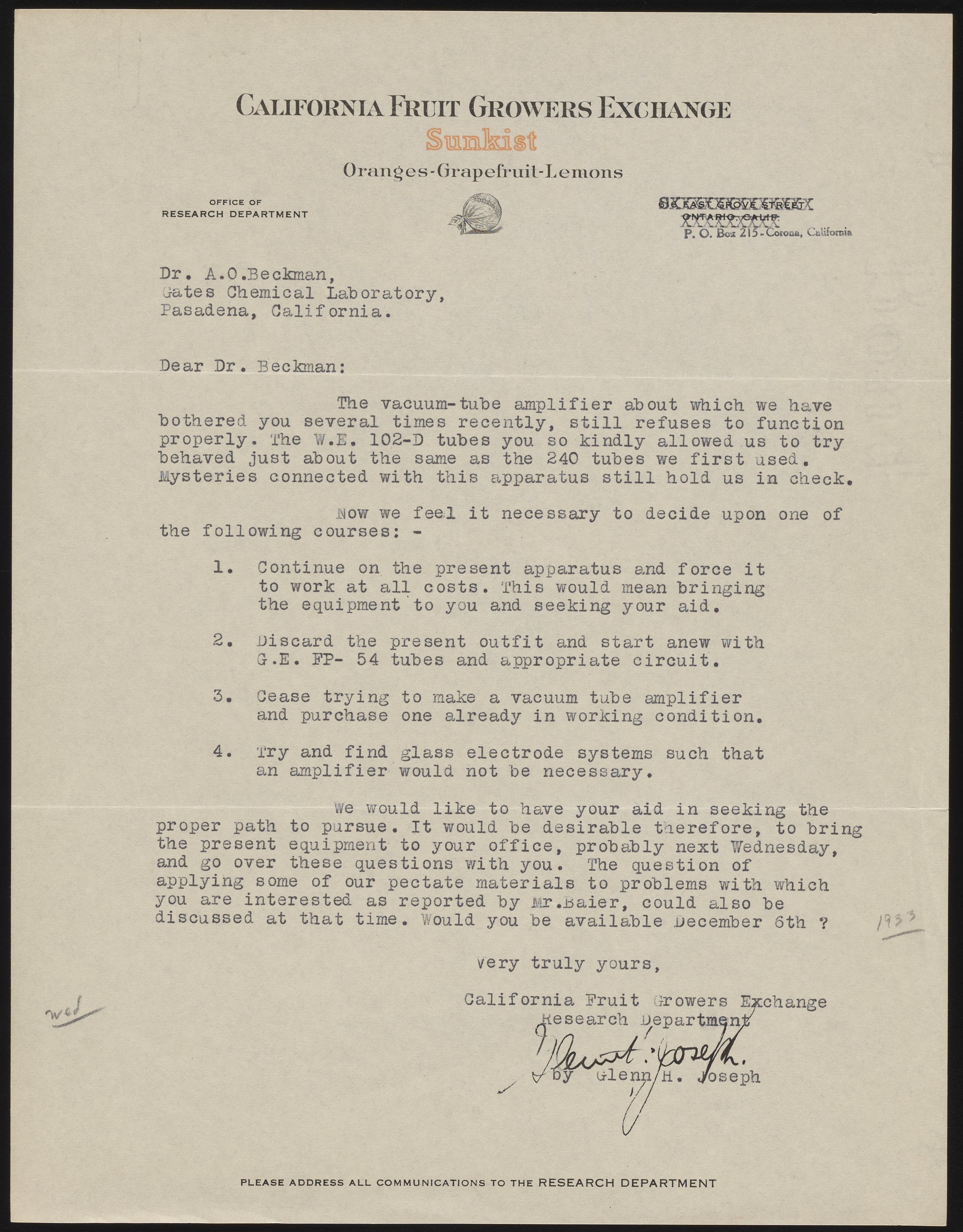 Joseph, Glenn. “Letter from Glenn Joseph to Arnold O. Beckman,” 1933. Beckman Historical Collection, Box 14, Folder 8. Science History Institute. Philadelphia. https://digital.sciencehistory.org/works/9s161618p.