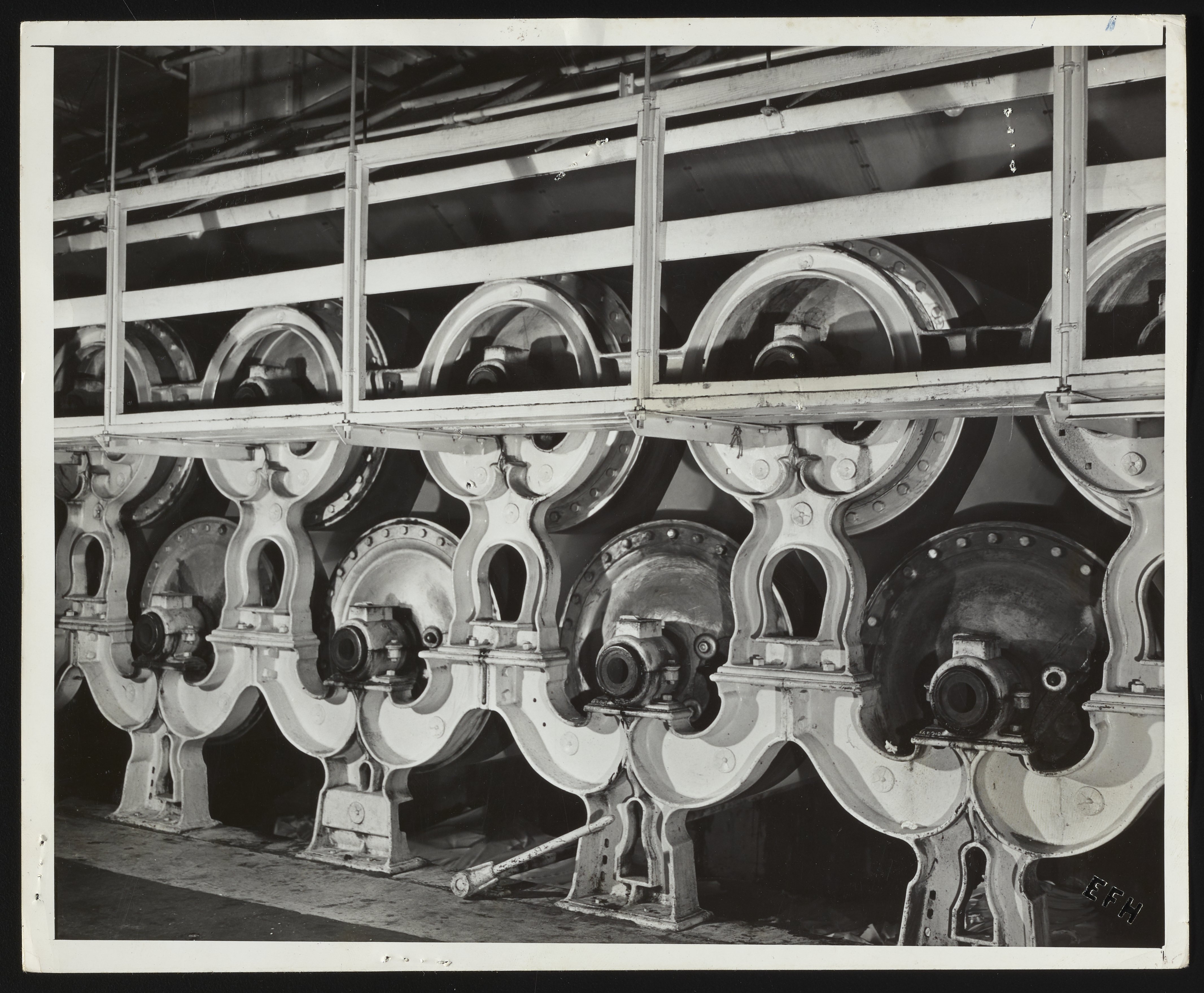 Detail view of the side of a paper machine used in the production of so-called "chemical cotton" at the Hercules Powder Company plant in Hopewell, Virginia. Chemical cotton, a type of purified cellulose obtained from raw cotton linters, is commonly used for the manufacture of cellulose ethers, i.e. water-soluble polymers that have a variety of uses as thickeners, binders, and water-retention agents in products ranging from ceramics and paints to food, cosmetics, and pharmaceuticals.