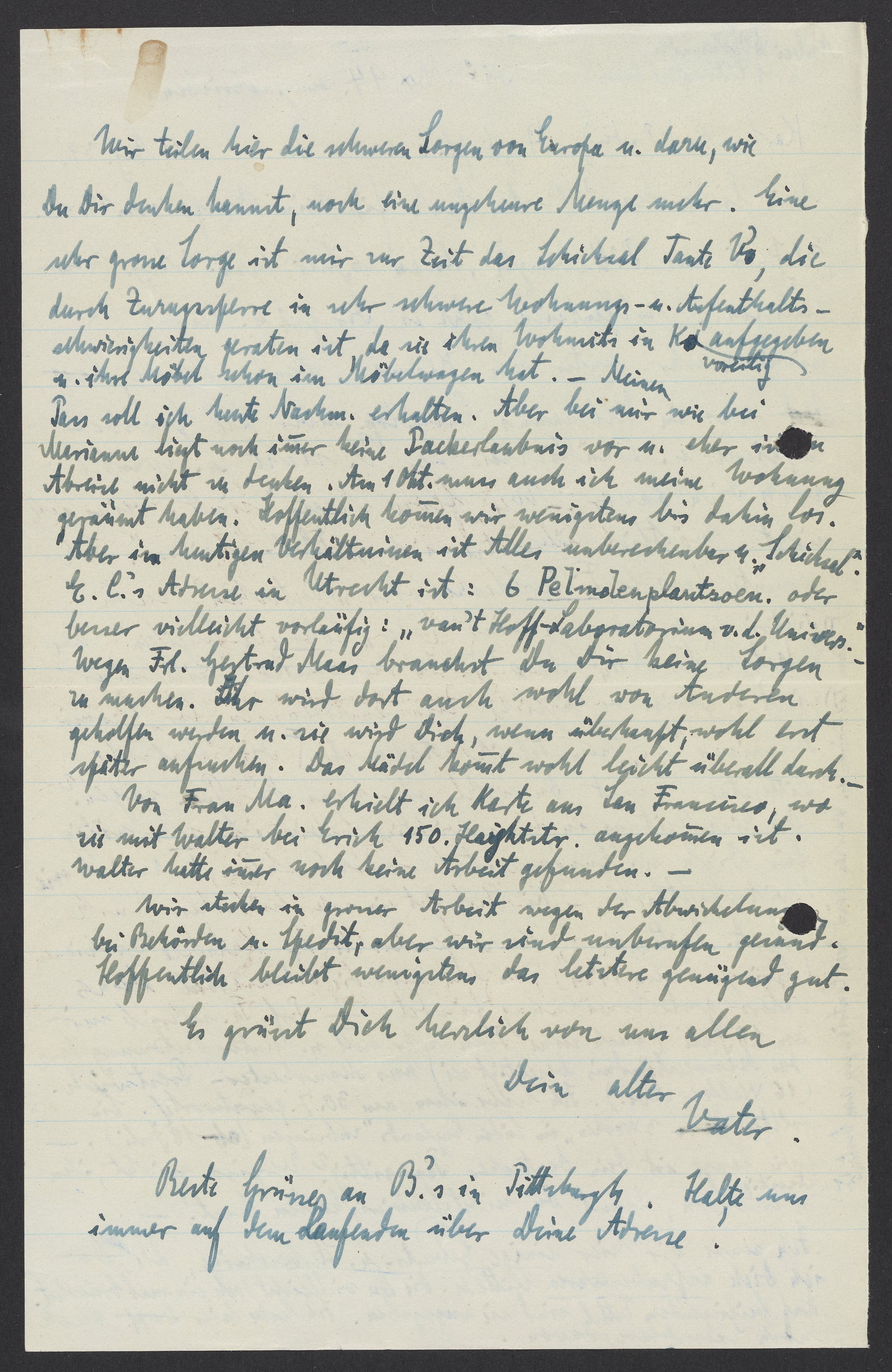 We have grave concerns about Europe here and, as you can imagine, a great deal more. At the moment, I am very concerned about the fate of Aunt Vally, who is experiencing serious housing and residence difficulties due to the ban on moving, especially since she gave up her home in Karlsruhe and her furniture is already in on the moving truck. I’m supposed to receive my passport this afternoon. Marianne and I both still don’t have a moving permit and I can’t contemplate leaving before that. I must vacate my apartment by October 1st. Hopefully, we can take care of everything by then. However, under current circumstances, everything is unpredictable and left up to “fate.” Ernst Cohen's address in Utrecht is: 6 Pelmolenplantsoen. or even better “van't Hoff Laboratory at the university.” You don’t need to worry about Ms. Gertrud Maas. Other people will help her, and she will eventually visit you. She manages well everywhere.