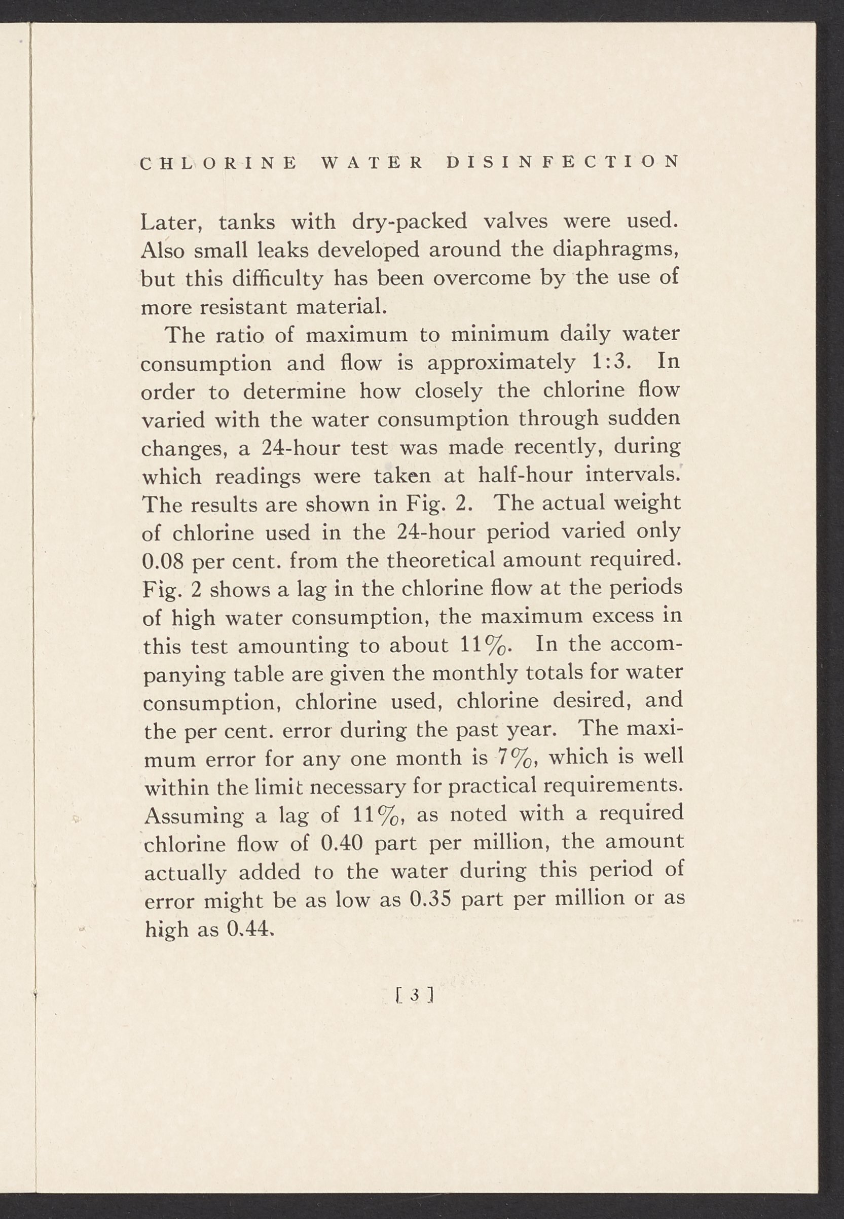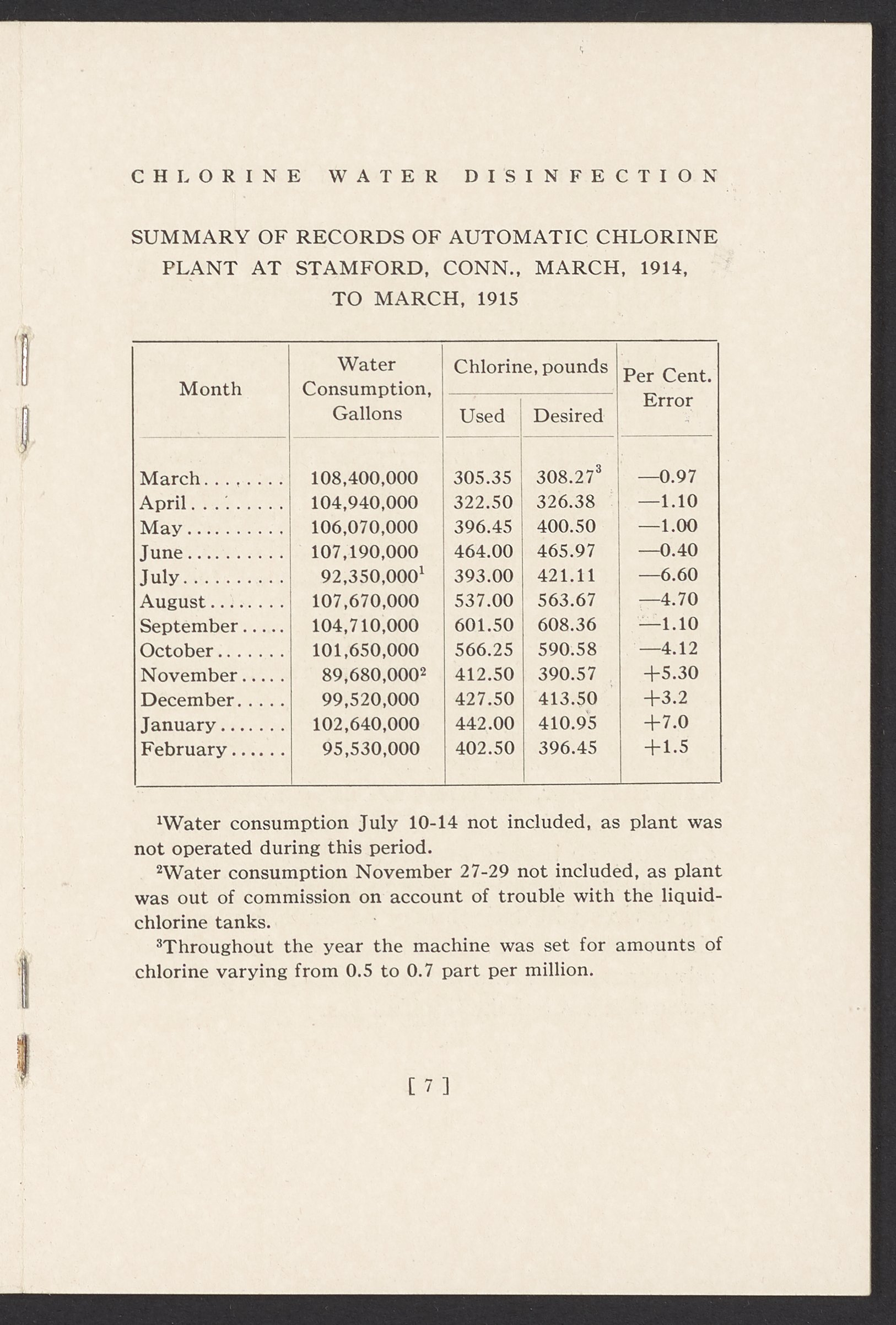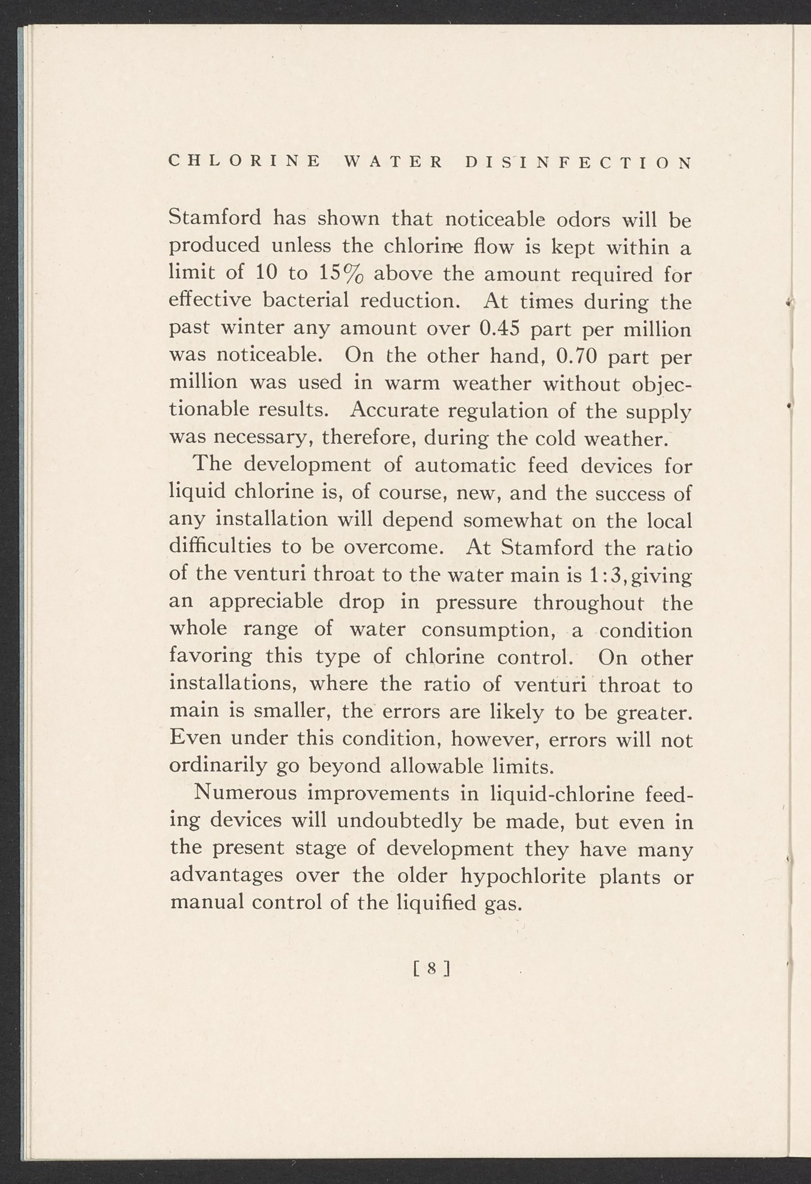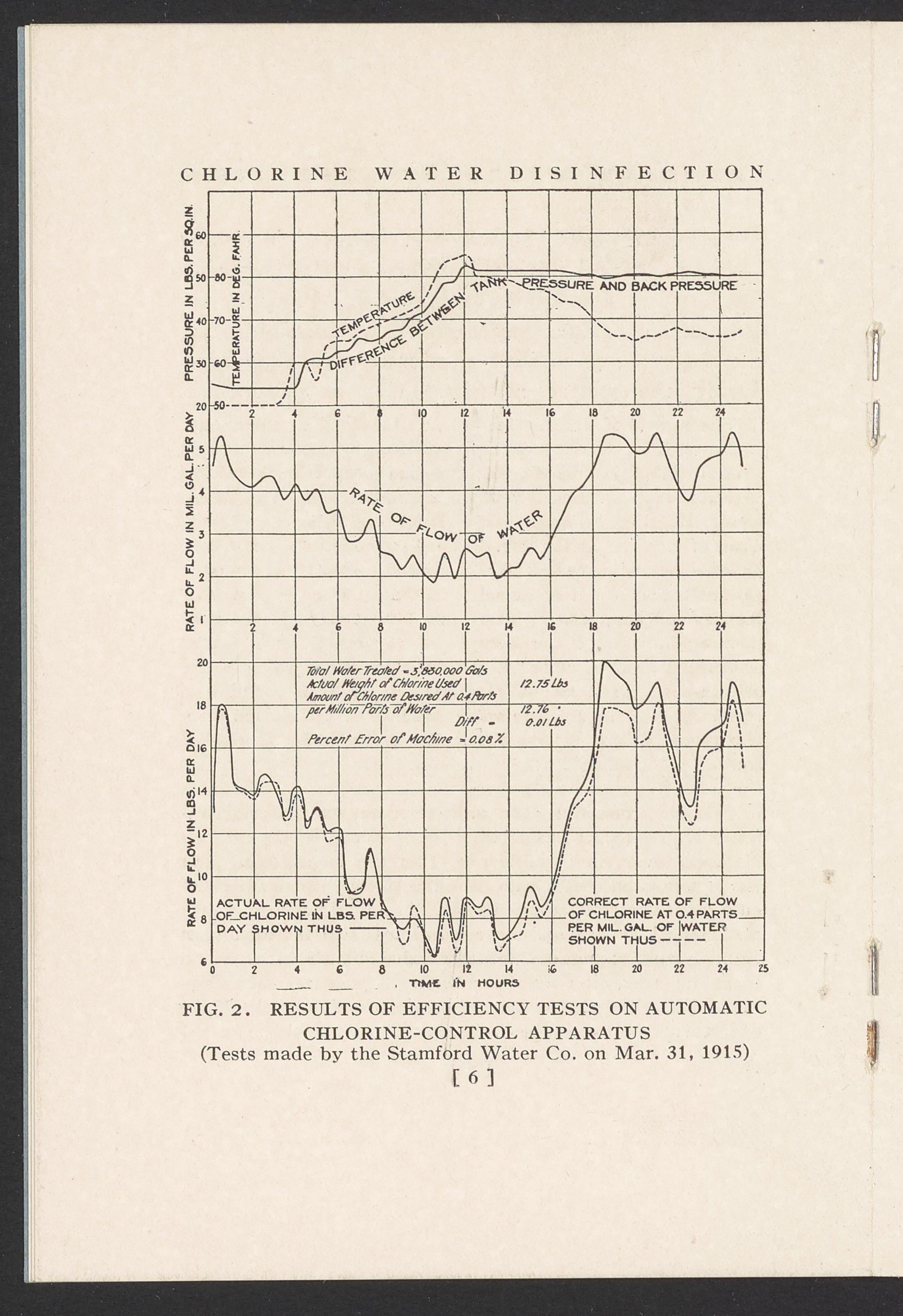 Small JPG1200 x 1746px — 381 KBFull-sized JPG1652 x 2404px — 674 KBOriginal fileTIFF — 1652 x 2404px — 11.4 MBPamphlet summarizing data accumulated by the Stamford Water Works reflecting the bacterial and mechanical efficiency of an automatic control for liquid-chlorine disinfection of water. Includes data tables and two black and white prints. Work is digitized in its entirety.