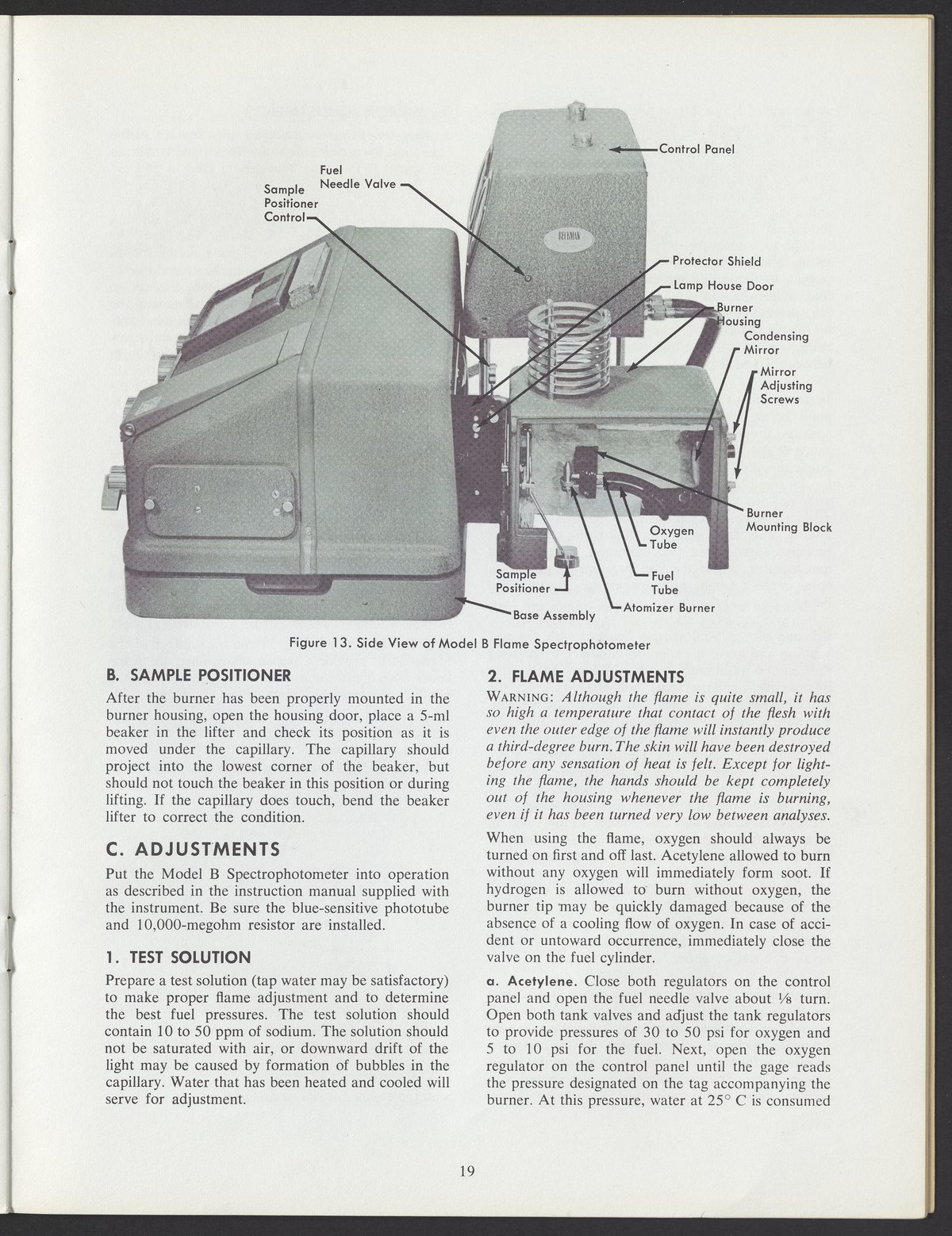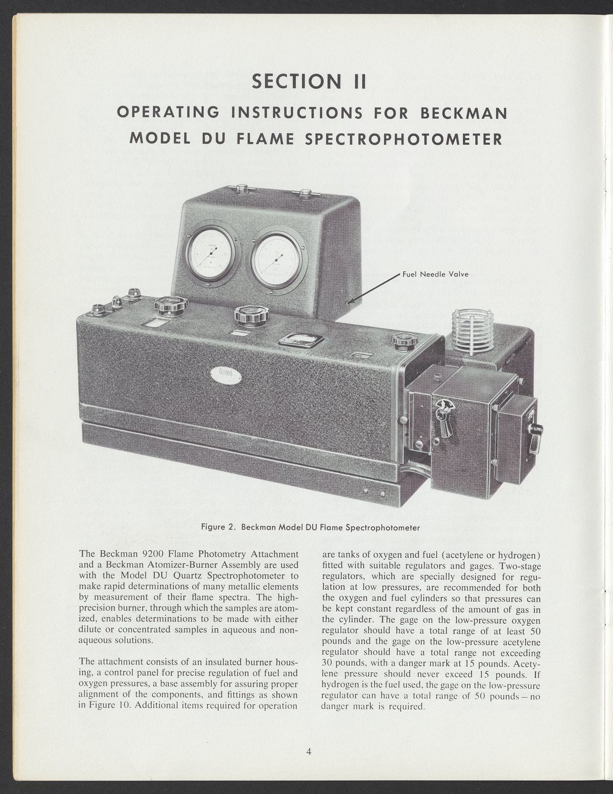 Beckman Instruments, Inc. “Instruction Manual, Beckman Models DU and B Flame Spectrophotometers,” September 1963. Beckman Historical Collection, Box 104, Folder 215. Science History Institute. Philadelphia. https://digital.sciencehistory.org/works/9w0323862.