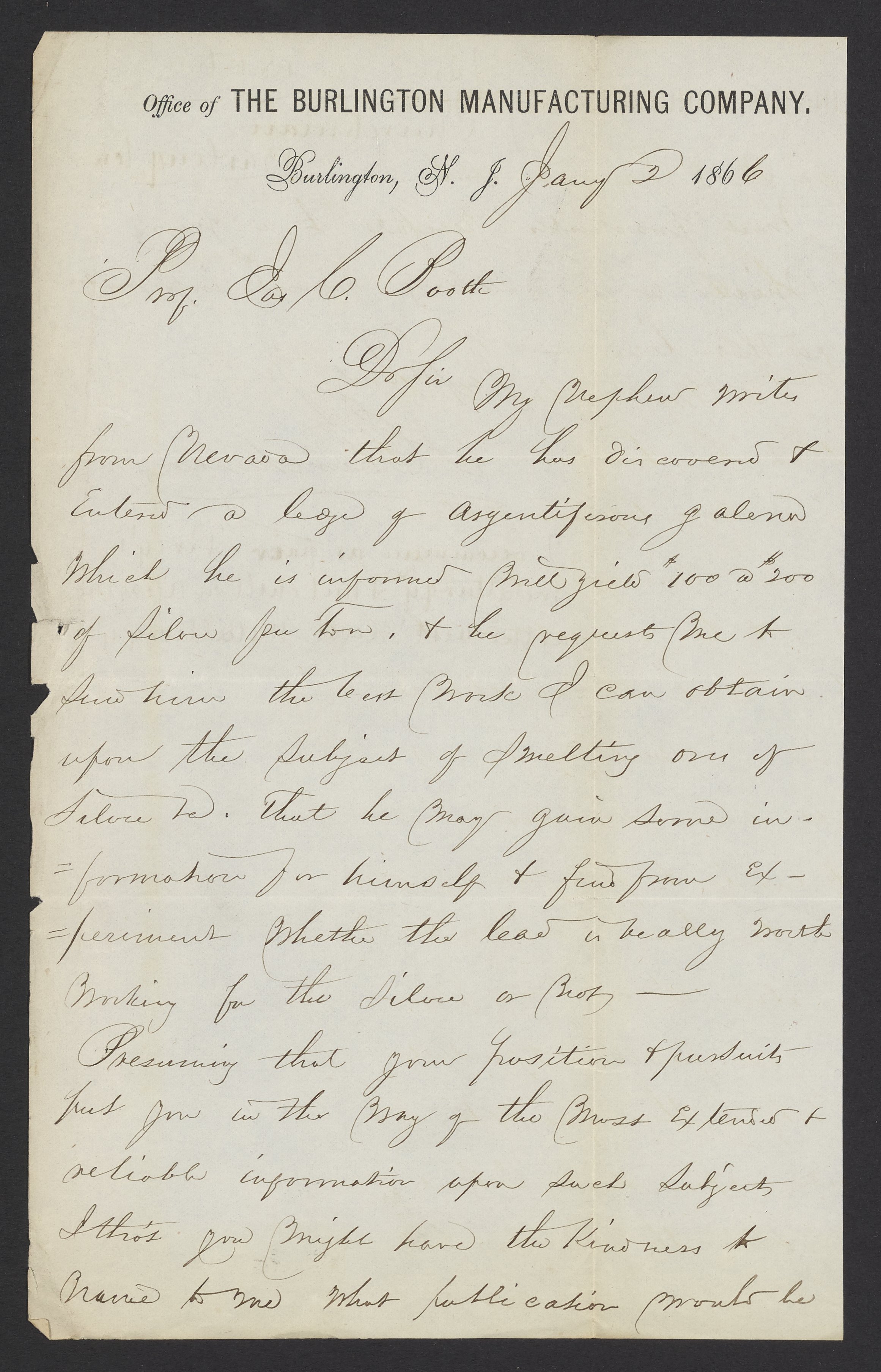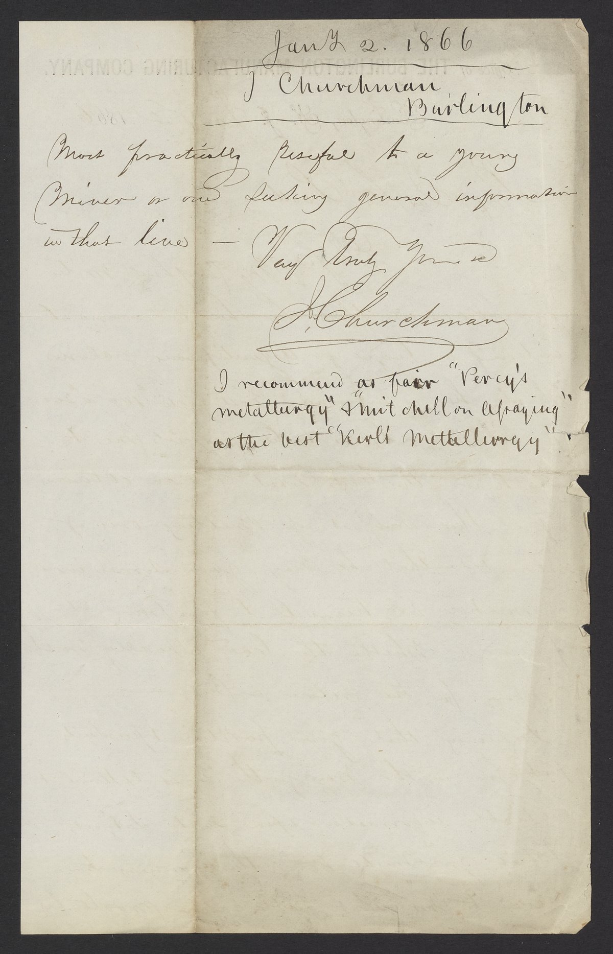 Letter from J. Churchman to James Curtis Booth