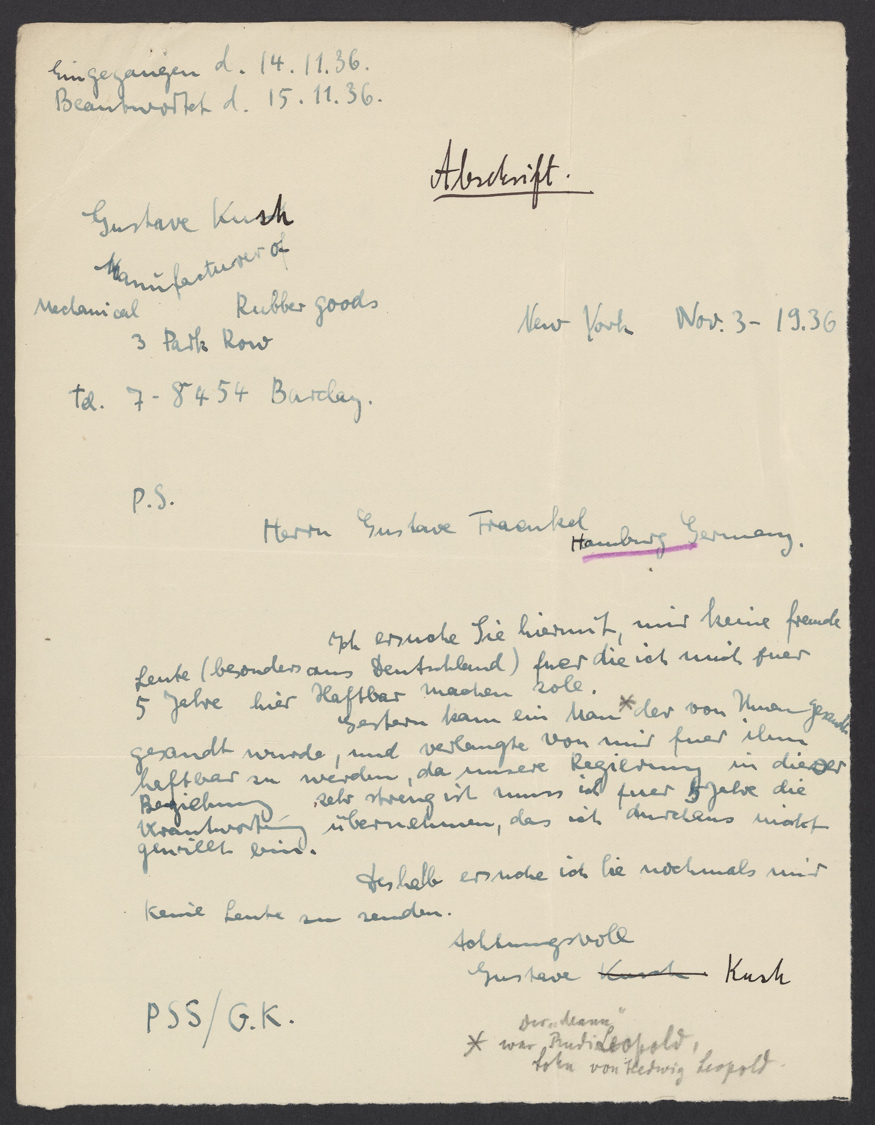 Kusk, Gustave. “Letter to Gustav Fraenkel, November 1936,” November 3, 1936. Papers of Georg and Max Bredig, Box 8, Folder 19. Science History Institute. Philadelphia. https://digital.sciencehistory.org/works/9y7wmul.