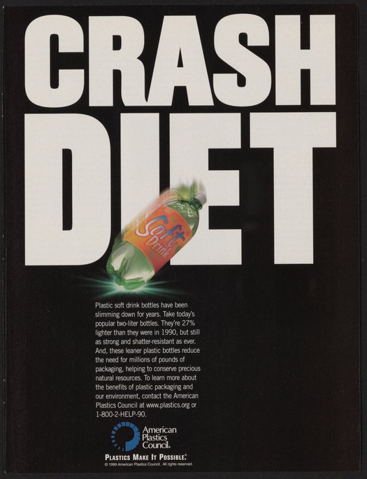 Beginning in 1993, the American Plastics Council ran a $30 million public relations campaign titled “Plastics Make it Possible.” This campaign attempted to counter negative public opinions about plastics and to reduce public support for bans on Styrofoam and plastic bags. The ads reflect concerns about plastics in the 1990s, including anxieties about pollution and resource conservation. The campaign invited Americans to “take another look at plastics,” by highlighting the role of plastics in applications like food preservation, medicine, and consumer safety. While focused on advertising on TV and in magazines, the campaign also included public booklets, educational videos, and promotional t-shirts.