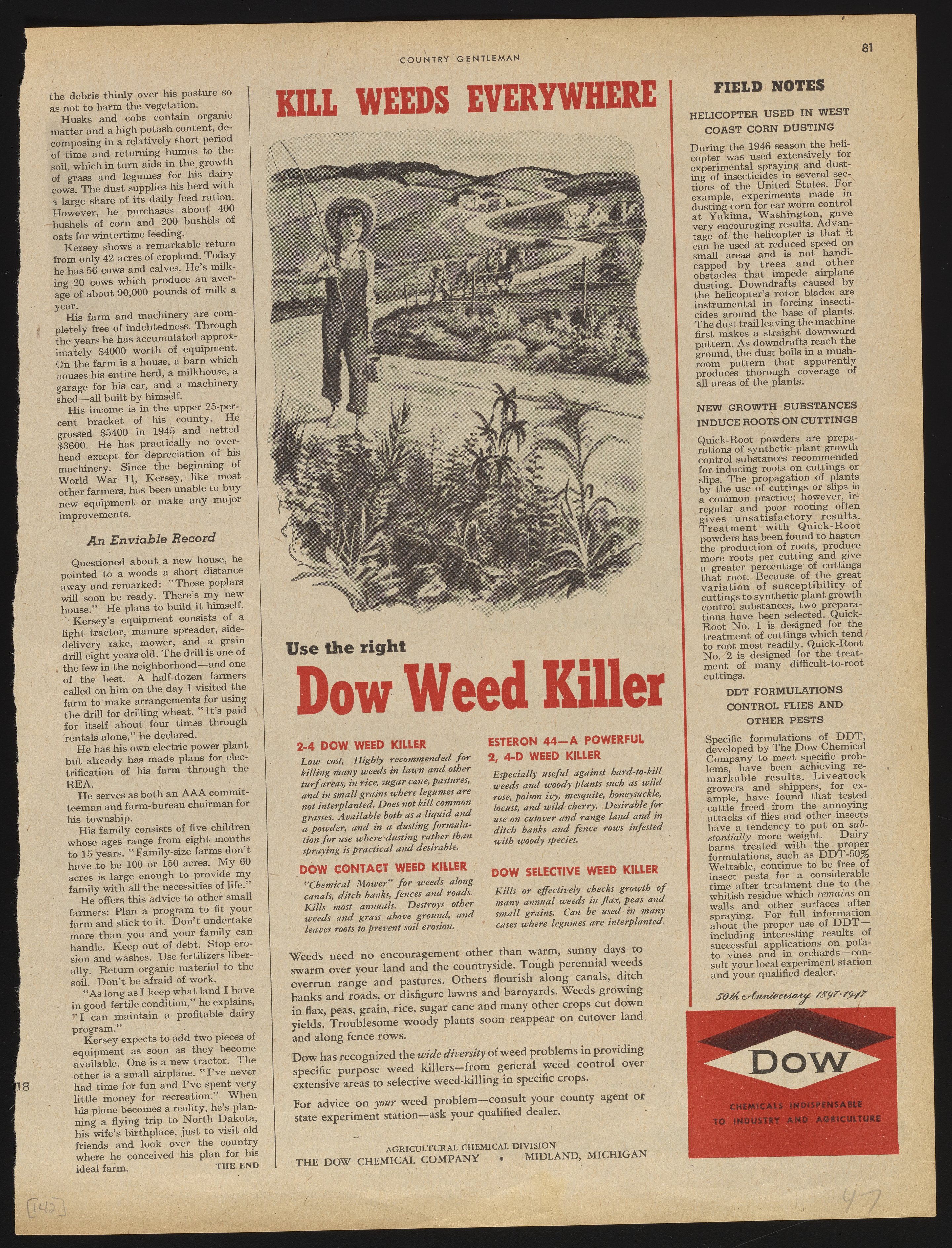 Print advertisement for weed killers and other agricultural chemicals manufactured and sold by the Dow Chemical Company. The advertisement features an illustration of a Tom Sawyer-esque boy walking down a dirt road with farm fields visible in the background. This advertisement appeared on page 81 of the May 1947 edition of Country Gentleman.