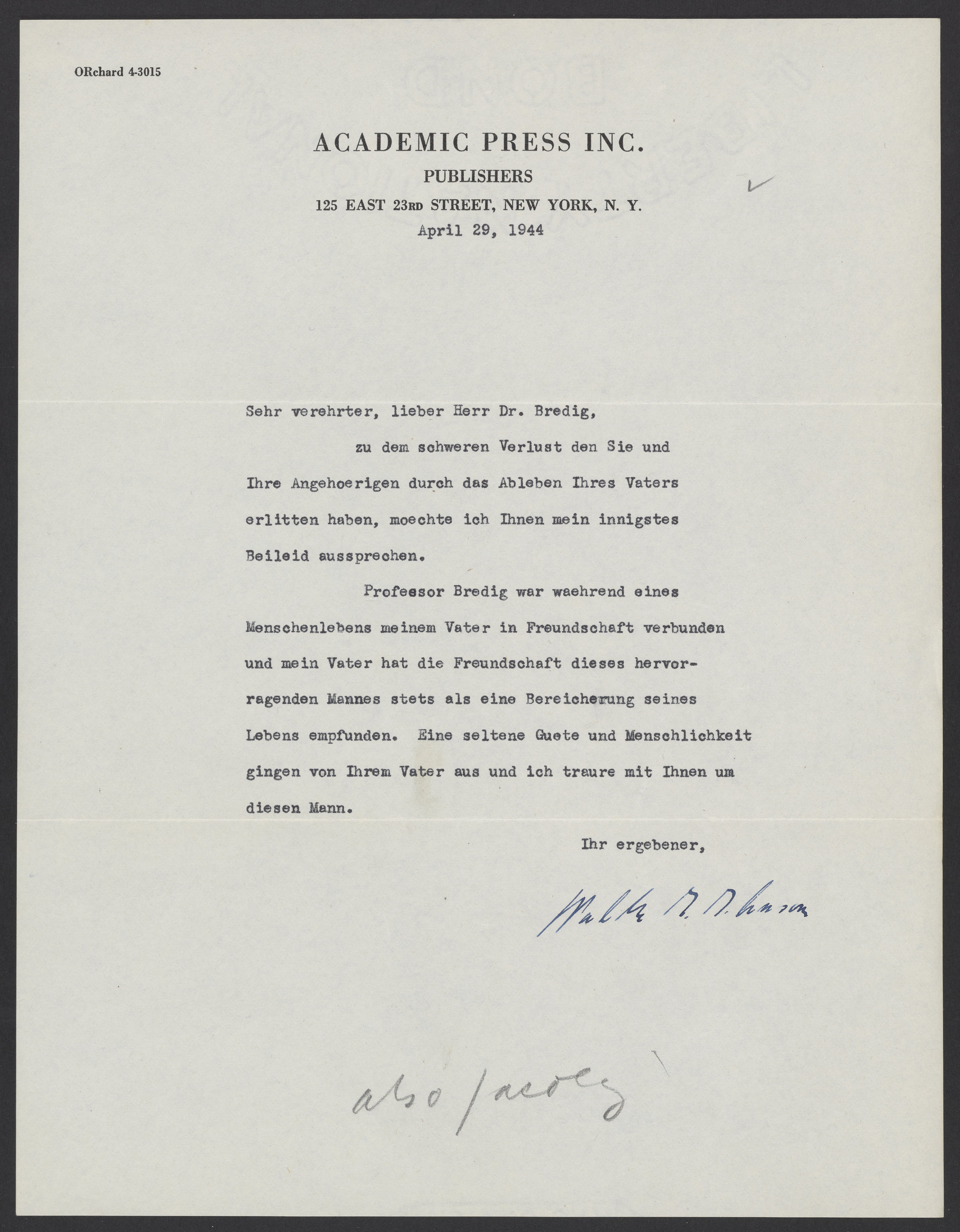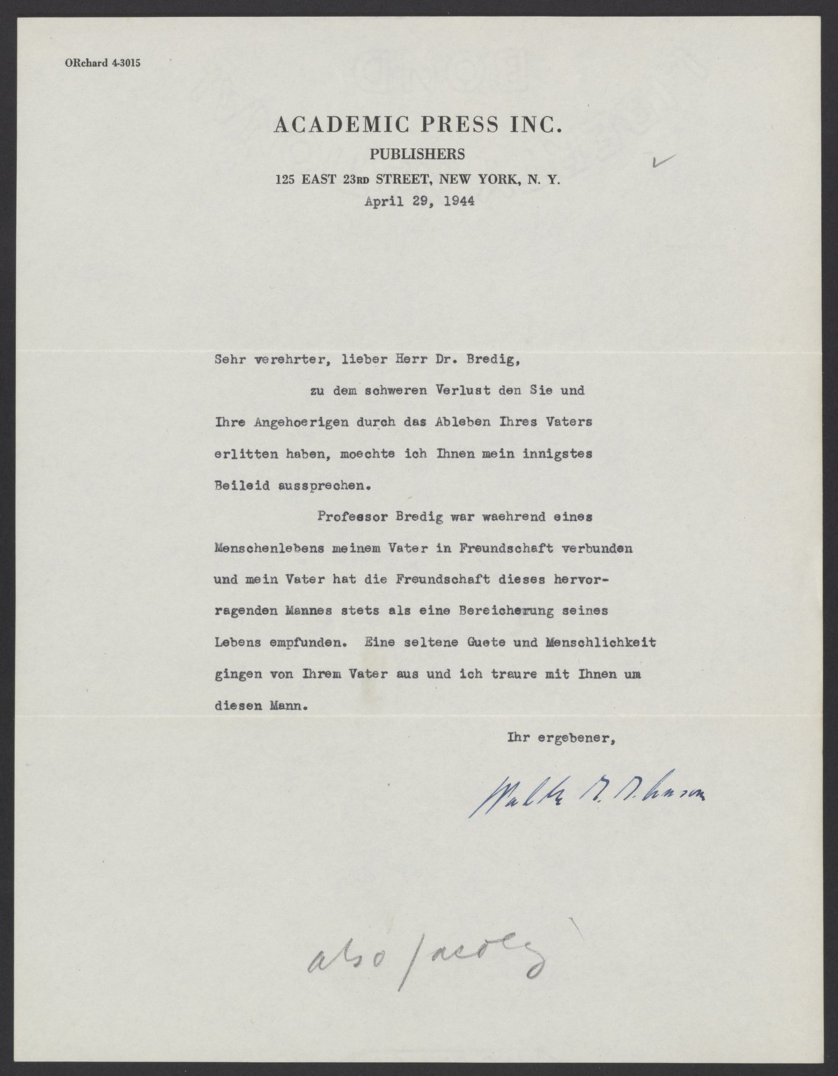 Letter of condolence regarding the death of Georg Bredig (1868-1944) from a colleague or acquaintance working at the Academic Press, Inc., to Max Albert Bredig (1902-1977).