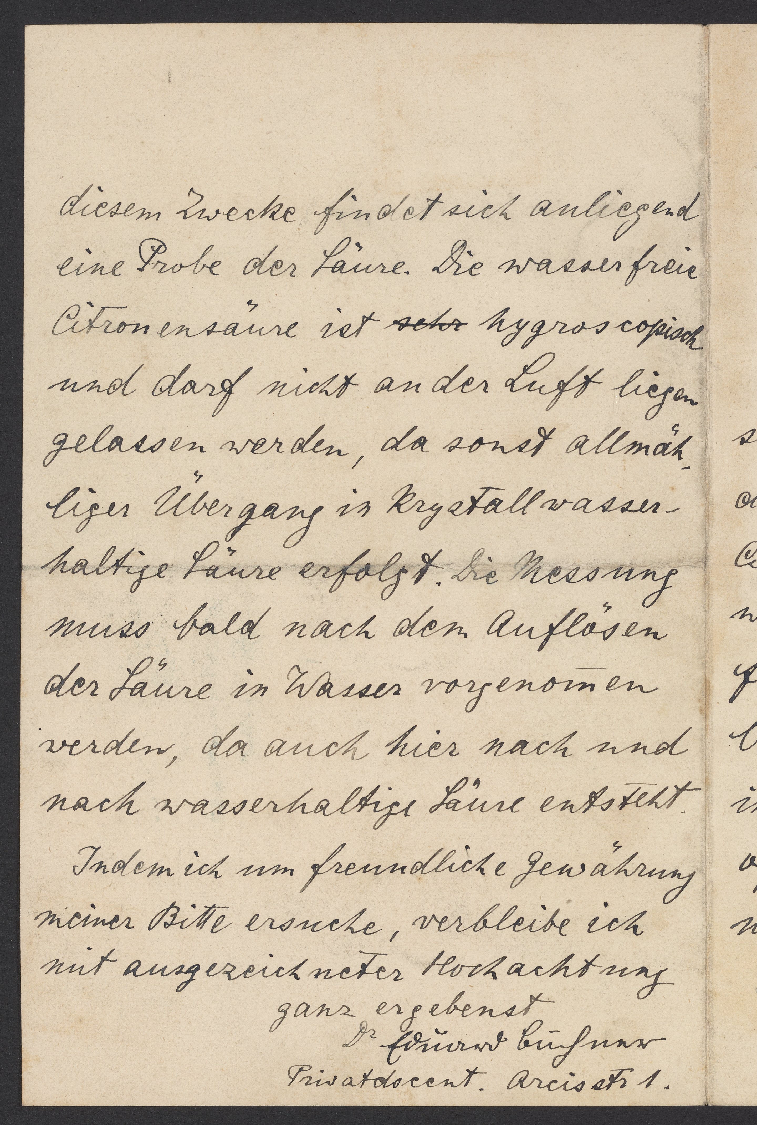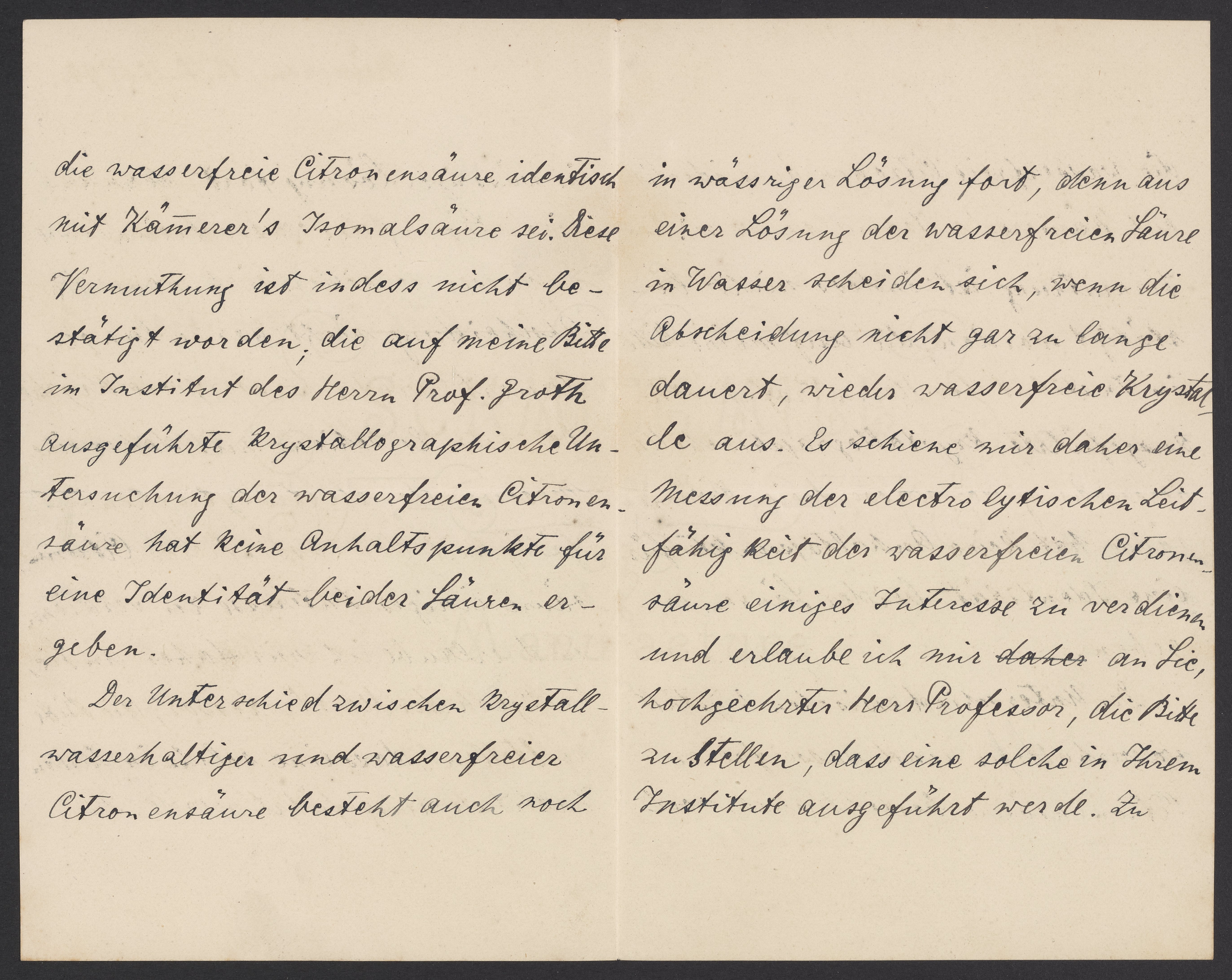 in wässriger Lösung fort, denn aus einer Lösung der wasserfreien Säure in Wasser scheiden sich, wenn die Abscheidung nicht gar zu lange dauert, wieder wasserfreie Krystalle aus. Es schiene mir daher eine Messung der elektrolytischen Leitfähigkeit der wasserfreien Citronensäure einiges Interesse zu verdienen und erlaube ich mir an Sie, hochgeehrter Herr Professor, die Bitte zu stellen, dass eine solche in Ihrem Institute ausgeführt werde.