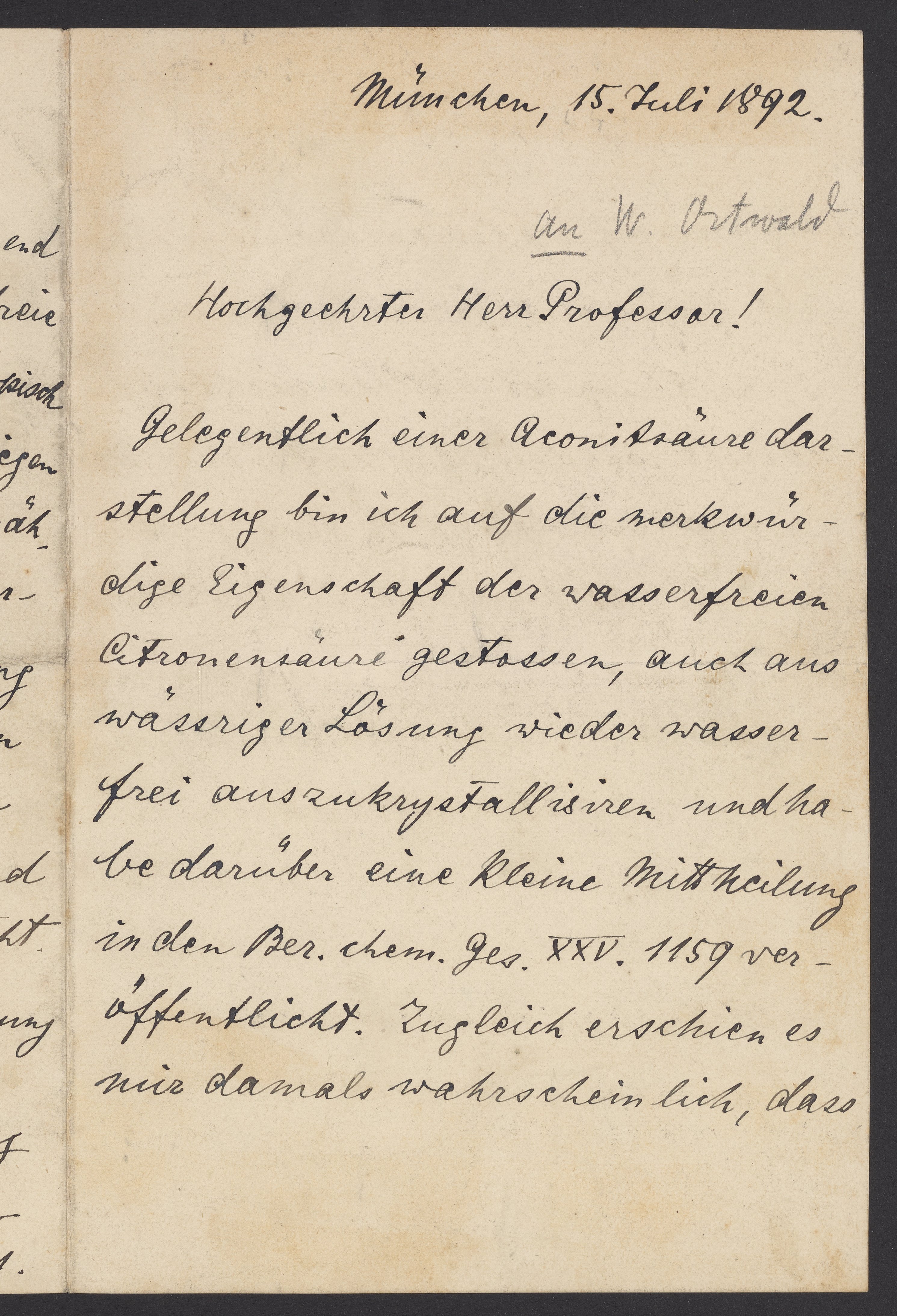 Small JPG1200 x 1760px — 381 KBLarge JPG2880 x 4224px — 1.9 MBFull-sized JPG2982 x 4374px — 2.0 MBOriginal fileTIFF — 2982 x 4374px — 37.4 MBEduard Buchner (1860-1917), a German chemist and zymologist who was awarded the 1907 Nobel Prize in Chemistry for his work on fermentation, informs Wilhelm Ostwald that he has discovered a remarkable property of anhydrous citric acid. As a result, Buchner requests that the electrolytic conductivity of anhydrous citric acid be measured at Ostwald's institute in Leipzig.