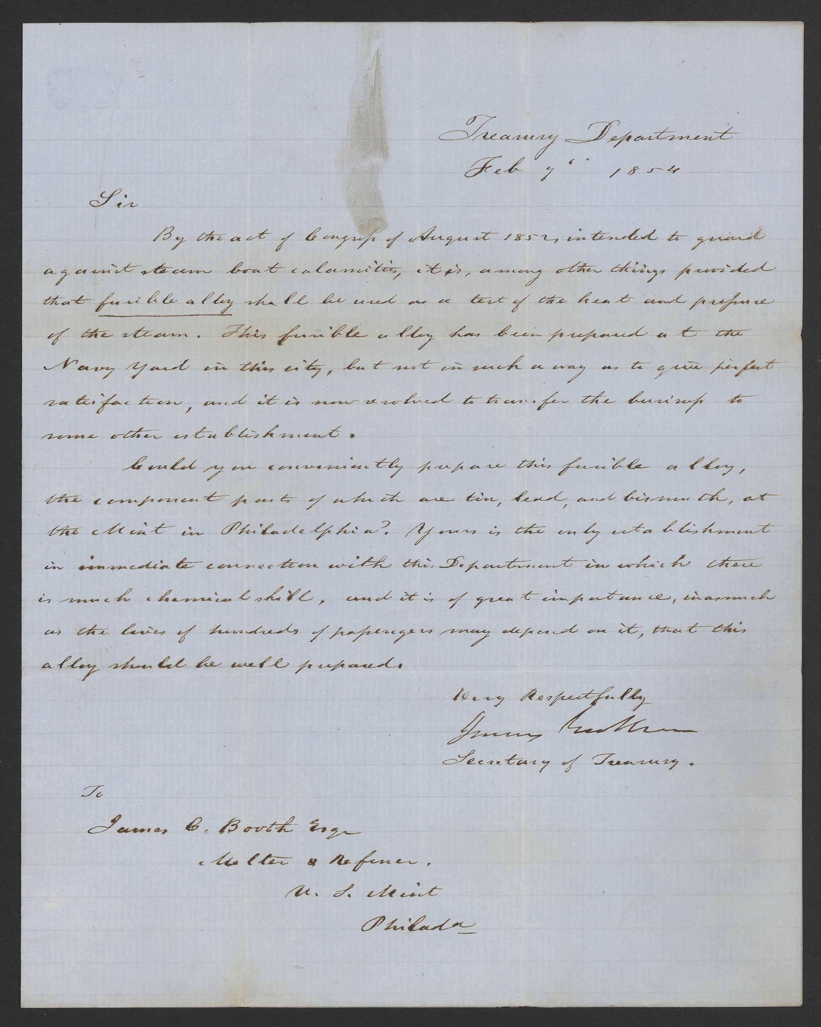 Small JPG1200 x 1501px — 249 KBLarge JPG2880 x 3601px — 1.3 MBFull-sized JPG3322 x 4154px — 1.7 MBOriginal fileTIFF — 3322 x 4154px — 39.5 MBJames B. Guthrie (1792 - 1869), United States Secretary of the Treasury from 1853-1857, requests James Curtis Booth (1810-1888) prepare fusible alloys for use in steamboat safety tests.