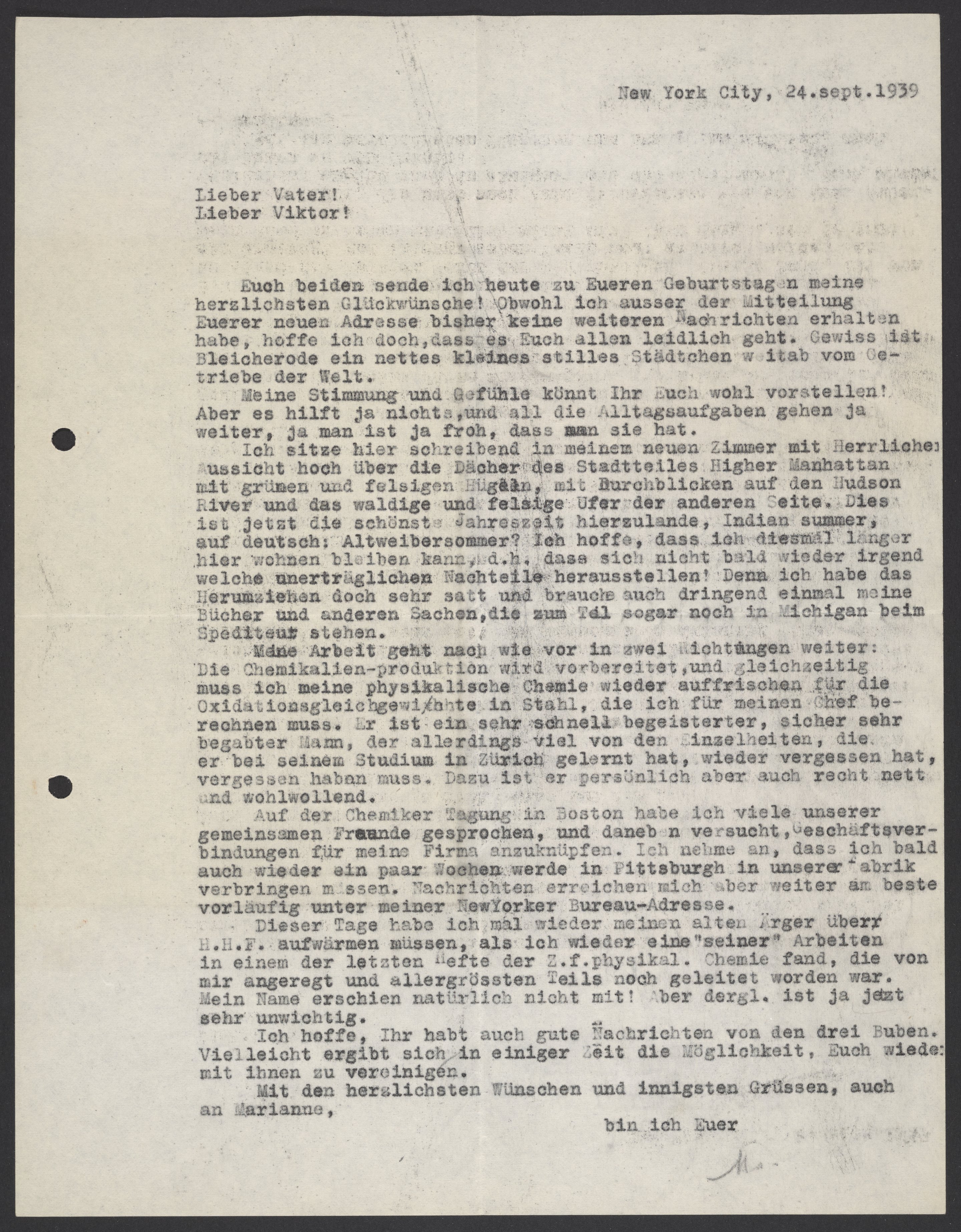 Max Albert Bredig (1902-1977) writes to his father, Georg Bredig (1868-1944), and brother-in-law, Viktor Homburger (1888-1968) about his life in New York City. Max describes where he lives and tells of his work. Max expresses his frustration with his former supervisor, Hans Heinrich Franck (1888-1961), from the Bavarian Nitrogen Works, for not crediting him for his work in one of his latest articles.