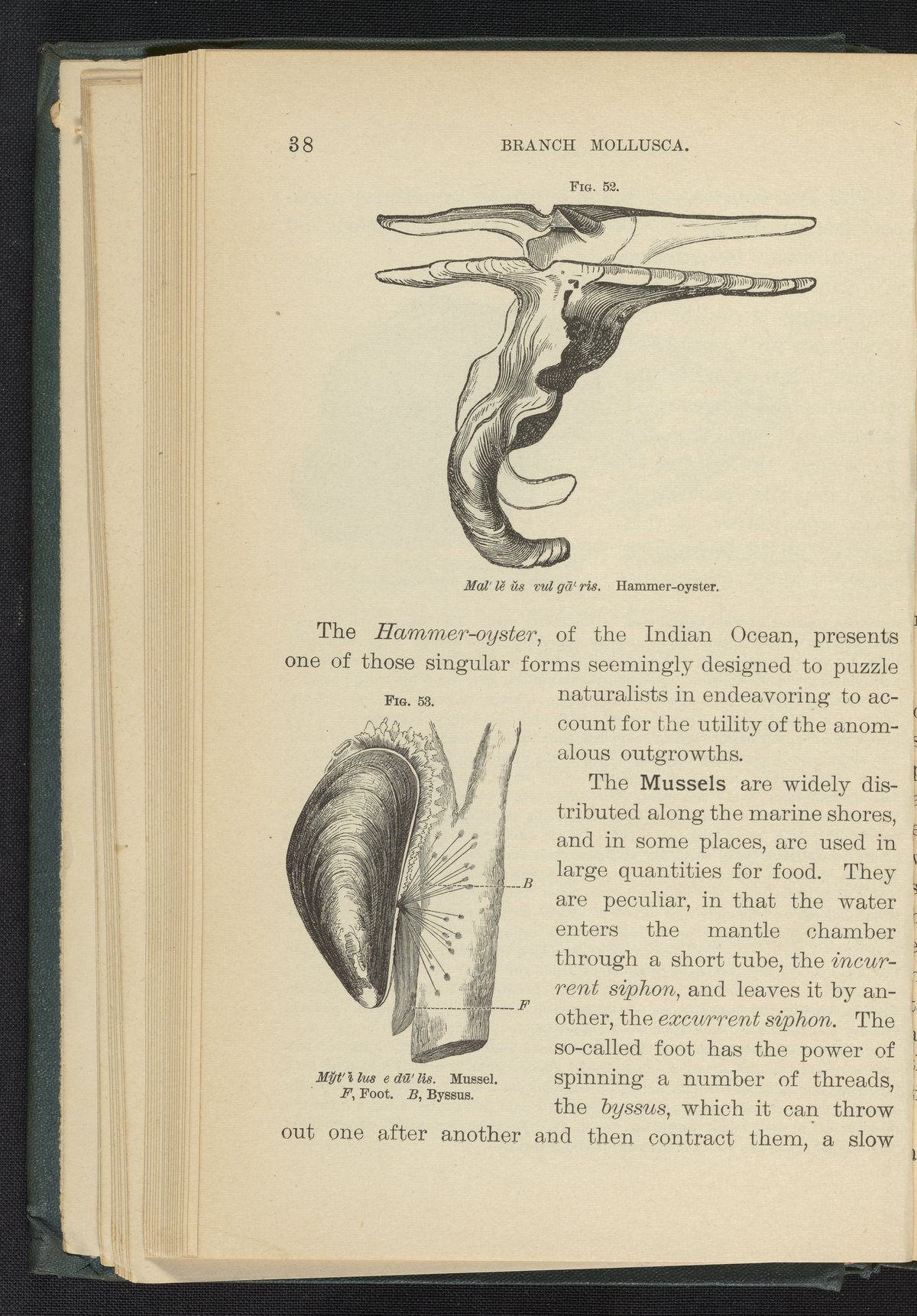Figures 52 and 53 of the 1887 volume Popular Zoology. Figure 52 depicts a hammer-oyster. Figure 53 depicts the foot and byssus of a mussel.