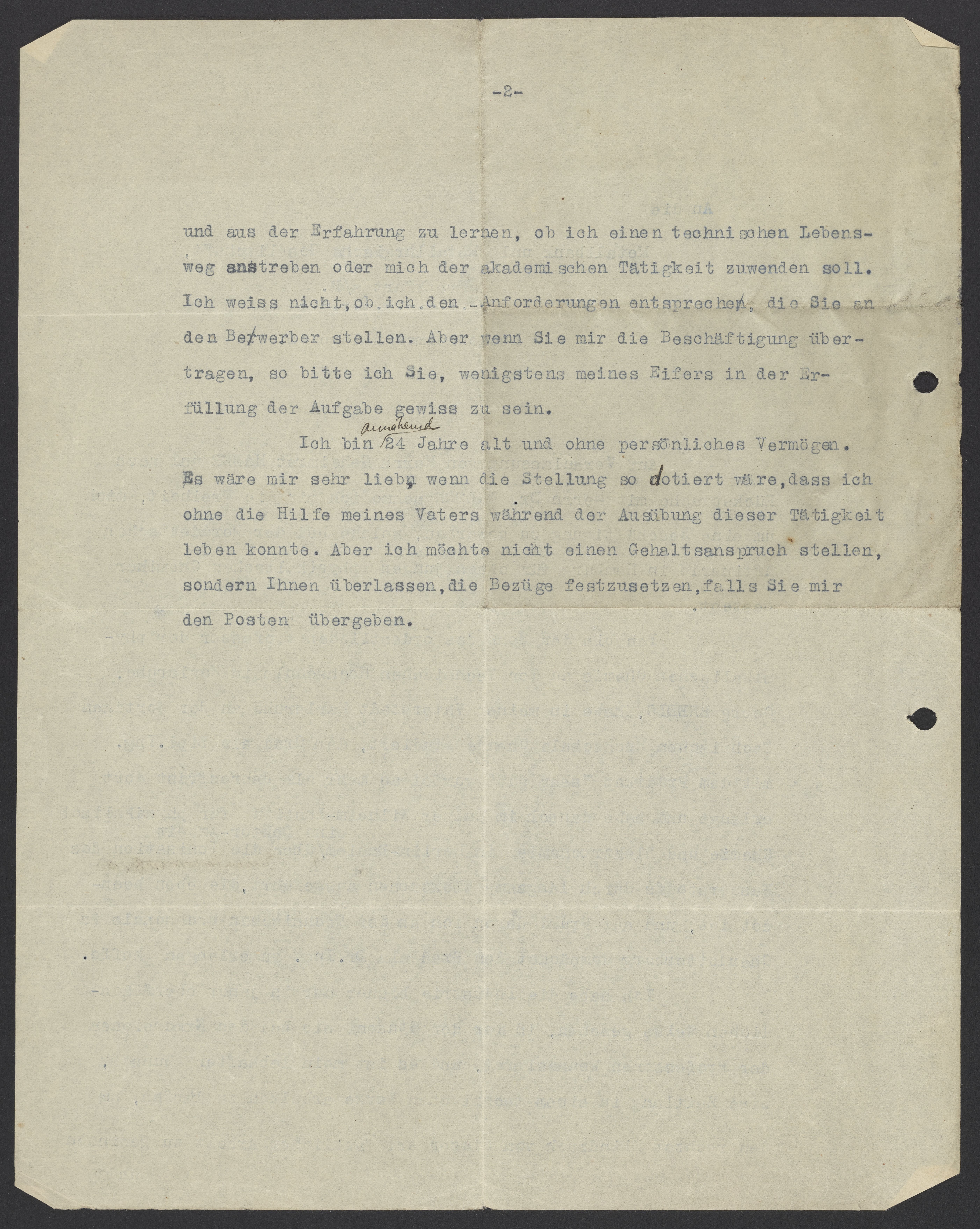 Ich bin annähernd 24 Jahre alt und ohne persönliches Vermögen. Es wäre mir sehr lieb, wenn die Stellung so dotiert wäre, dass ich ohne die Hilfe meines Vaters während der Ausübung dieser Tätigkeit leben konnte. Aber ich möchte nicht einen Gehaltsanspruch stellen, sondern Ihnen überlassen, die Bezüge festzusetzen, falls Sie mir den Posten übergeben.
