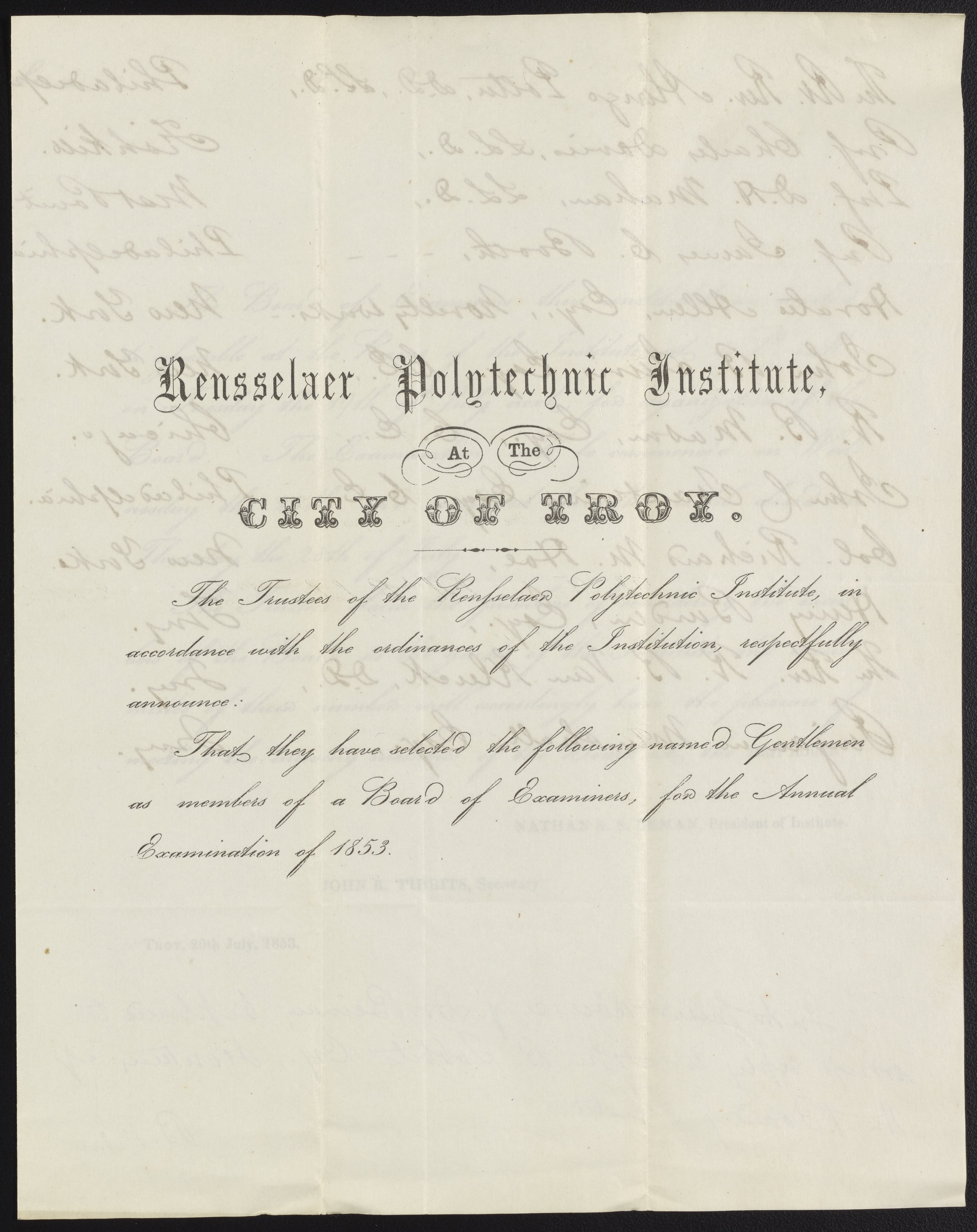 Letter from the Rensselaer Polytechnic Institute to James Curtis Booth