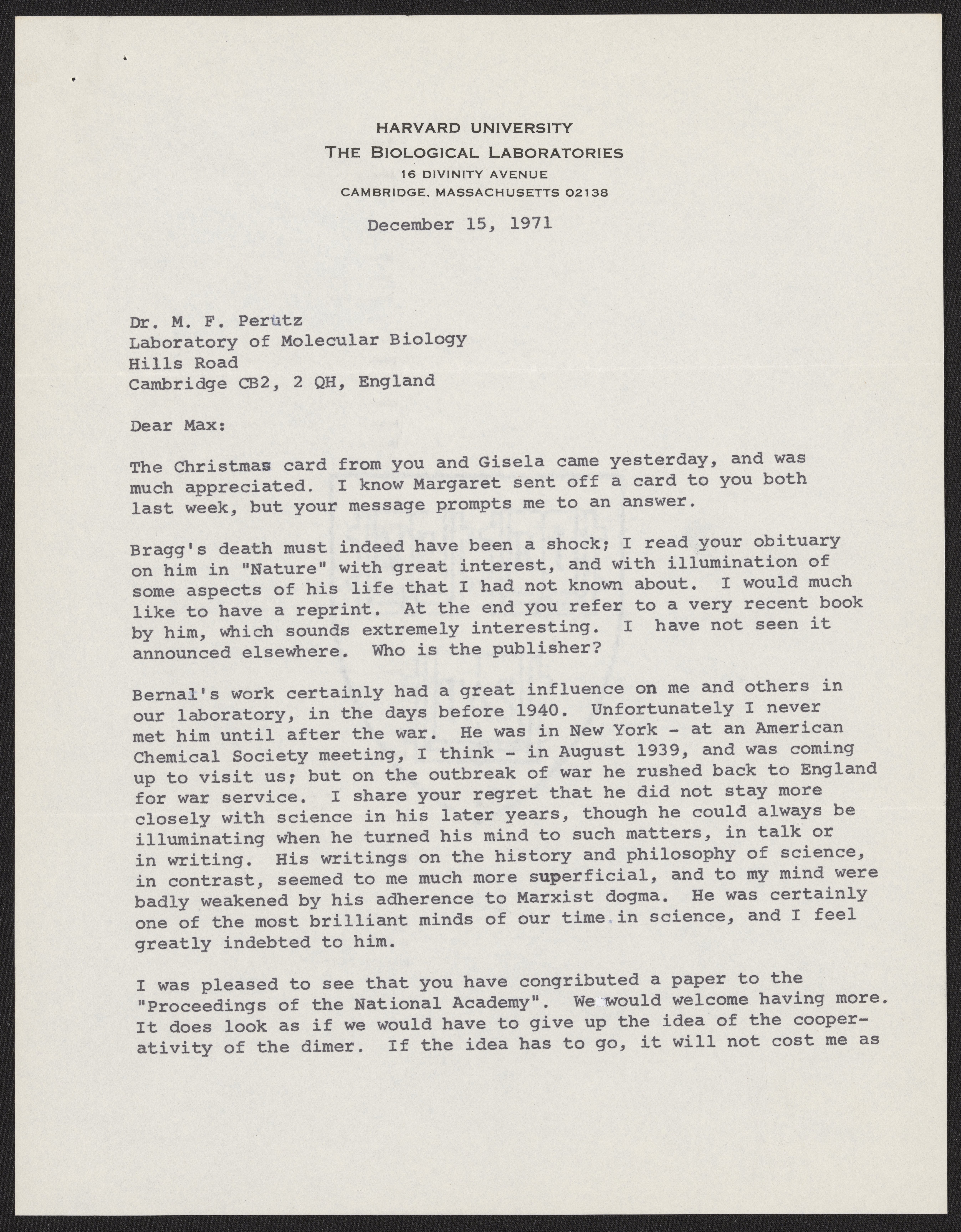 Letter from John T. Edsall to Max Perutz, December 15, 1971