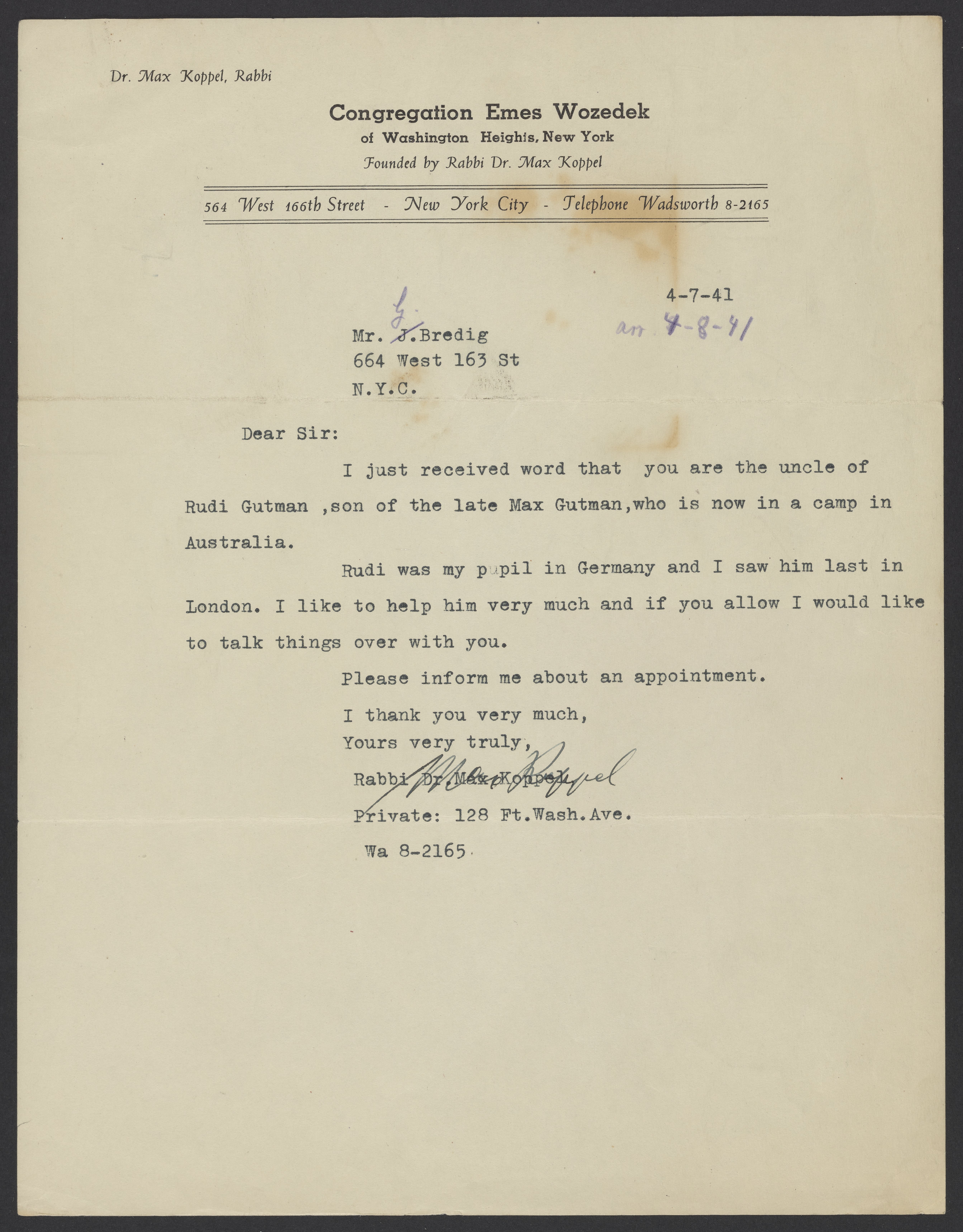 Rabbi Max Koppel (1905-1974) writes to Georg Bredig (1868-1944) about Rudi Gutman. Koppel asks Bredig to contact him to discuss how they can help Gutman leave a concentration camp in Asustralia.
