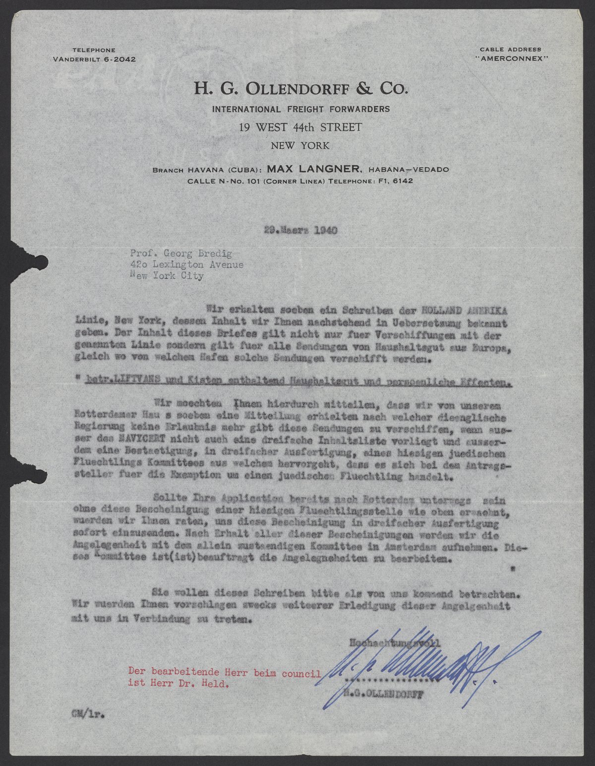 H. G. Ollendorff (1907-1996) informs Georg Bredig (1868-1944) that he must fill out additional paperwork for the transport of his belongings.