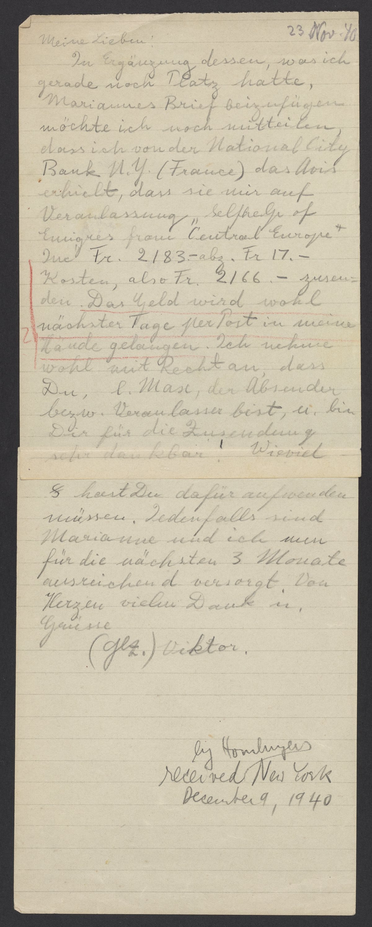 In Ergänzung dessen, was ich gerade noch Platz hatte, Mariannes Brief beizufügen mochte ich noch mitteilen, dass ich von der National City Bank N.Y. (France) das Avis erhielt, dass sie mir auf Veranlassung „Selfhelp of Emigres from Central Europe Inc“ Fr. 2183-abz. Fr 17. – Kosten, also Fr. 2166. – zusenden. Das Geld wird wohl nächster Tage per Post in meine Hände gelangen. Ich nehme wohl mit Recht an, dass Du, e. masse, der Absender bzw. Veranlasser bist, u. bin Dir fuer die Zusendung sehr dankbar! Wieviel $ hast Du dafür aufwenden müssen. Jedenfalls sind Marianne und ich nun für die nächsten 3 Monate ausreichend versorgt. Von Herzen vielen Dank u. Grüsse.