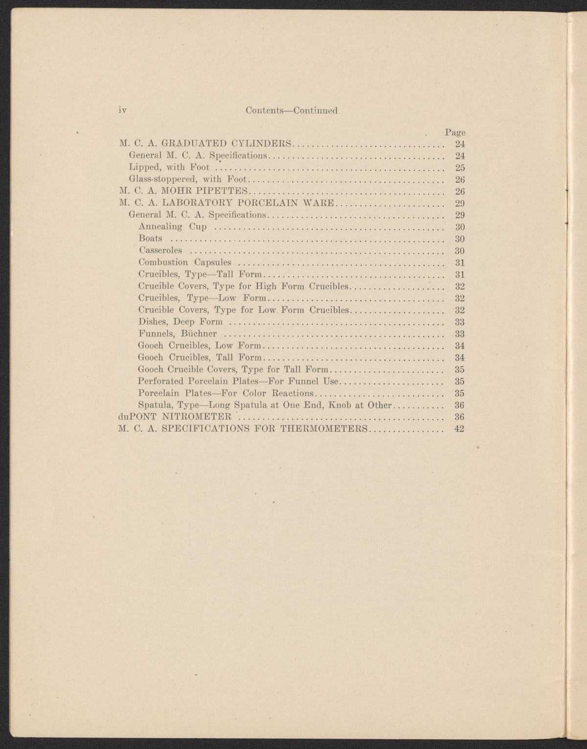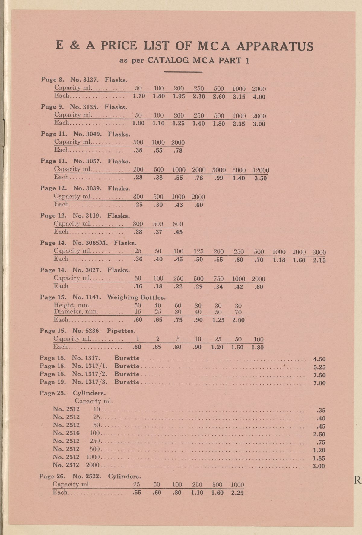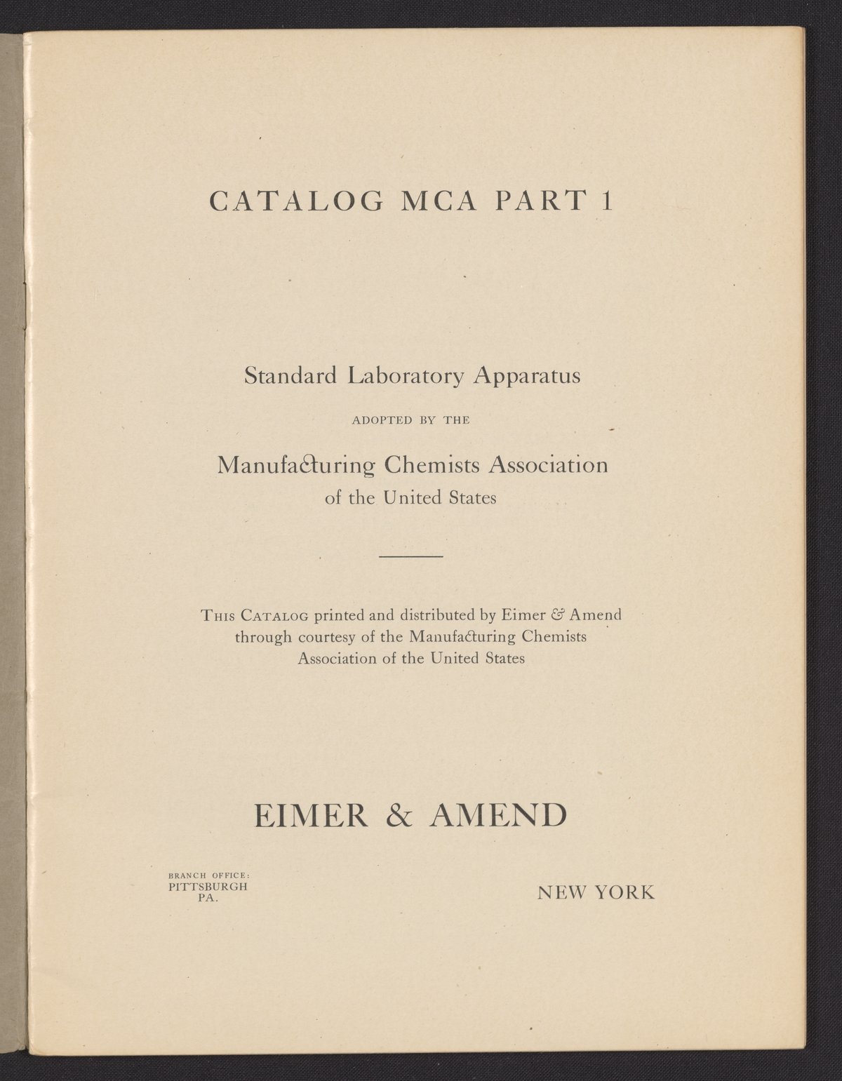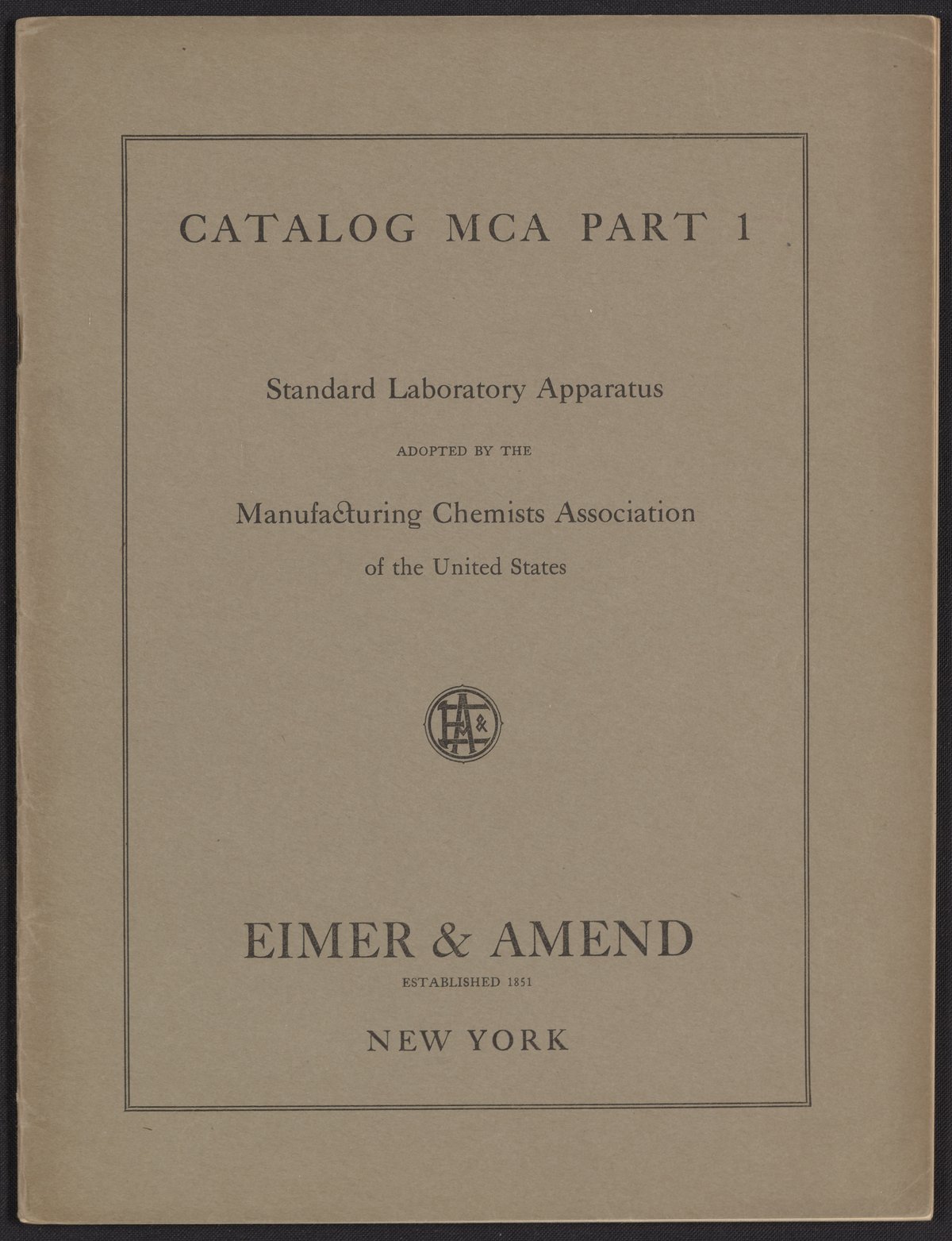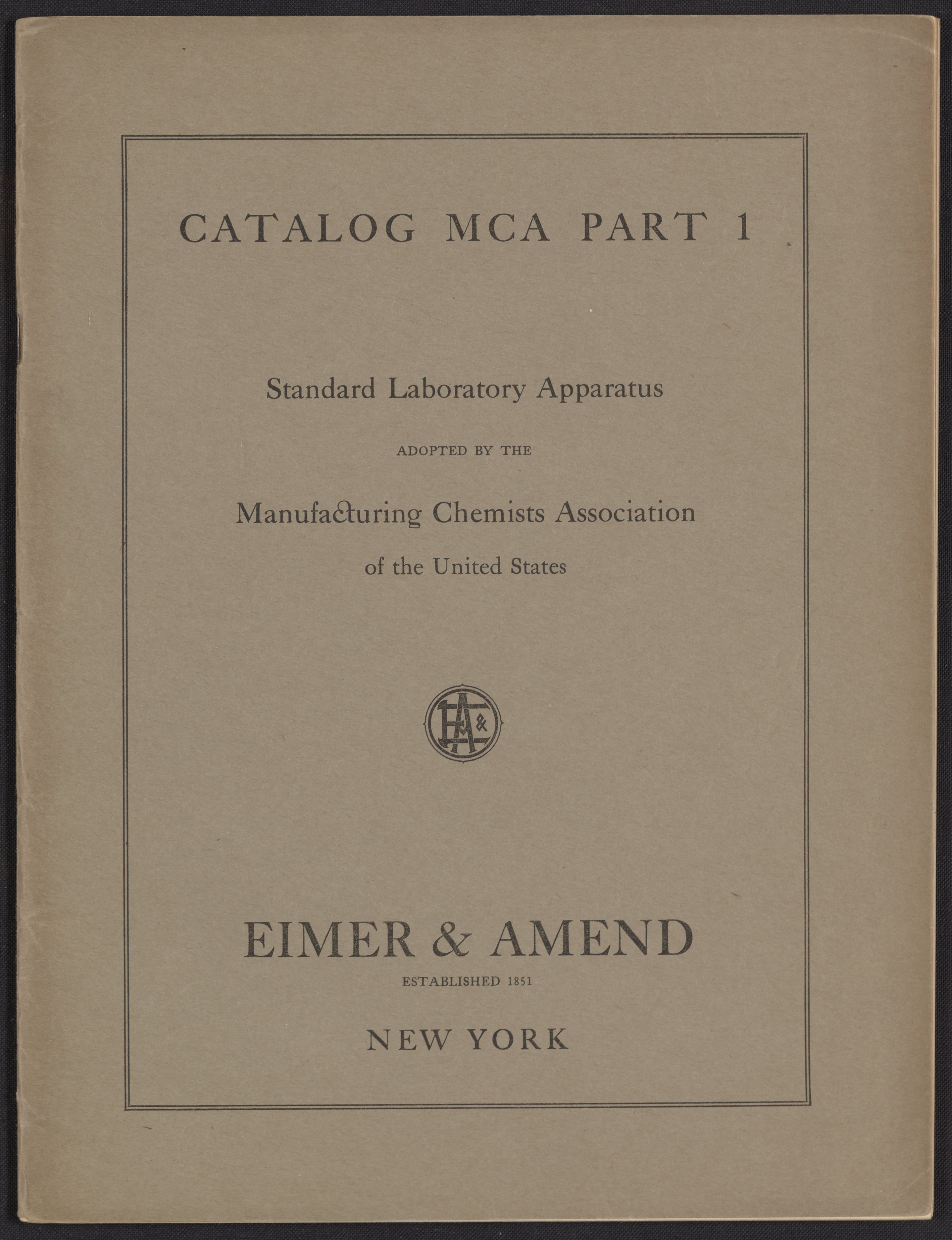 Catalog published by Eimer & Amend in conjunction with the United States Manufacturing Chemists' Association (MCA) which reflects the standardization of apparatus manufactured by American chemical companies. Eimer & Amend, founded in 1851 by Bernard Amend (1821-1911) and Charles Eimer (1823- c. 1885), was an importer and supplier of chemical laboratory supplies. Eimer & Amend was acquired by the Fisher Scientific Company in 1940.
