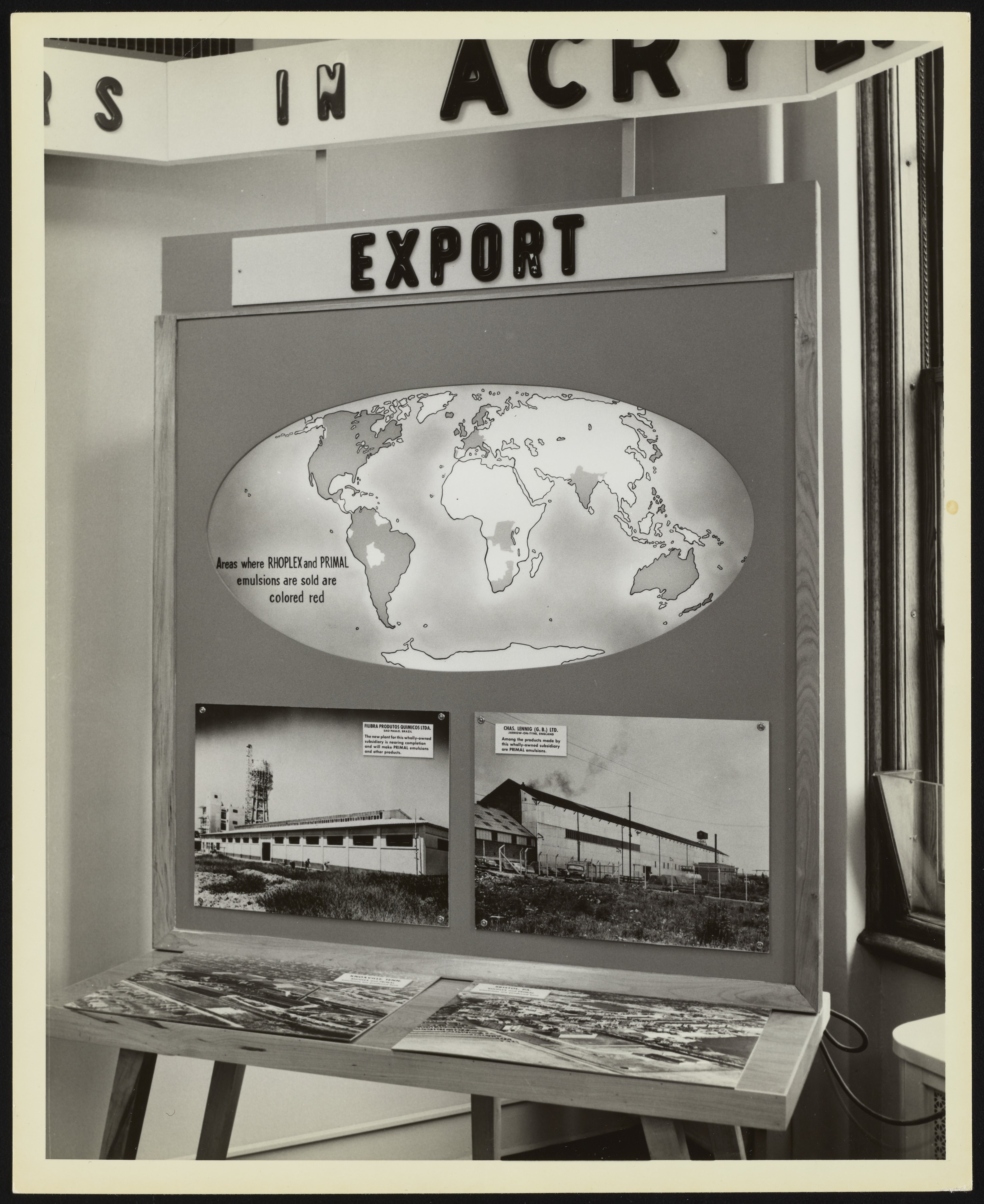 “Rhoplex and Primal Emulsions Exports Exhibit Board,” April 19, 1956. Rohm & Haas Company Archives, Box Photos 20, Folder 28. Science History Institute. Philadelphia. https://digital.sciencehistory.org/works/amf5qdp.