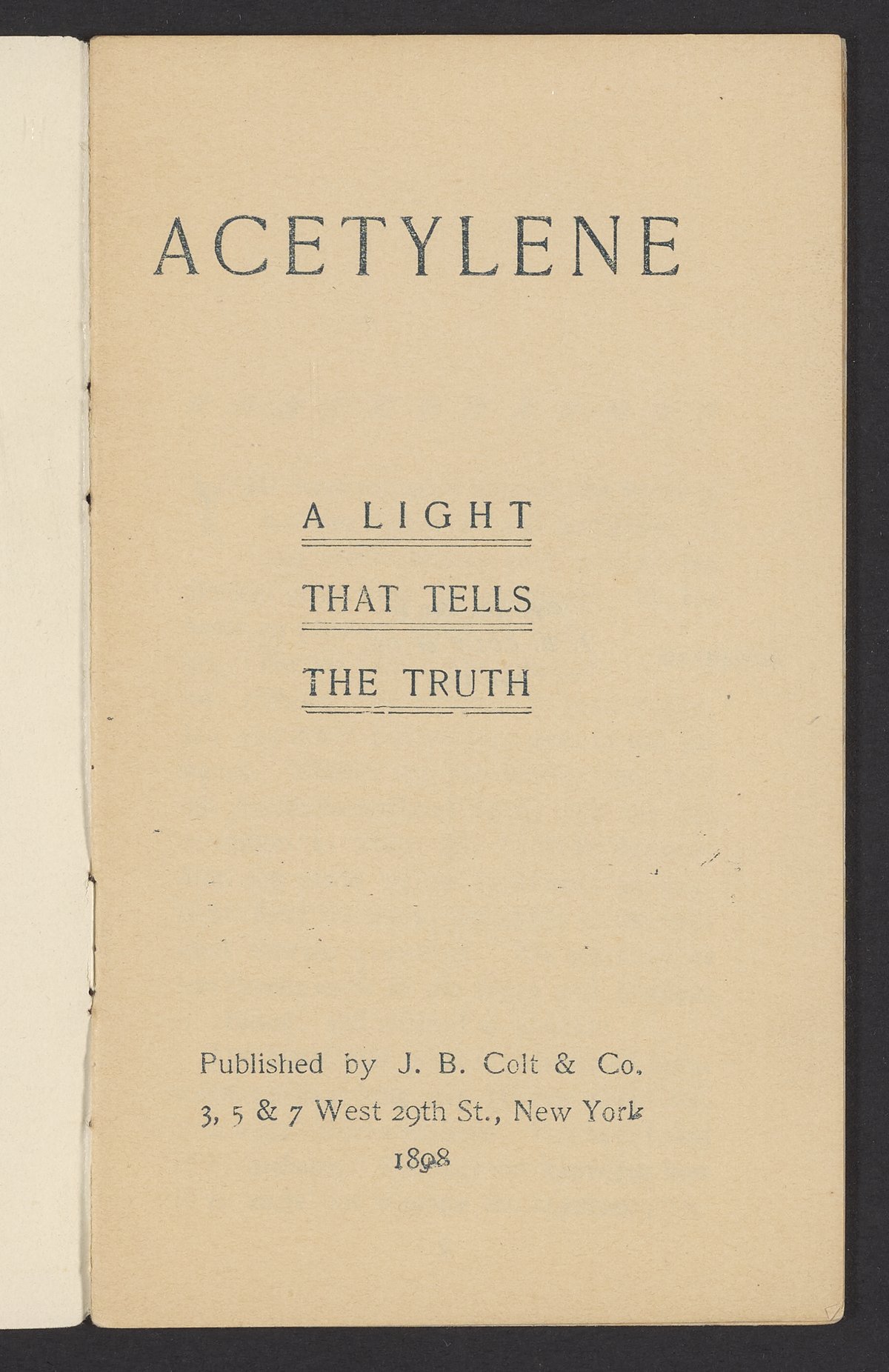 J. B. Colt & Co. “Acetylene : A Light That Tells the Truth.” New York, New York: The Company, 1898. TP767 .J33 1898. Science History Institute. Philadelphia. https://digital.sciencehistory.org/works/ampekys.