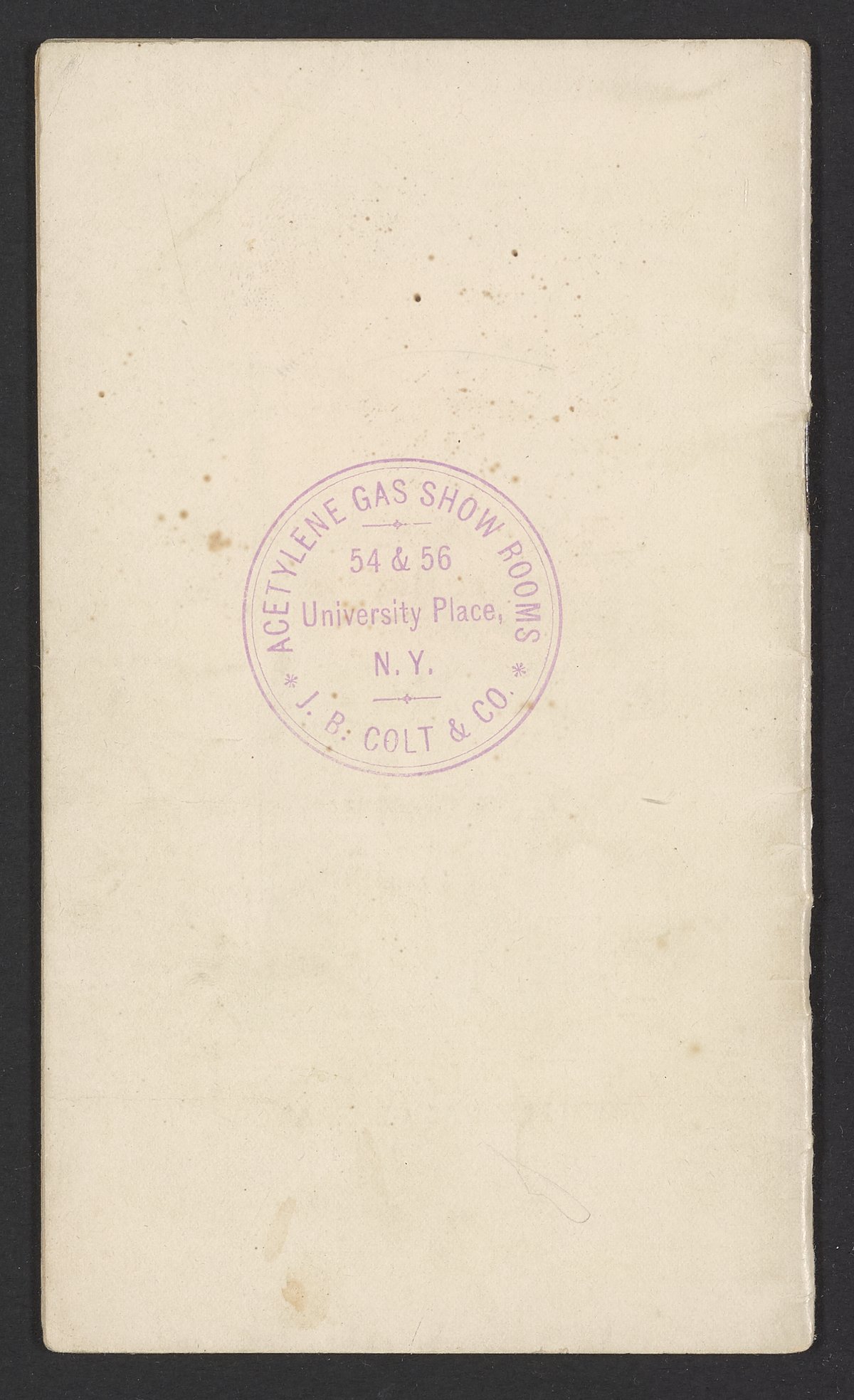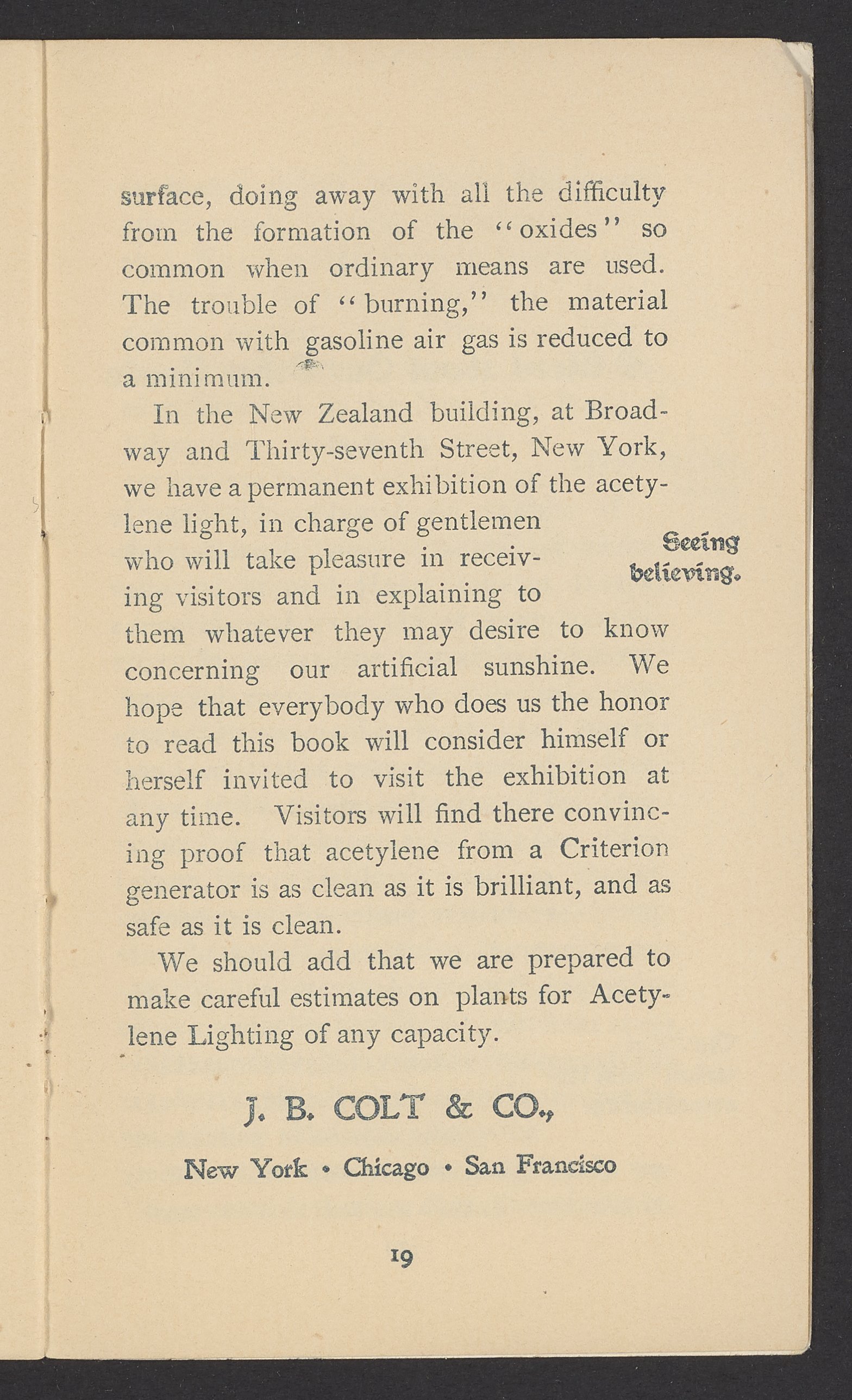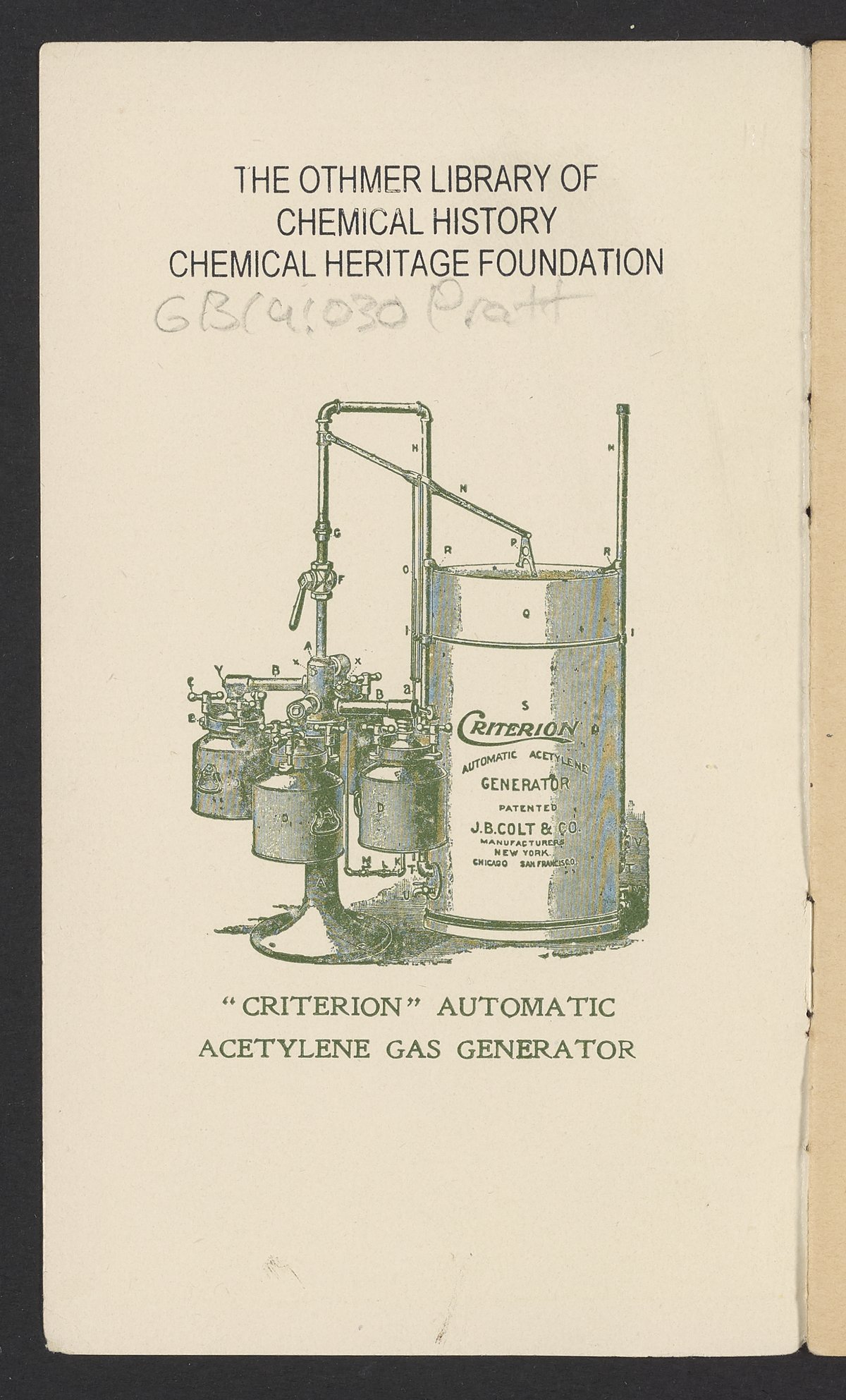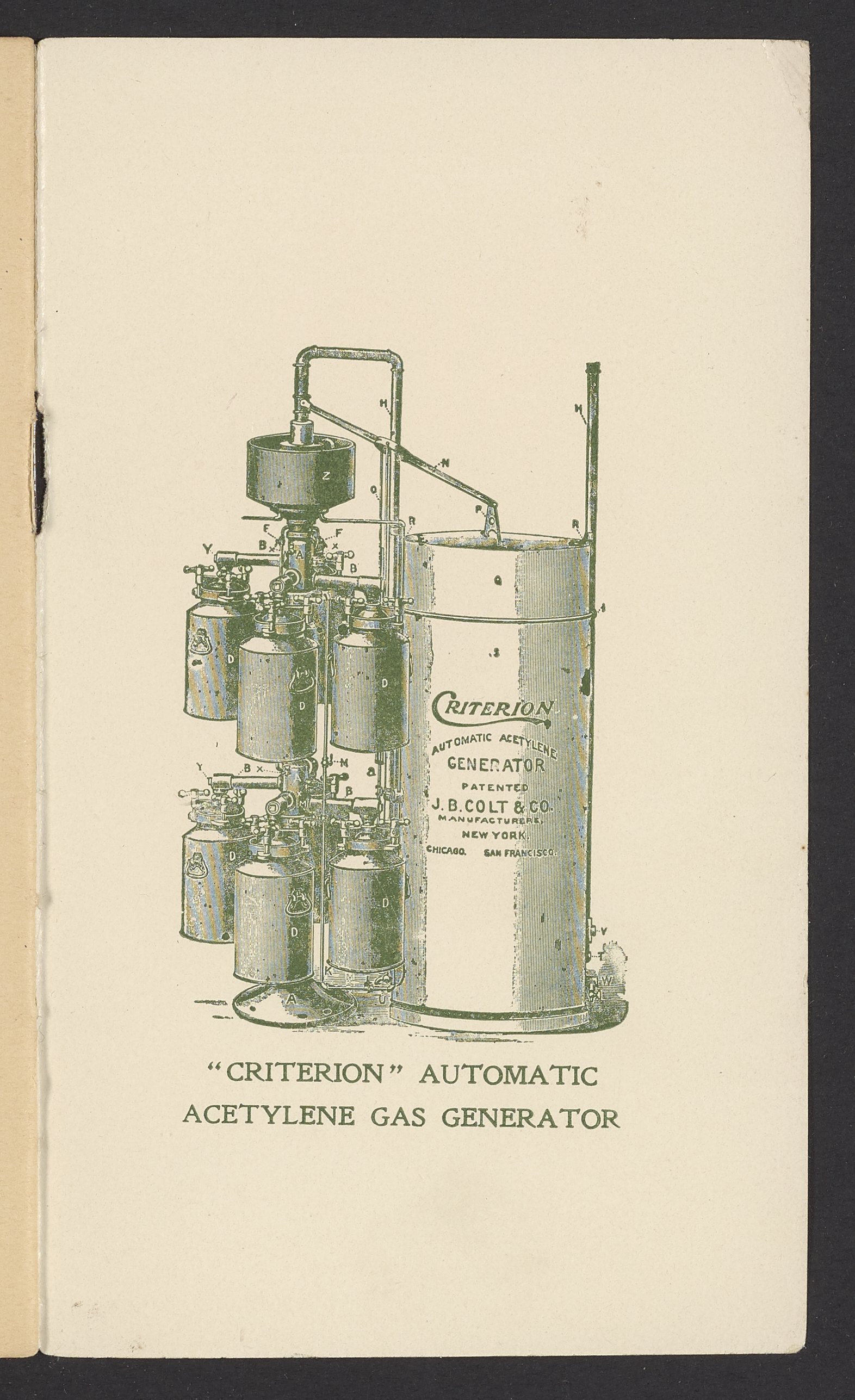 Small JPG1200 x 1970px — 630 KBFull-sized JPG1571 x 2579px — 1.0 MBOriginal fileTIFF — 1571 x 2579px — 11.6 MBPublished by J.B. Colt Company, a New York-based producer of lamps and acetylene products, this small volume is dedicated to marketing the use of acetylene gas in artificial lighting. The work posits the acetylene lamp as the "latest and greatest product of light-science [which] goes a long step beyond electricity." The work includes information about the history and sourcing of acetylene, a description of acetylene's scientific properties, and a listing of the uses and applications of acetylene lamps. The work concludes with a brief section about other products offered by J.B. Colt & Company and an illustration of the "Criterion" Automatic Acetylene Gas Generator.