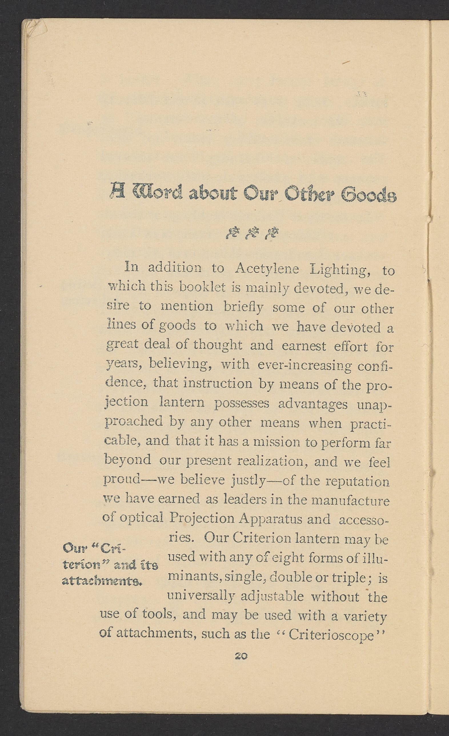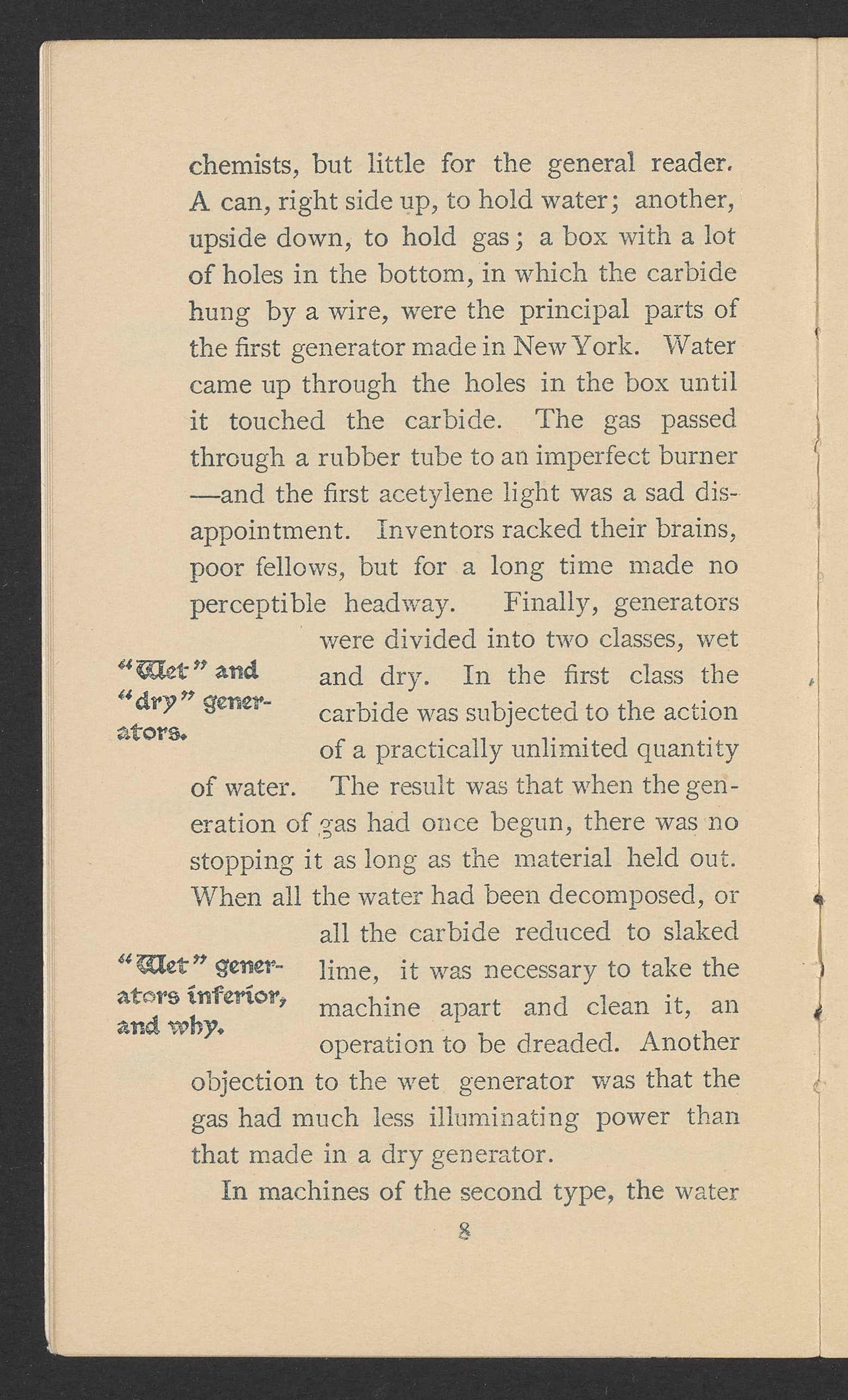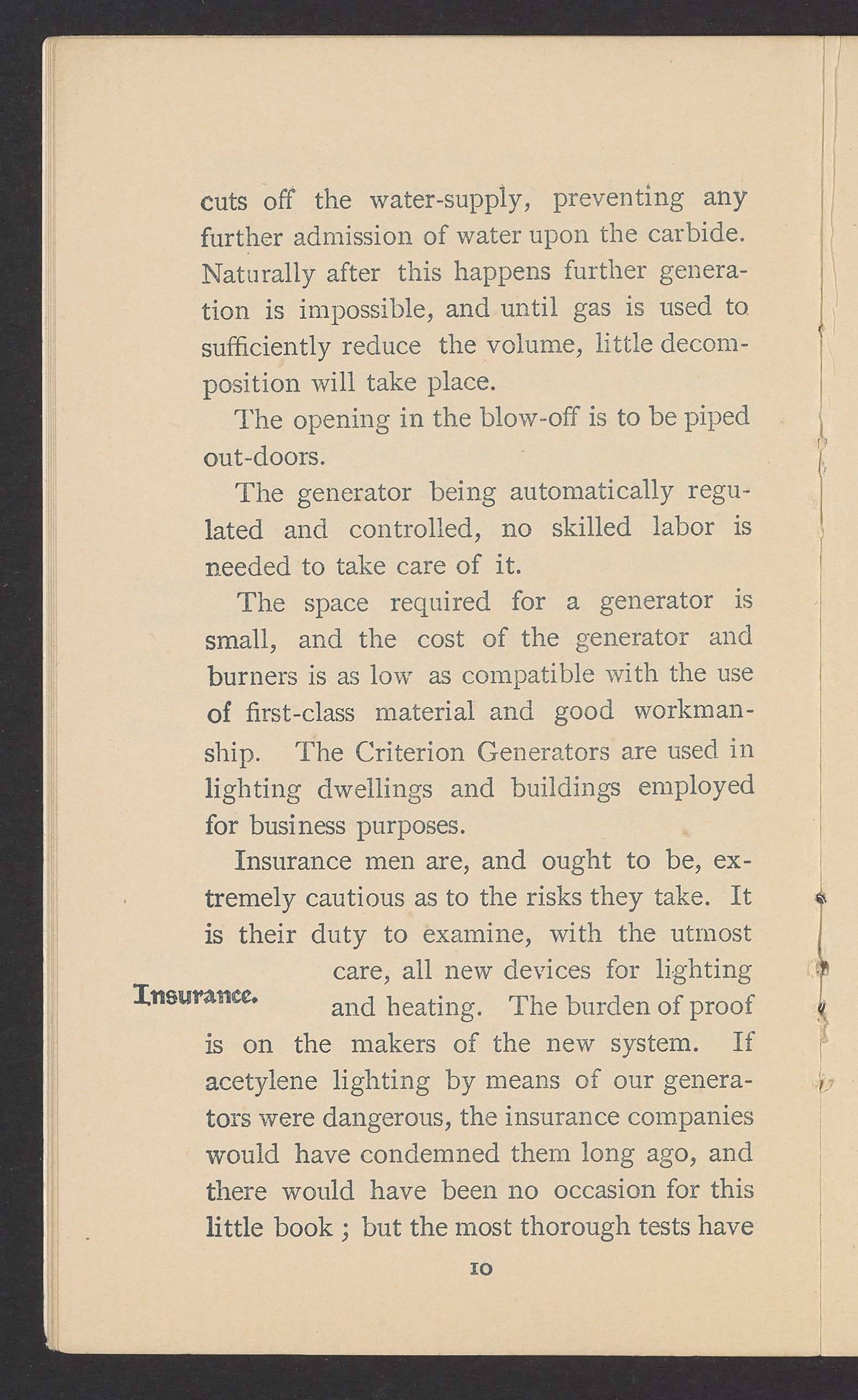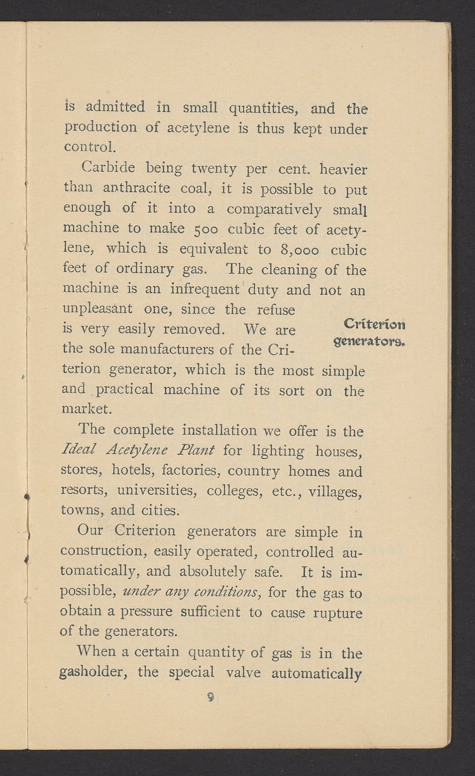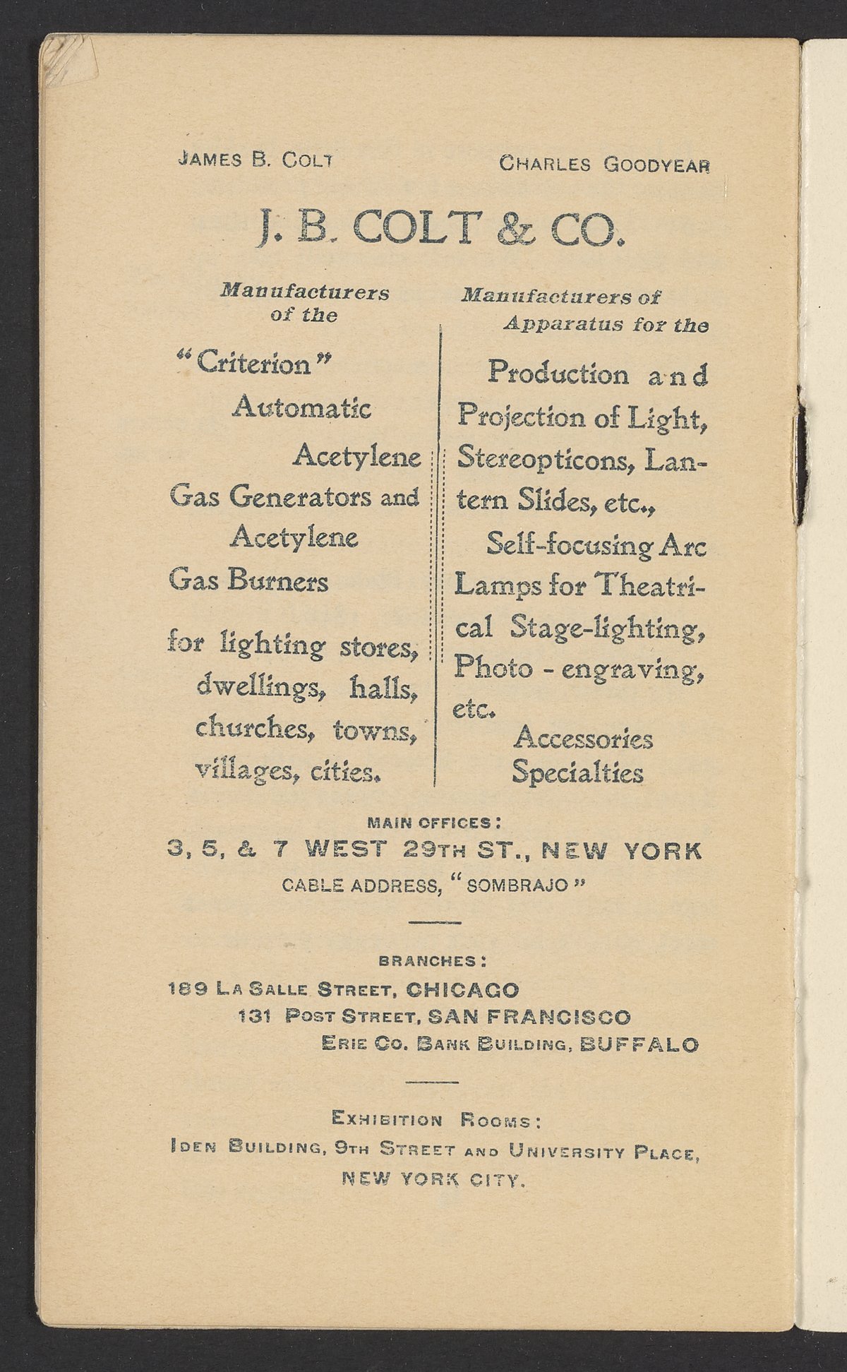 Small JPG1200 x 1970px — 630 KBFull-sized JPG1571 x 2579px — 1.0 MBOriginal fileTIFF — 1571 x 2579px — 11.6 MBPublished by J.B. Colt Company, a New York-based producer of lamps and acetylene products, this small volume is dedicated to marketing the use of acetylene gas in artificial lighting. The work posits the acetylene lamp as the "latest and greatest product of light-science [which] goes a long step beyond electricity." The work includes information about the history and sourcing of acetylene, a description of acetylene's scientific properties, and a listing of the uses and applications of acetylene lamps. The work concludes with a brief section about other products offered by J.B. Colt & Company and an illustration of the "Criterion" Automatic Acetylene Gas Generator.