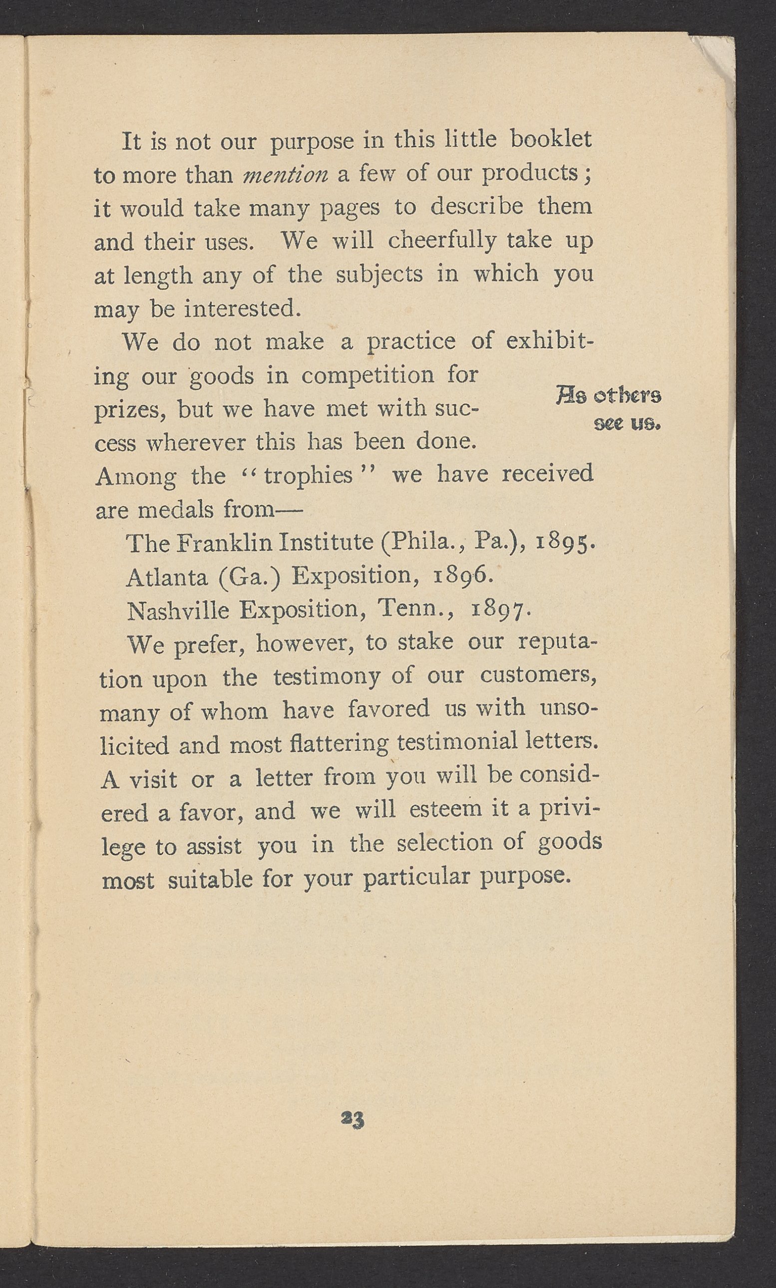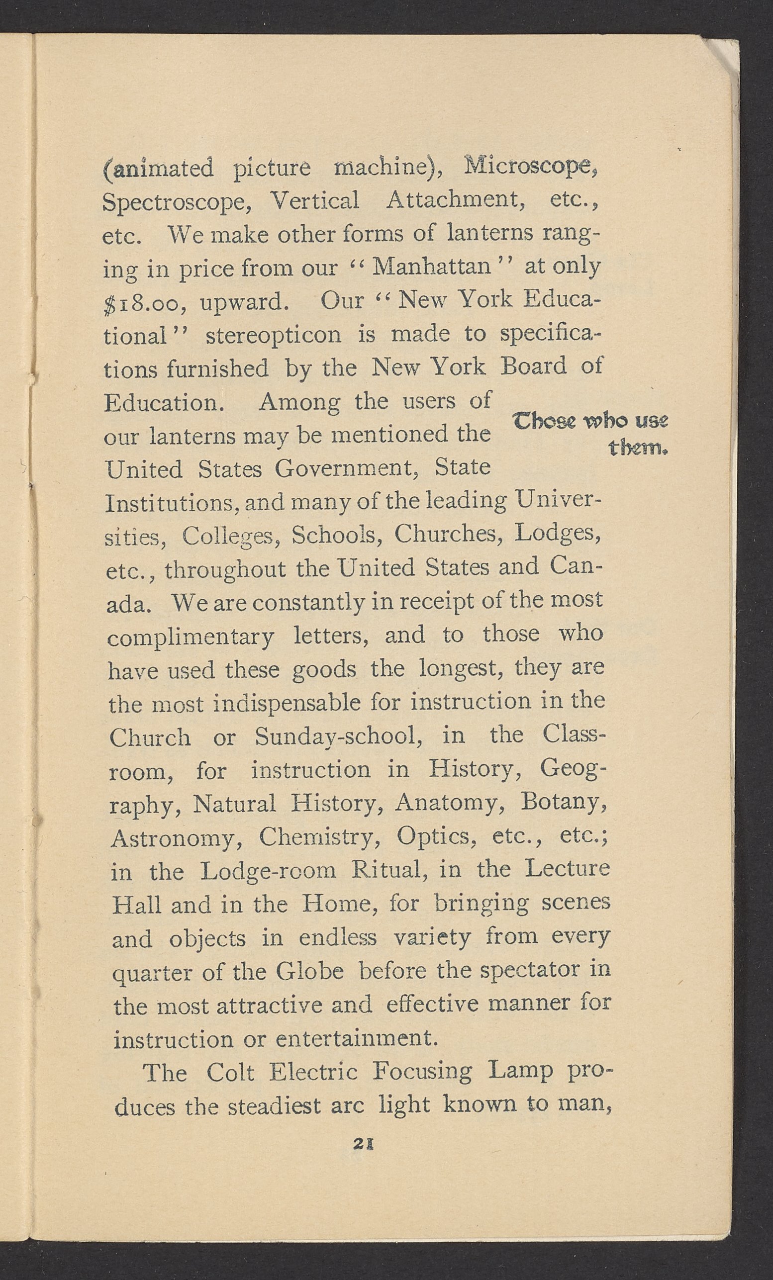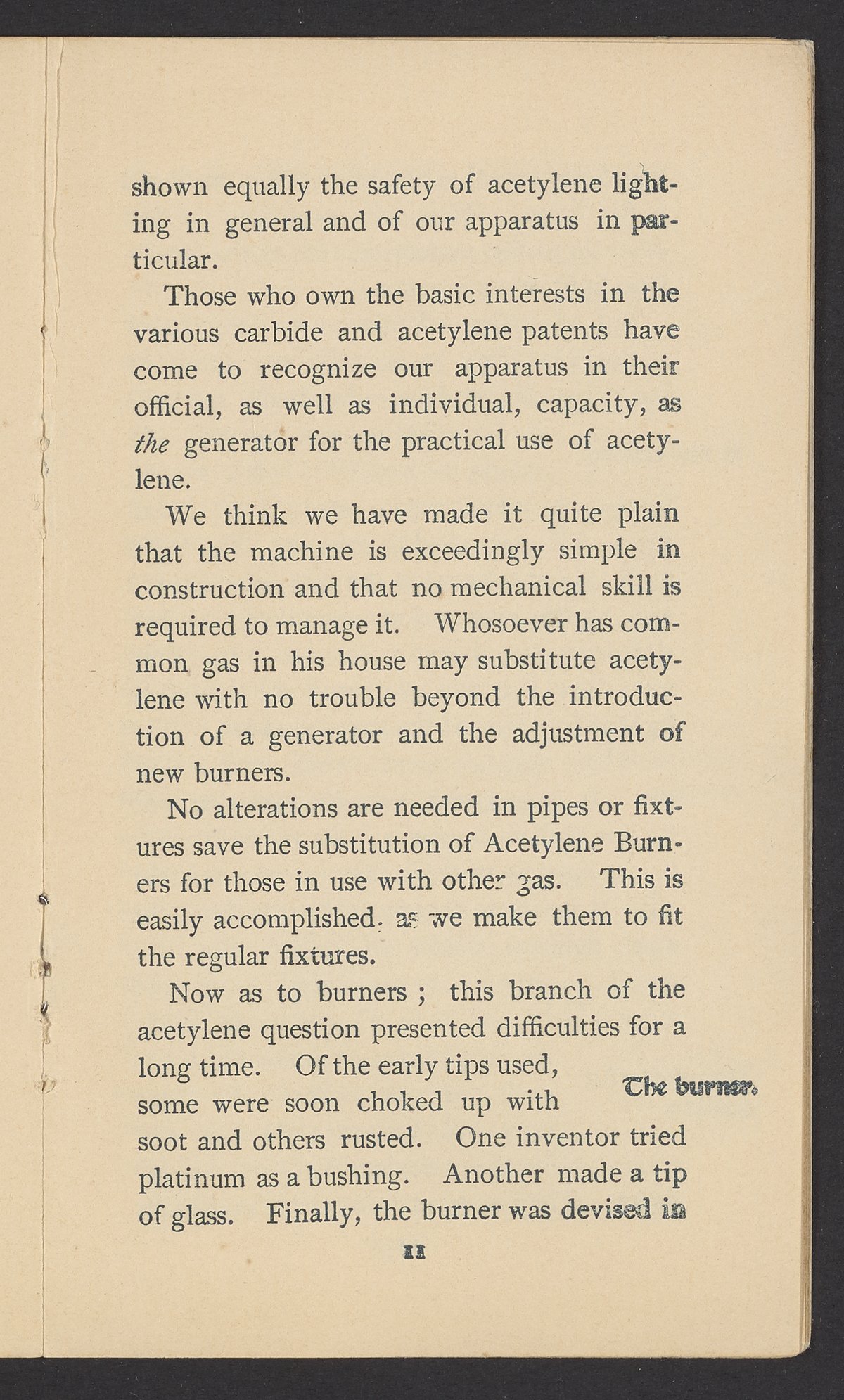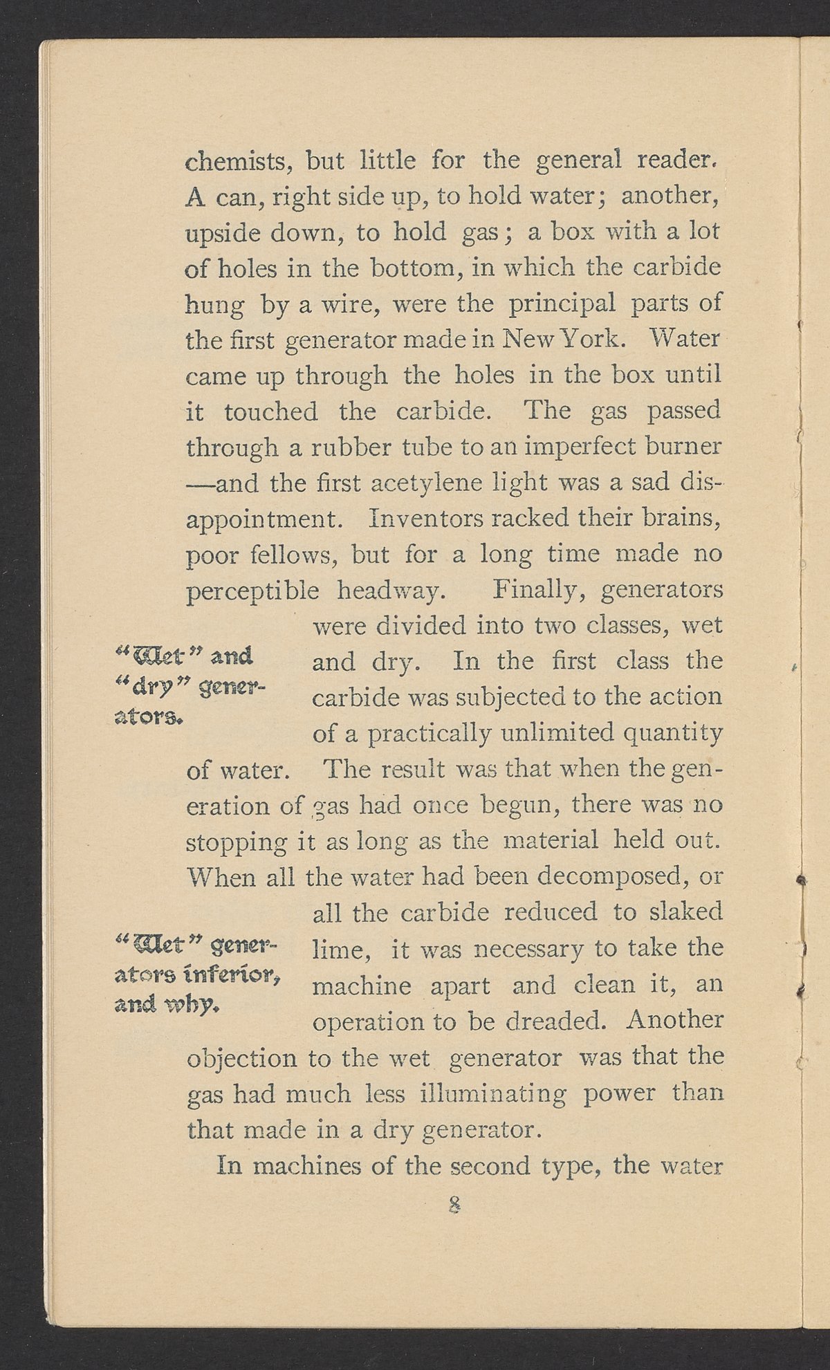 Small JPG1200 x 1970px — 630 KBFull-sized JPG1571 x 2579px — 1.0 MBOriginal fileTIFF — 1571 x 2579px — 11.6 MBPublished by J.B. Colt Company, a New York-based producer of lamps and acetylene products, this small volume is dedicated to marketing the use of acetylene gas in artificial lighting. The work posits the acetylene lamp as the "latest and greatest product of light-science [which] goes a long step beyond electricity." The work includes information about the history and sourcing of acetylene, a description of acetylene's scientific properties, and a listing of the uses and applications of acetylene lamps. The work concludes with a brief section about other products offered by J.B. Colt & Company and an illustration of the "Criterion" Automatic Acetylene Gas Generator.